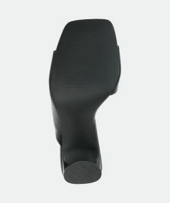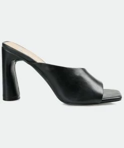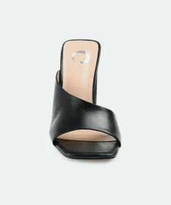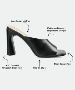 Dress it up or dress it down; the Dola by Journee Collection goes with everything. This simply chic style features a padded footbed and soft vegan leather for all-day comfort. A crescent heel and an asymmetrical strap perfect this modern look.Heel Height:3 1/2-inchHeel Type: Block Heel Platform Height:Flat-inchShoe Width: MediumClosure Type: Slip-onStrap Type: Toe StrapToe Style: OpenLining: Faux LeatherUpper Material: Vegan LeatherOutersole Material: Man-madeFootbed: PaddedAll measurements are approximate and were taken using a size 6. Please note measurements may vary slightly by size.