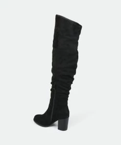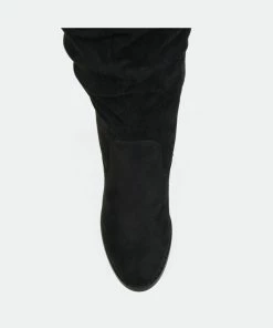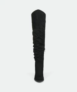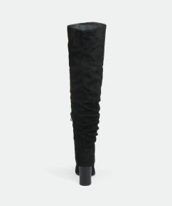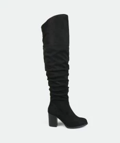 The ruched over-the-knee boots by Journee Collection is constructed with soft faux suede uppers that rise over the knees with raised vamps that create stylish detail. A rounded toe and stacked chunky high-heels finish the designHeel Height: 3-inch. Heel Type: Stacked. Platform Height: Flat-inch. Shaft Height: 24 inches. Calf Circumference: 16 inches. Top Circumference: 19 1/4 inches. Shoe Width: Medium. Closure Type: Inside Zip. Toe Style: Round. Lining: Fabric. Upper Material: Faux Suede. Outersole Material: Man-made. Footbed: Padded. All measurements are approximate and were taken using a size 6. Please note measurements may vary slightly by size.