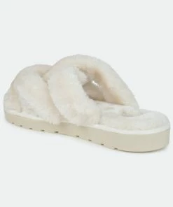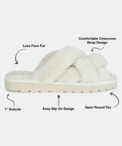 Make mornings at home a little cozier in the Quiet slippers by Journee Collection. This open toe slide is topped with crisscross straps made with plush faux fur. A durable outsole lined with a cushioned footbed finishes the look for a supportive fit.Heel Height: 1-inch. Heel Type: Sole. Platform Height: 1-inch. Shoe Width: Medium. Closure Type: Slip-on. Strap Type: Multi -Strap. Toe Style: Open. Lining: Faux Fur. Upper Material: Faux Fur. Outersole Material: Man-made. Footbed: Comfort. All measurements are approximate and were taken using a size 6. Please note measurements may vary slightly by size.
