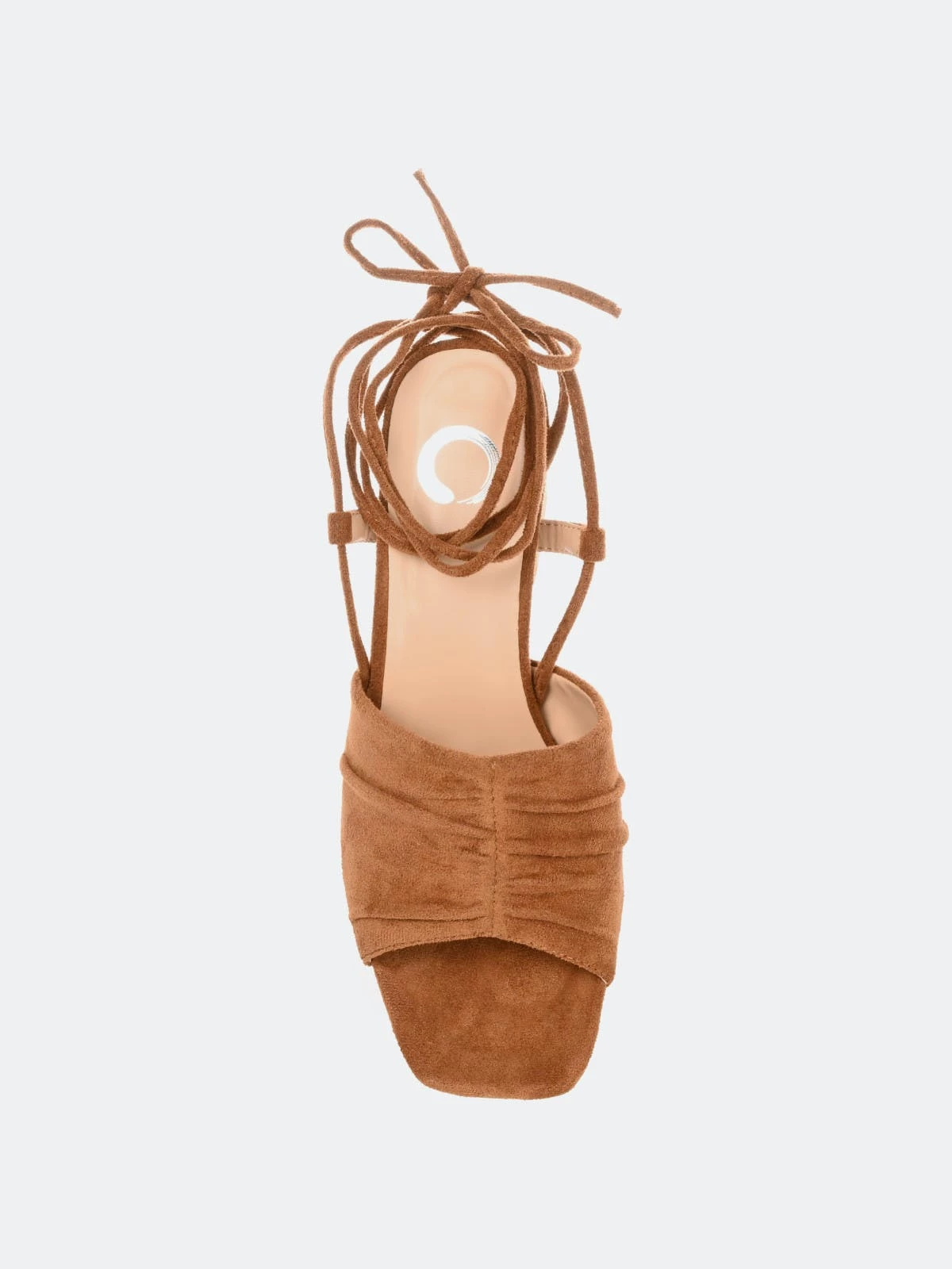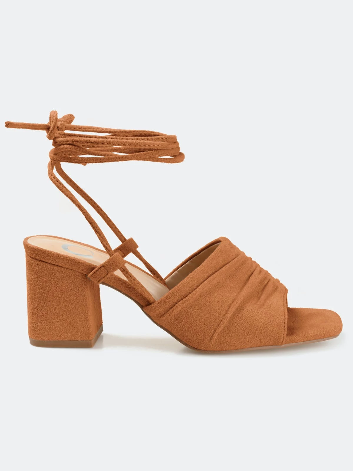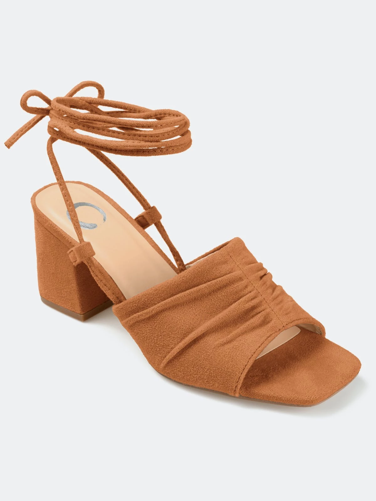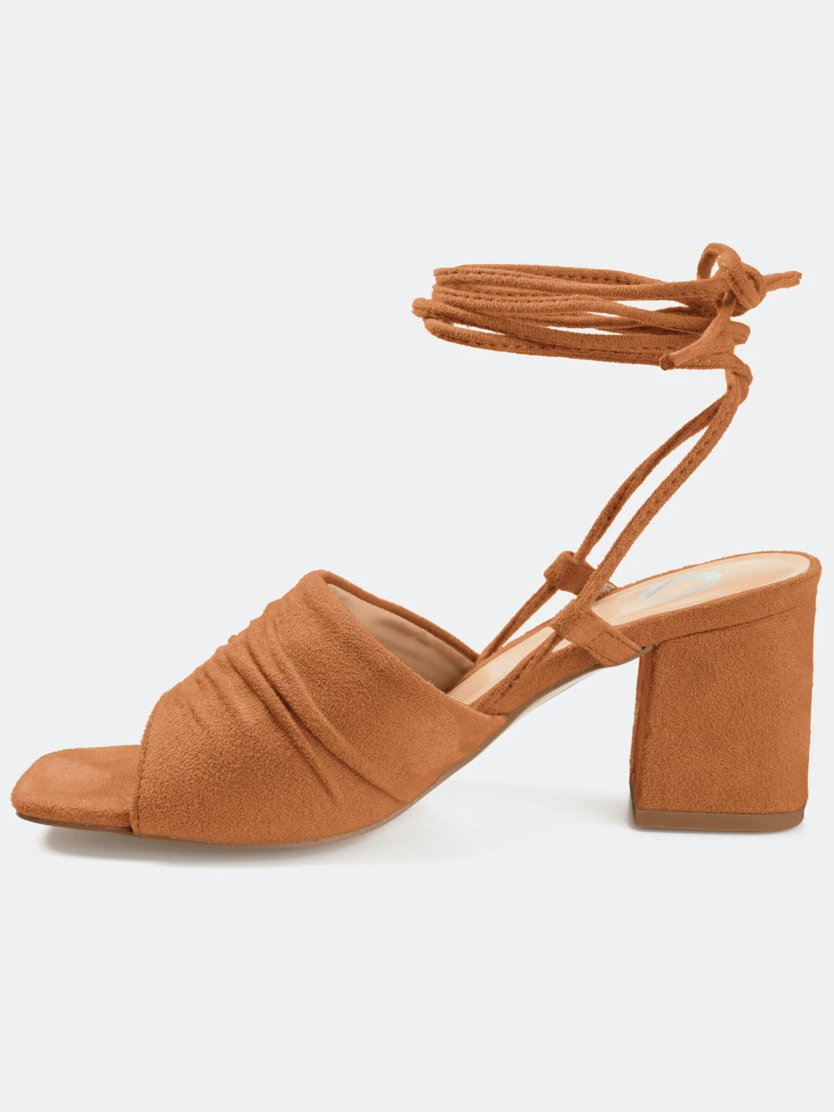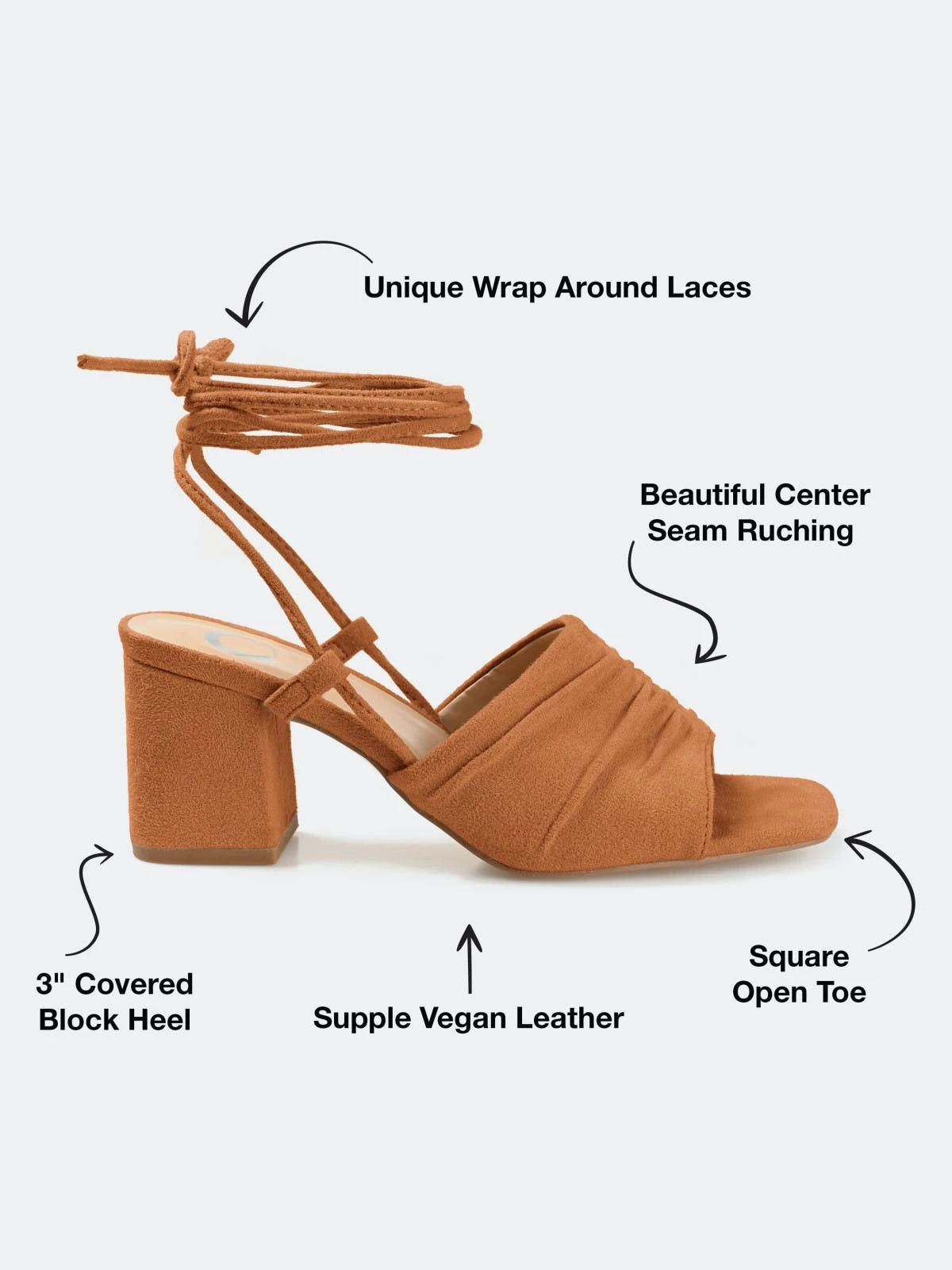 Swoon-worthy heels by Journee Collection. The Felisity is a vegan leather heel featuring center seam and ruched details complemented by an open toe. A covered block heel lined with a padded footbed comfortably elevates the look and a wrap-around ankle tie adds a vintage touch.Heel Height:3-inchHeel Type: Block Heel Platform Height:Flat-inchShoe Width: MediumClosure Type: Lace-upStrap Type: Ankle WrapToe Style: OpenLining: Faux LeatherUpper Material: Vegan LeatherOutersole Material: Man-madeFootbed: PaddedAll measurements are approximate and were taken using a size 6. Please note measurements may vary slightly by size.