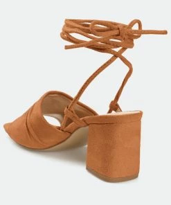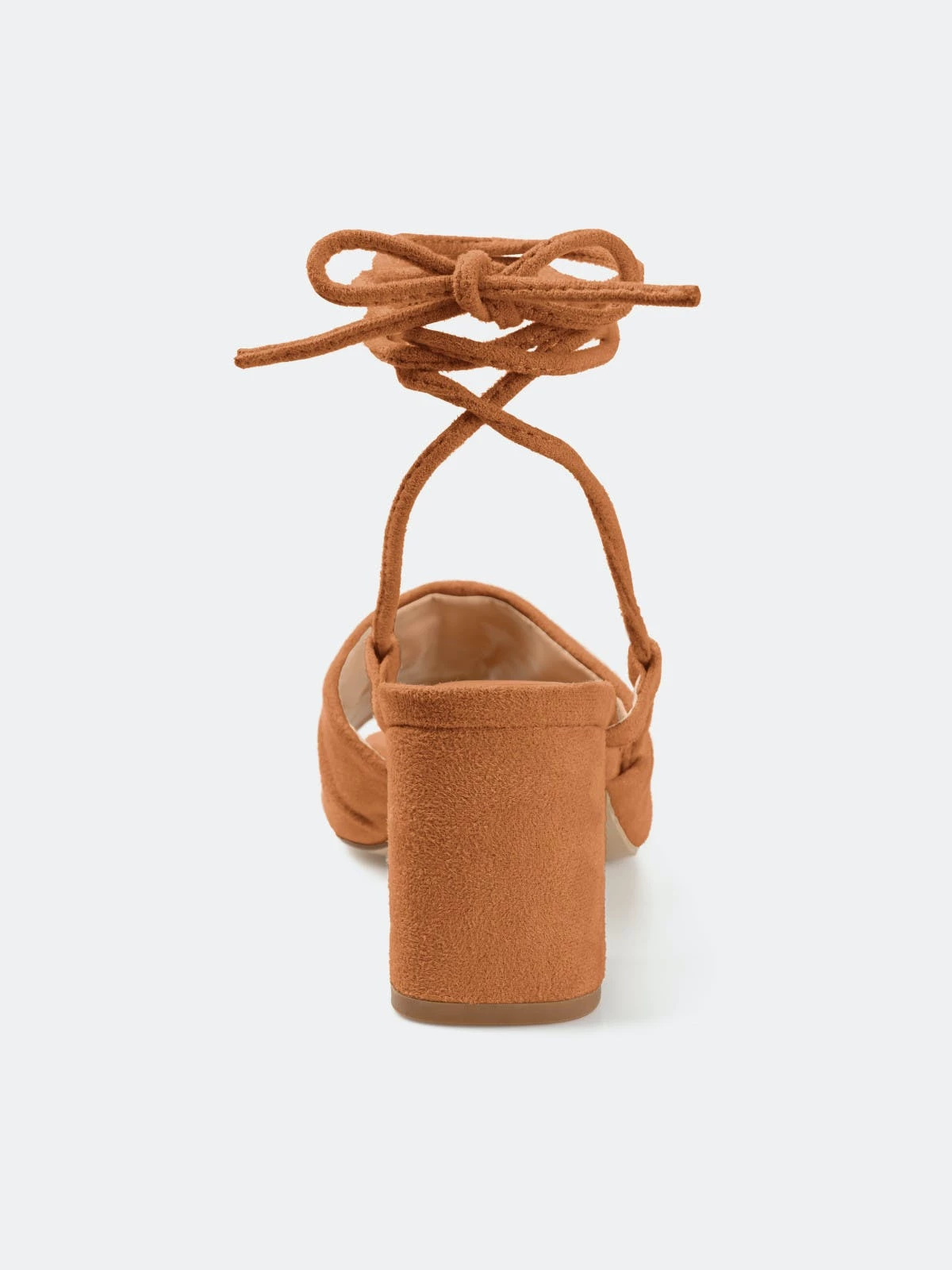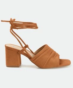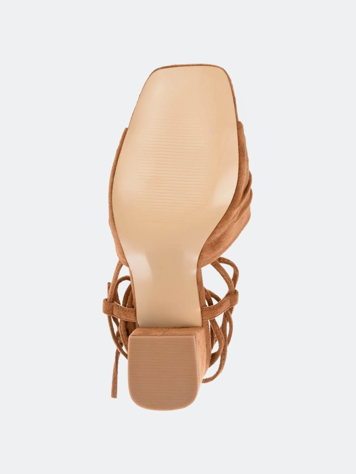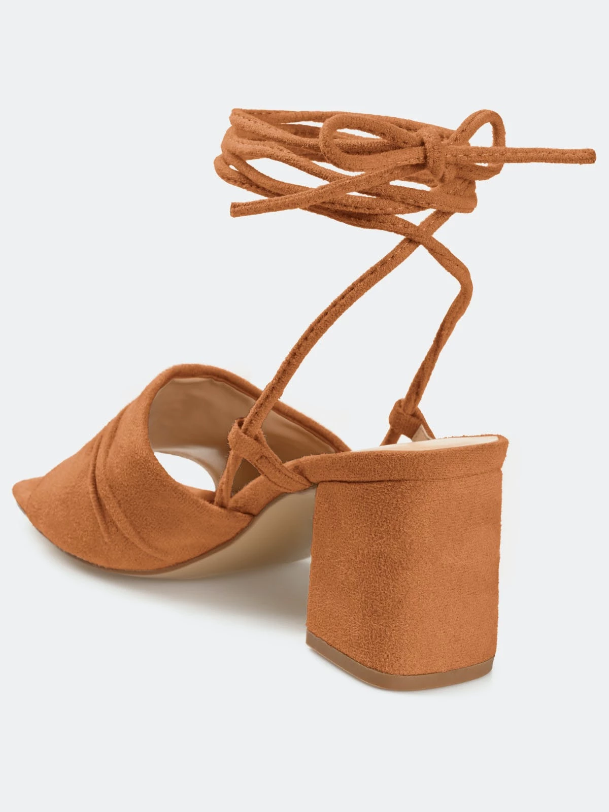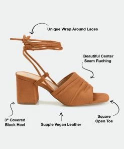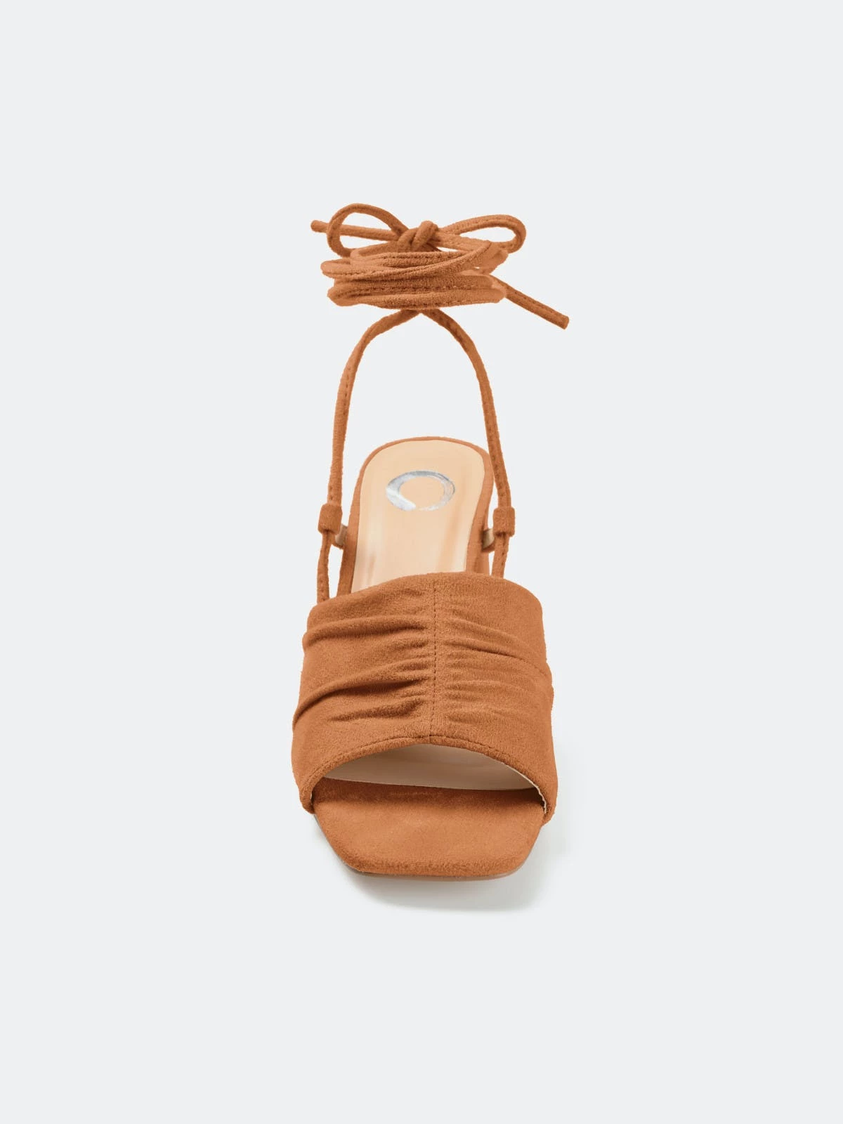 Swoon-worthy heels by Journee Collection. The Felisity is a vegan leather heel featuring center seam and ruched details complemented by an open toe. A covered block heel lined with a padded footbed comfortably elevates the look and a wrap-around ankle tie adds a vintage touch.Heel Height:3-inchHeel Type: Block Heel Platform Height:Flat-inchShoe Width: MediumClosure Type: Lace-upStrap Type: Ankle WrapToe Style: OpenLining: Faux LeatherUpper Material: Vegan LeatherOutersole Material: Man-madeFootbed: PaddedAll measurements are approximate and were taken using a size 6. Please note measurements may vary slightly by size.