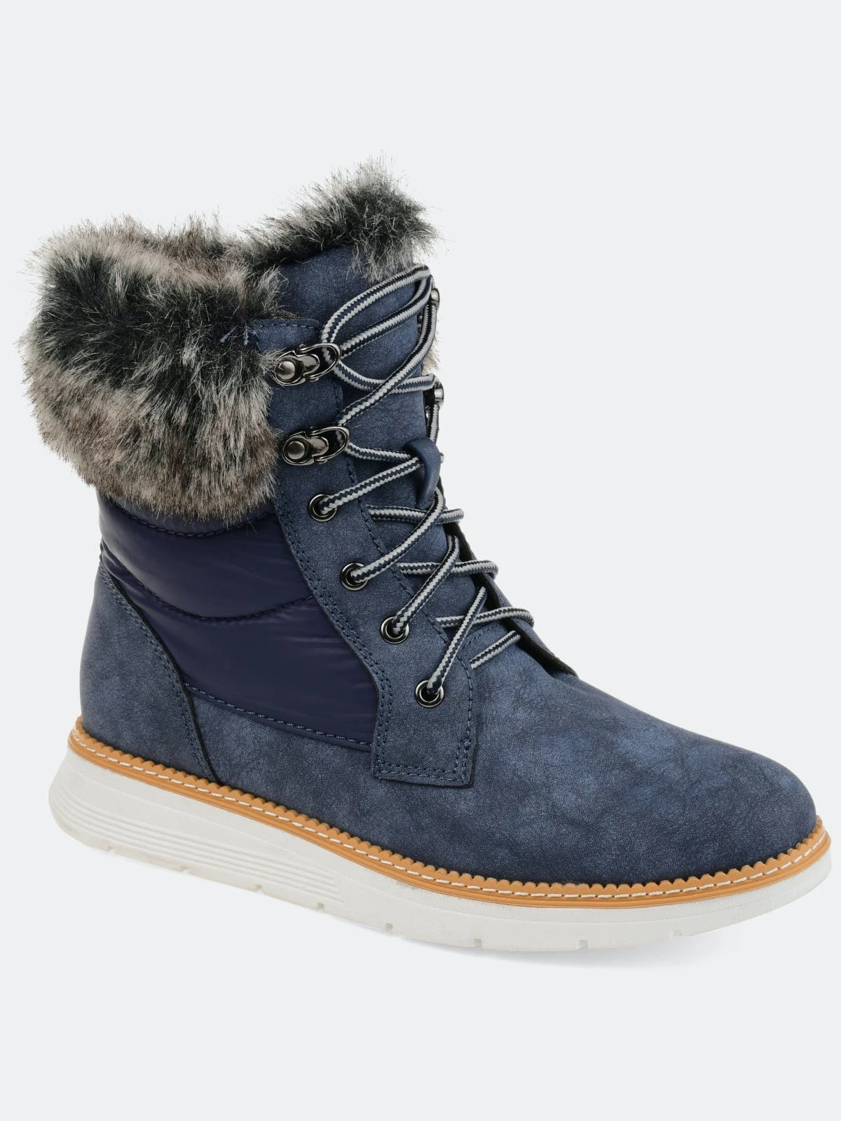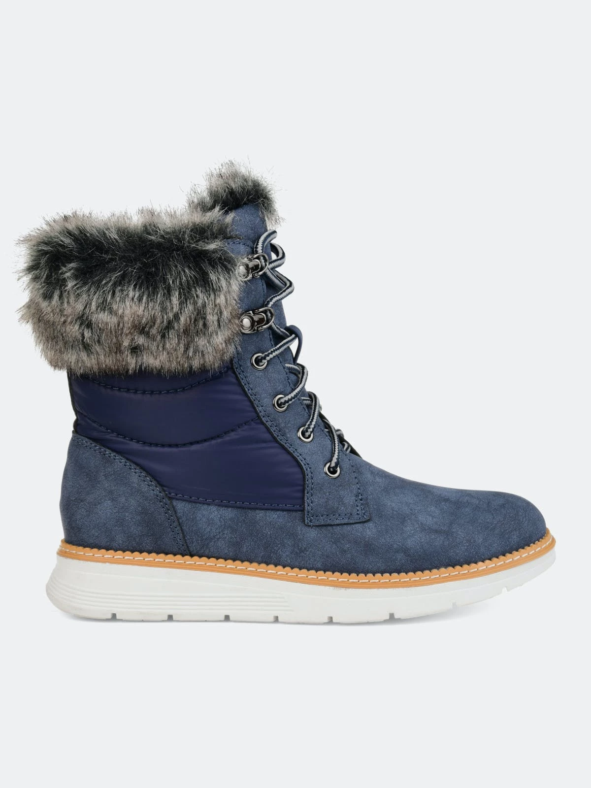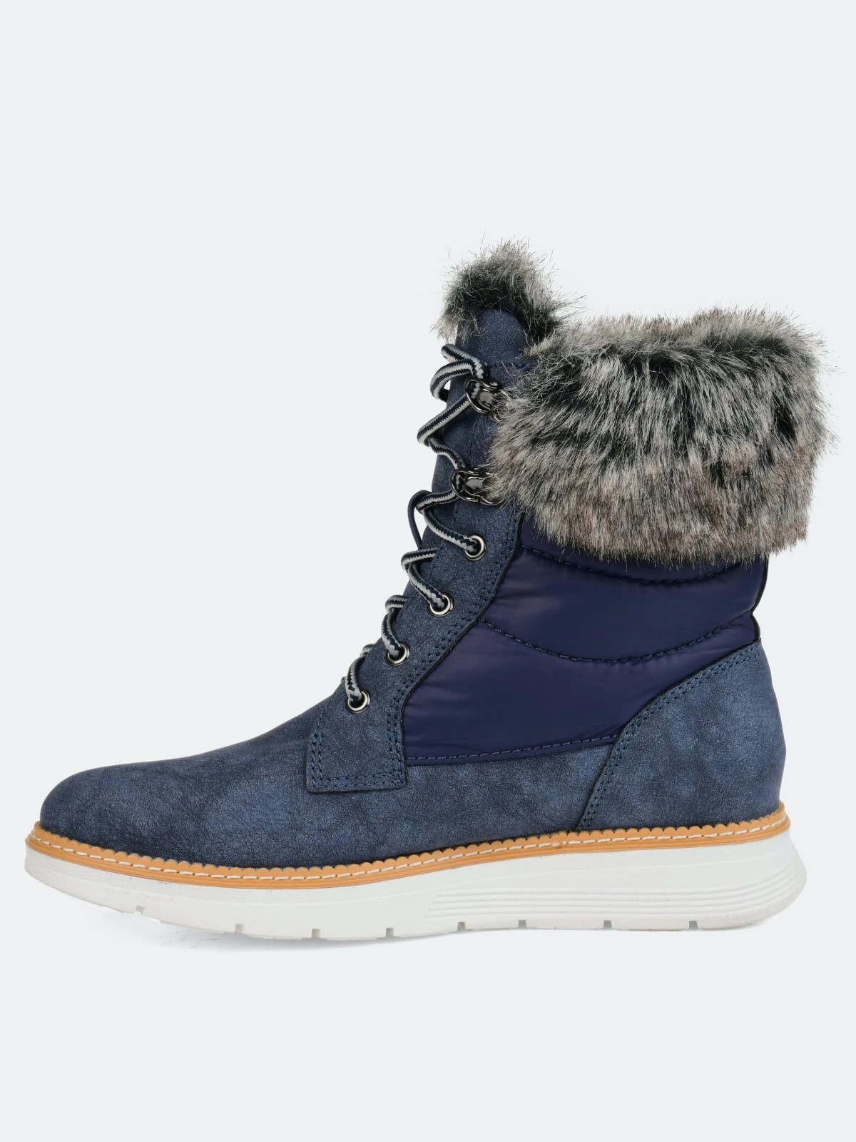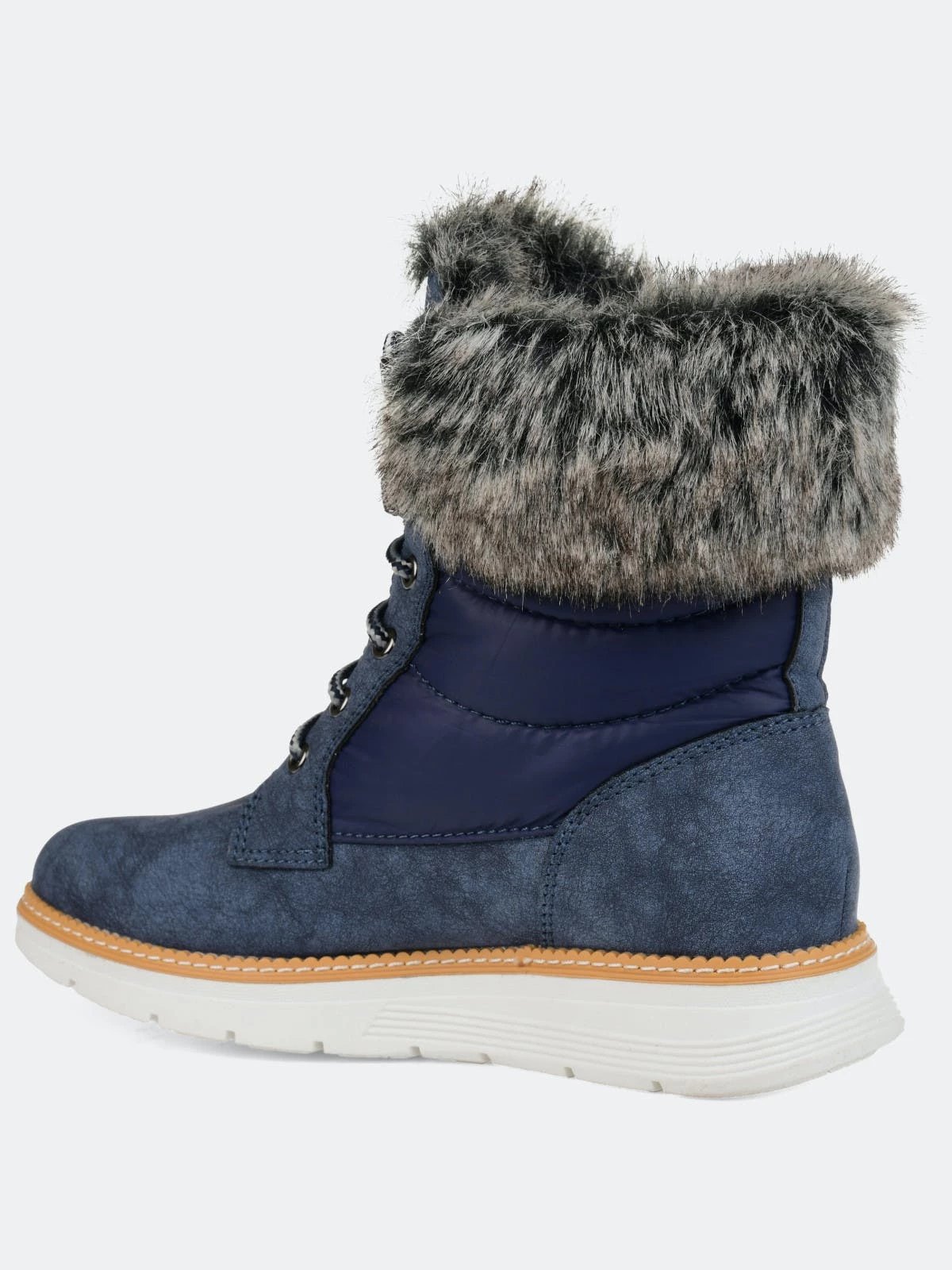 Everyone loves a good fur winter boot, and the Flurry boot by Journee Collection is perfect! This waterproof ankle boot will add something extra to those dull winter wardrobes. Stand out with the thick fur accent, thick outer soles, cool laces, and two-toned material!Heel Height: 1 1/4-inch. Heel Type: Sole. Platform Height: 1-inch. Shaft Height: 6 inches. Top Circumference: 14 inches. Shoe Width: Medium. Closure Type: Lace-up. Toe Style: Almond. Lining: Fabric. Upper Material: Man-made. Outersole Material: Rubber. Footbed: Padded. All measurements are approximate and were taken using a size 6. Please note measurements may vary slightly by size.