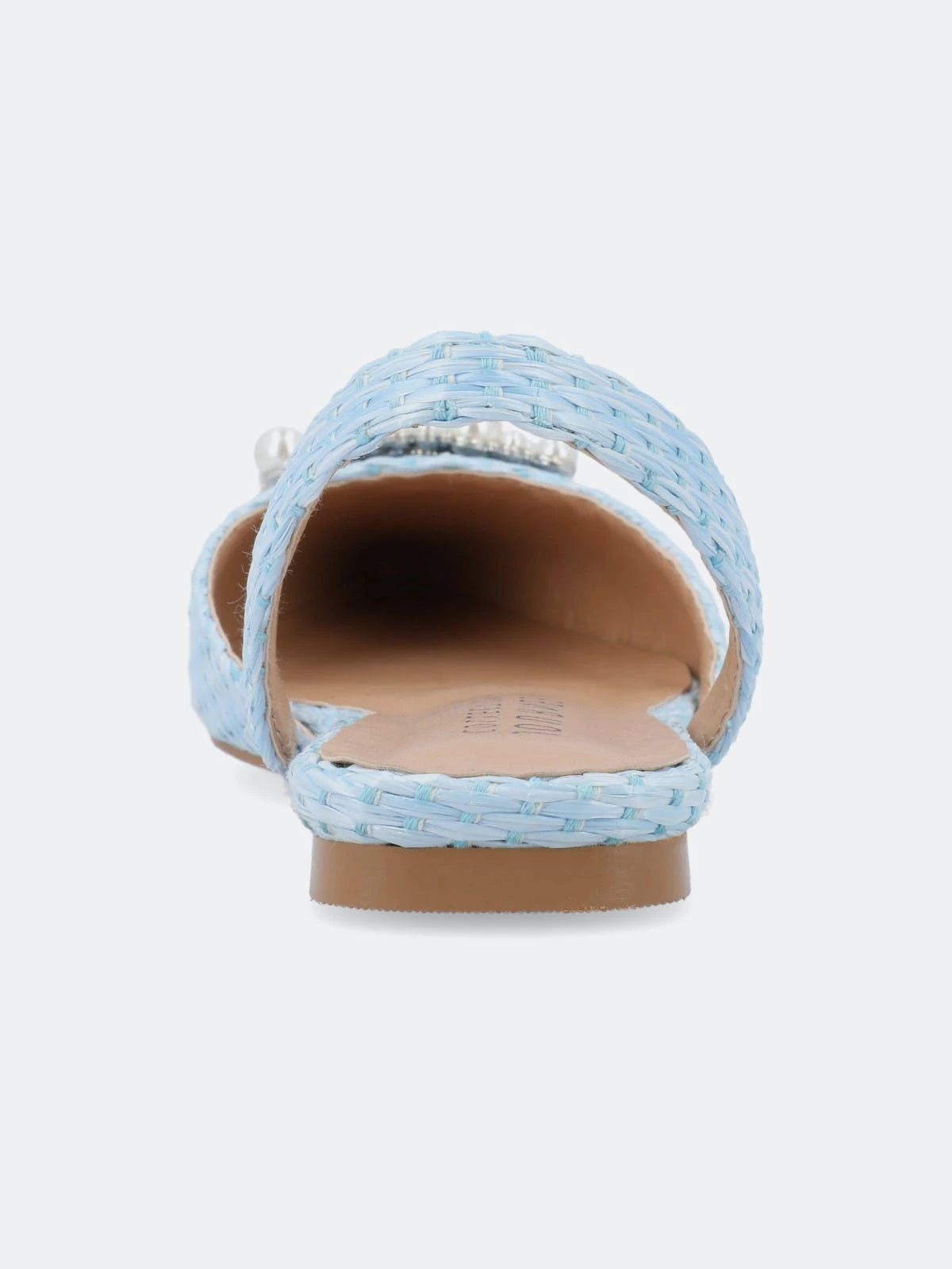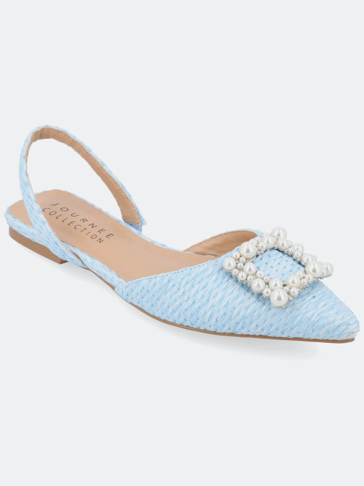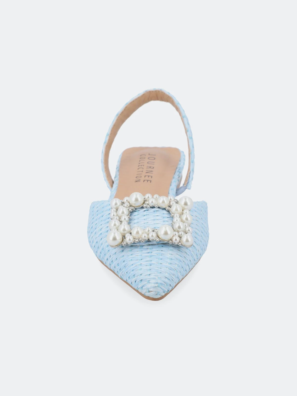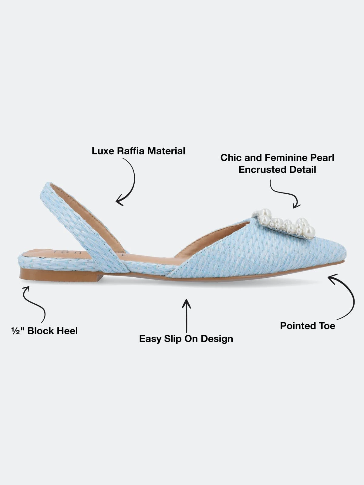 The Hannae flat from Journee Collection will take you from work to a nice dinner outing with ease. This glam flat can match just about everything thanks to the raffia-inspired material, sling-back strap, gem detail and pointed-toe. To add a little something extra, their padded footbed and pull-on closure will keep your feet comfortable with every step.
