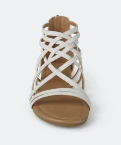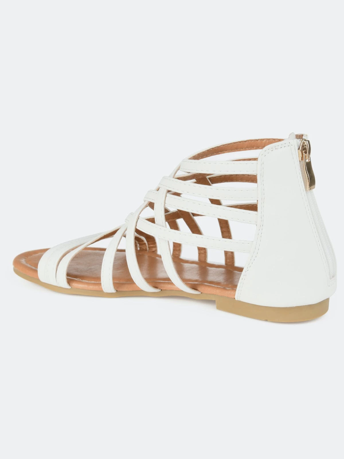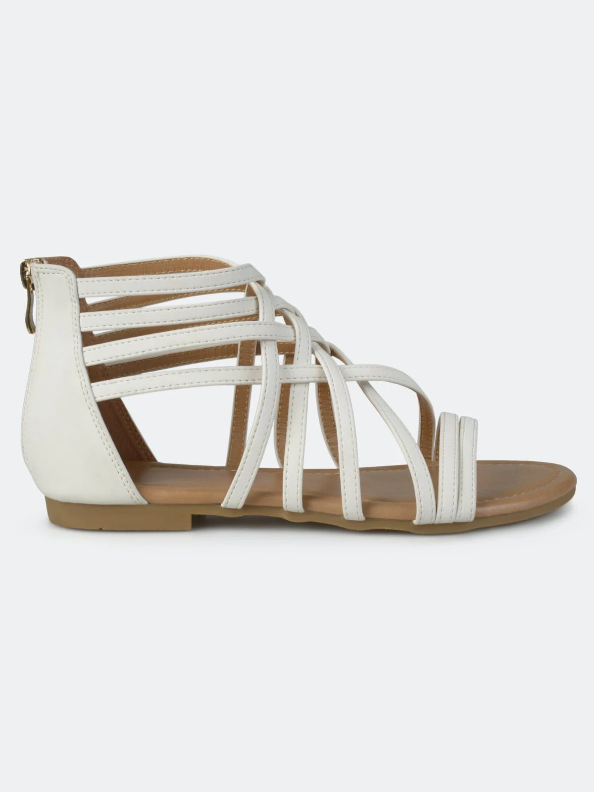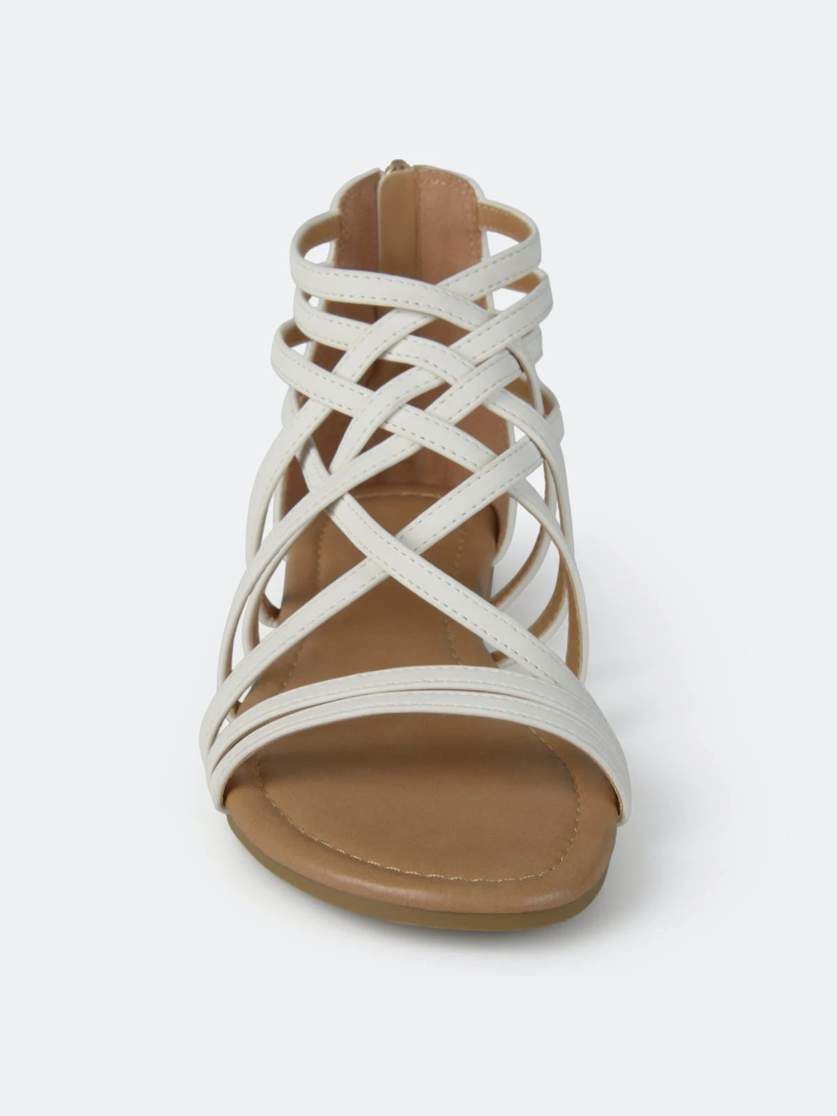 Show off the best boho look this season with strappy flat sandals by Journee Collection. Intricate straps overlap and create a basketweave design for a decorative appearance, and closed back heels feature zipper detail to finish the look.Heel Height:1/2-inchHeel Type: Block Heel Platform Height:1/2-inchShoe Width: MediumClosure Type: Back Heel ZipToe Style: RoundLining: Faux LeatherUpper Material: Faux LeatherOutersole Material: Man-madeFootbed: PaddedAll measurements are approximate and were taken using a size 6. Please note measurements may vary slightly by size.