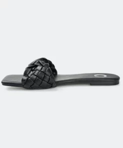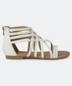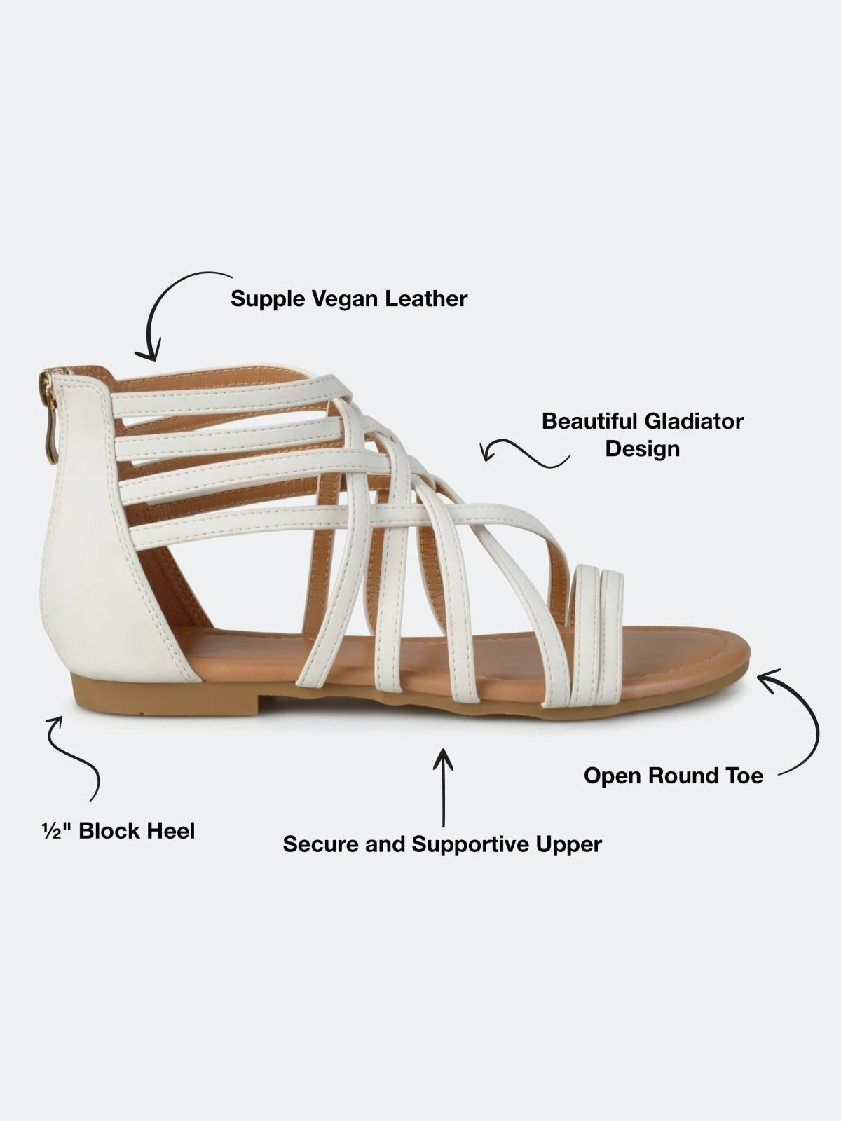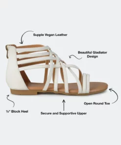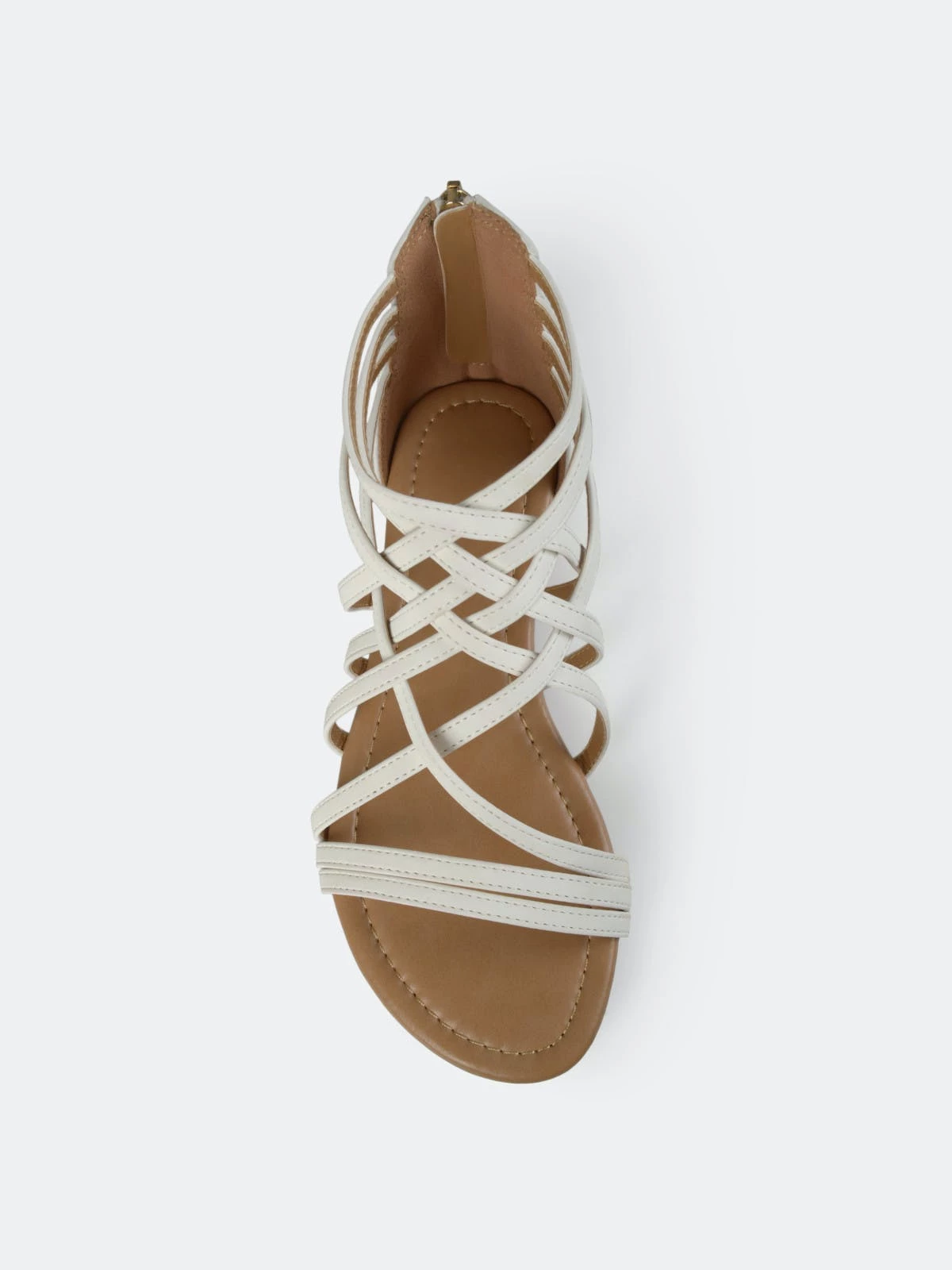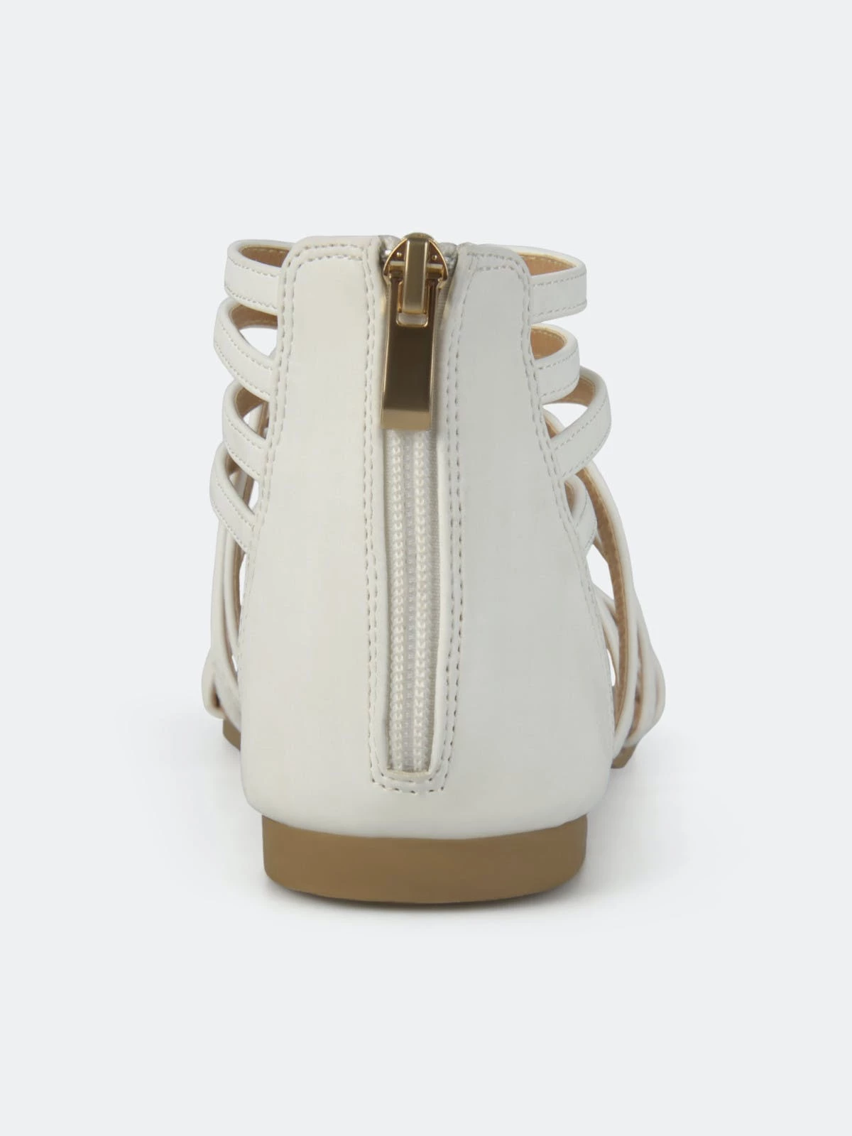 Show off the best boho look this season with strappy flat sandals by Journee Collection. Intricate straps overlap and create a basketweave design for a decorative appearance, and closed back heels feature zipper detail to finish the look.Heel Height:1/2-inchHeel Type: Block Heel Platform Height:1/2-inchShoe Width: MediumClosure Type: Back Heel ZipToe Style: RoundLining: Faux LeatherUpper Material: Faux LeatherOutersole Material: Man-madeFootbed: PaddedAll measurements are approximate and were taken using a size 6. Please note measurements may vary slightly by size.