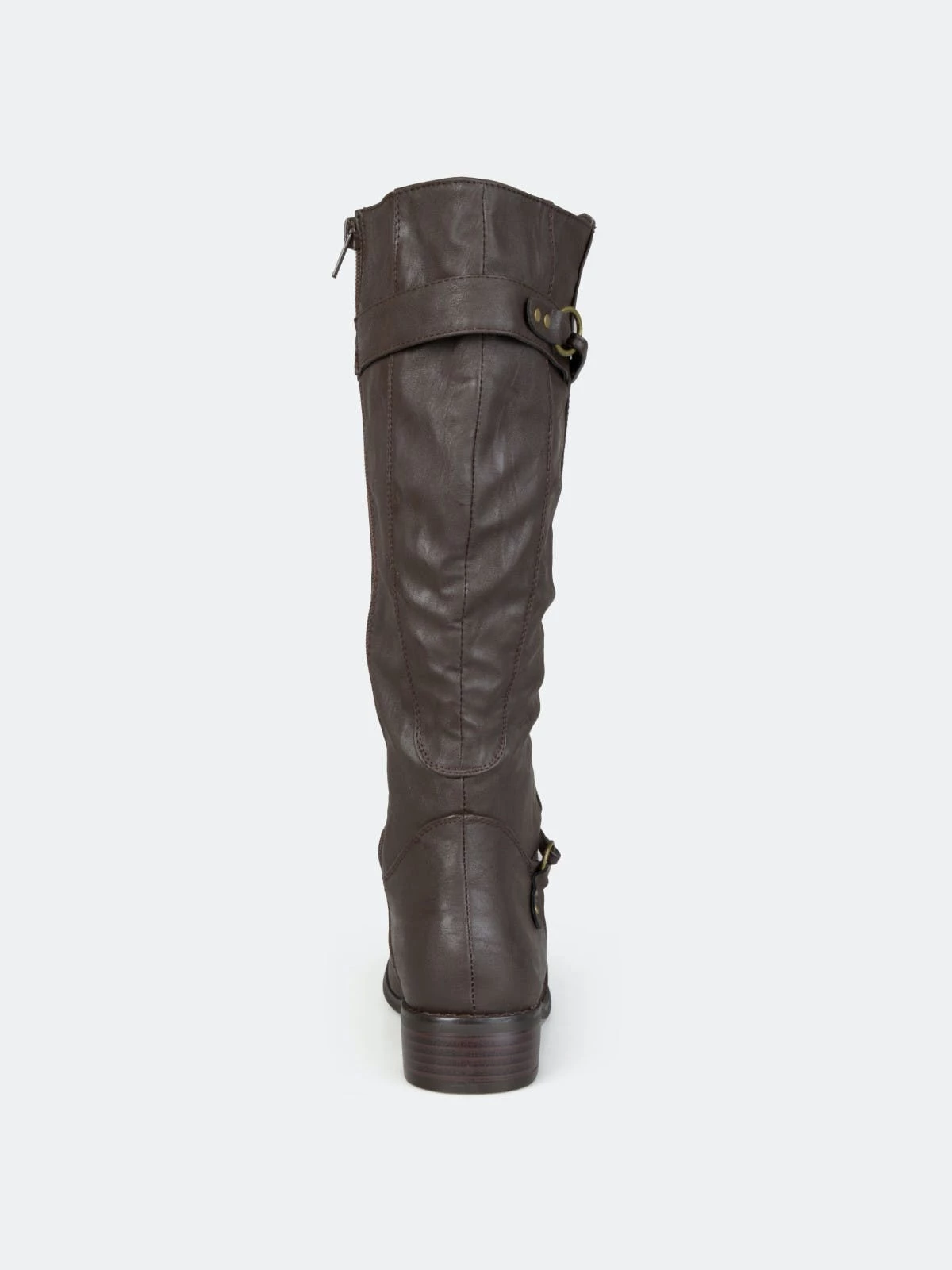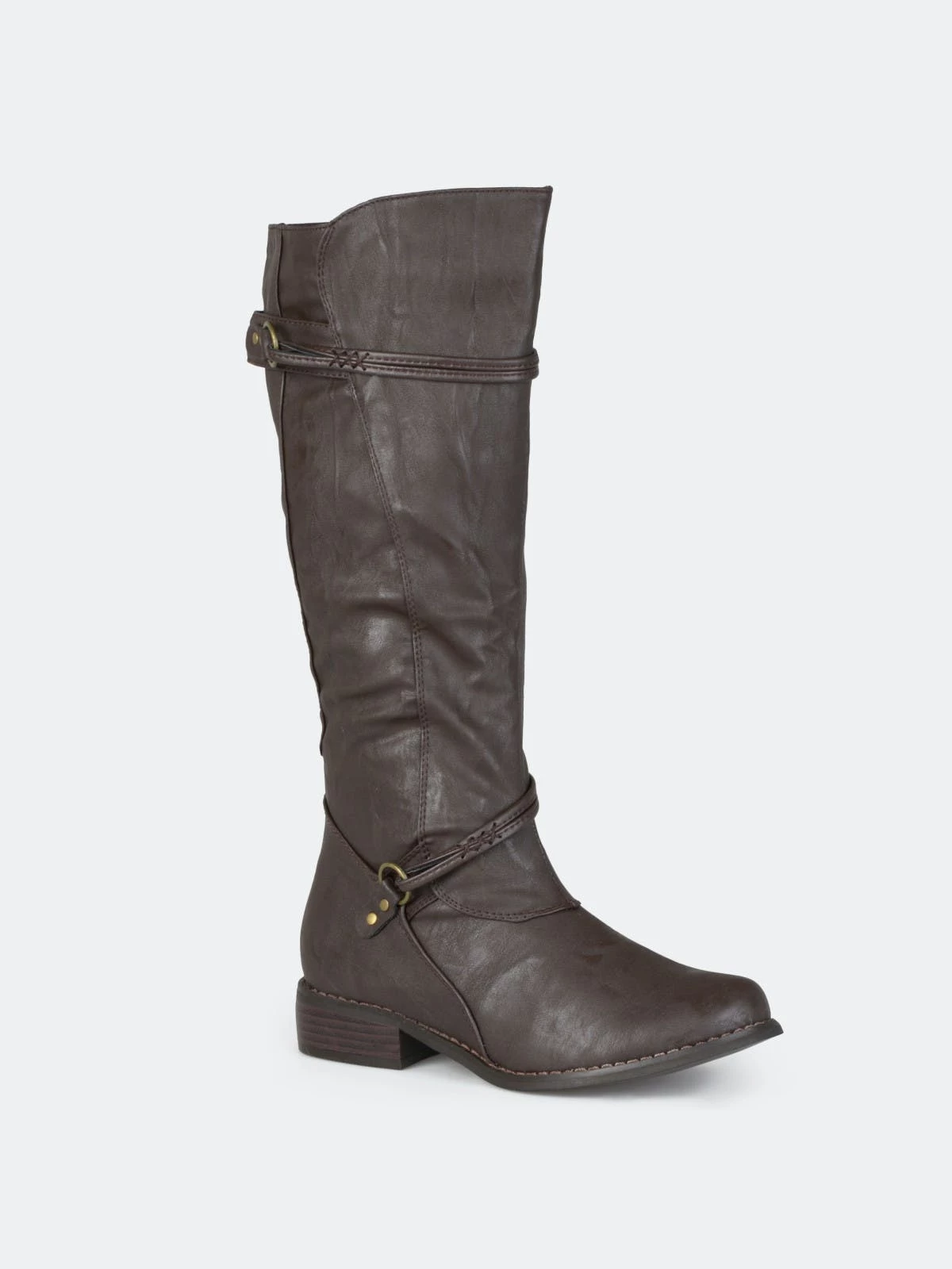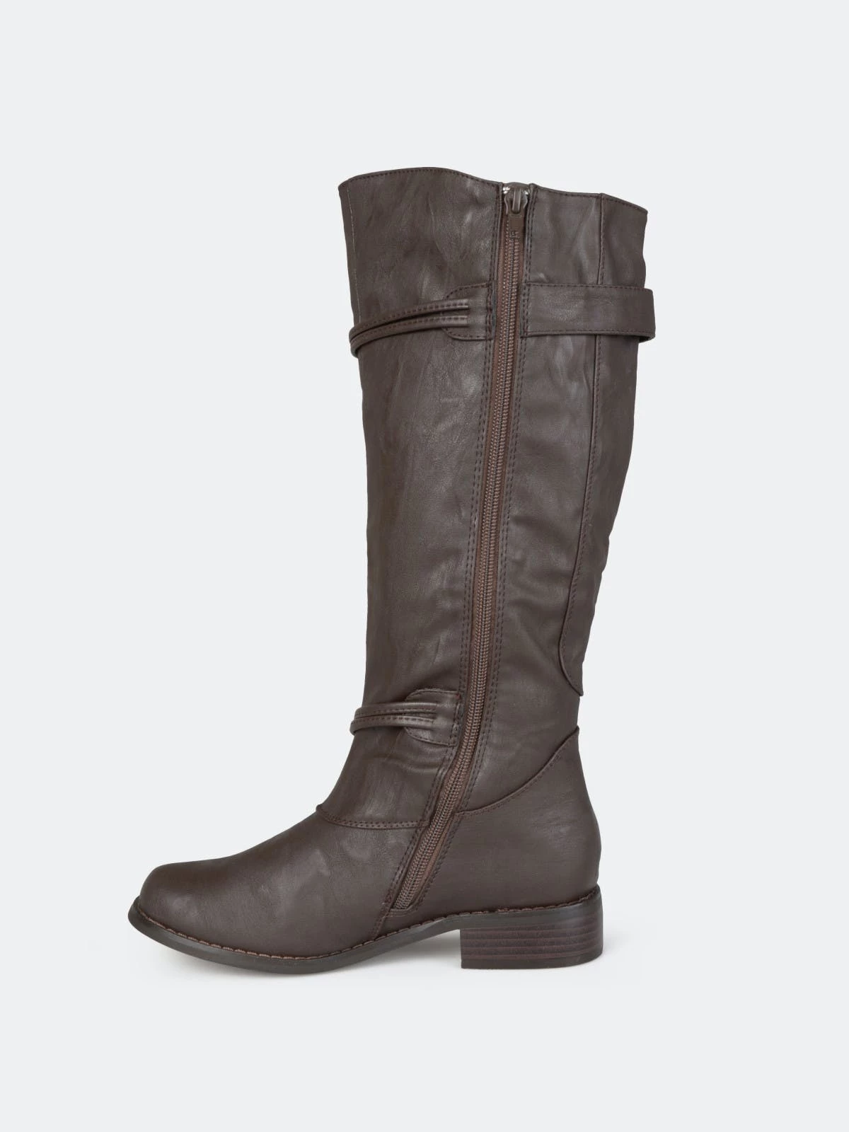 Express your style this season in versatile riding boots by Journee Collection. These boots feature soft faux leather uppers that rise to below the knees with shafts that rise higher in the front. Strappy detail accents the ankles on these fall boots.Heel Height: 1 1/4-inch. Heel Type: Stacked. Platform Height: 1/2-inch. Shaft Height: 15 1/2 inches. Calf Circumference: 15 1/2 inches. Top Circumference: 15 1/4 inches. Shoe Width: Medium. Closure Type: Inside Zip. Toe Style: Round. Lining: Fabric. Upper Material: Faux Leather. Outersole Material: Man-made. Footbed: Padded. All measurements are approximate and were taken using a size 6. Please note measurements may vary slightly by size.