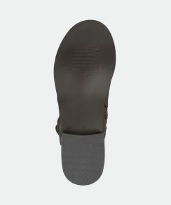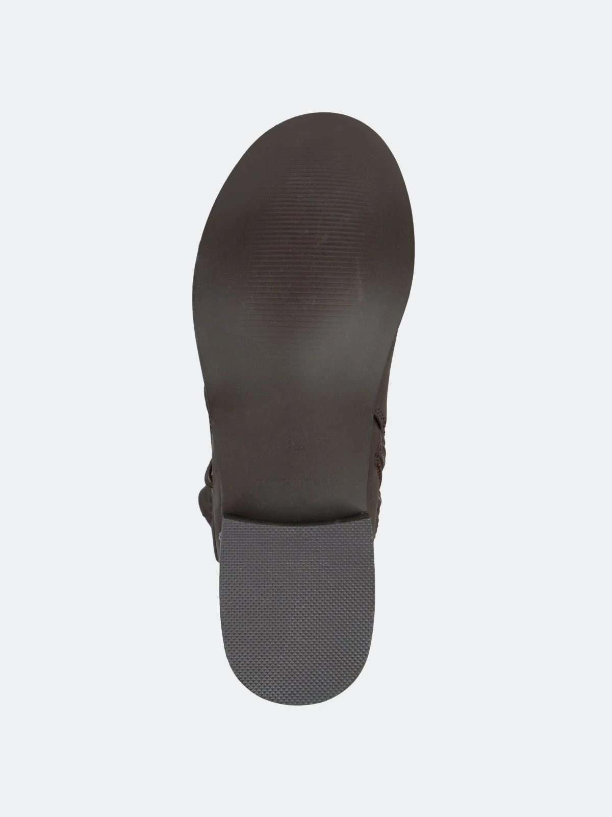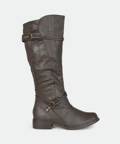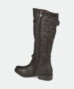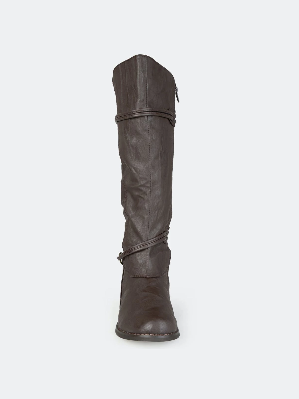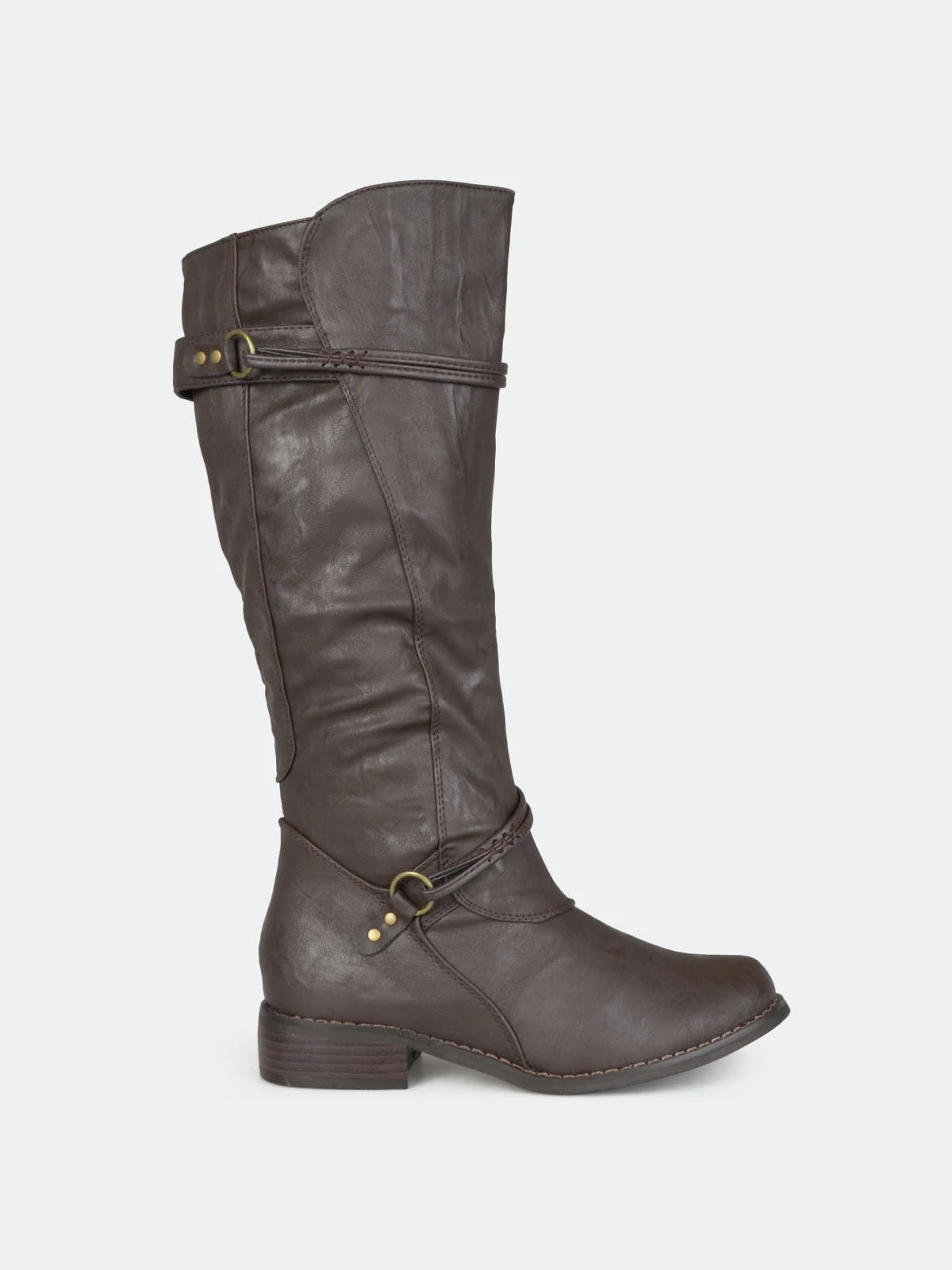 Express your style this season in versatile riding boots by Journee Collection. These boots feature soft faux leather uppers that rise to below the knees with shafts that rise higher in the front. Strappy detail accents the ankles on these fall boots.Heel Height: 1 1/4-inch. Heel Type: Stacked. Platform Height: 1/2-inch. Shaft Height: 15 1/2 inches. Calf Circumference: 15 1/2 inches. Top Circumference: 15 1/4 inches. Shoe Width: Medium. Closure Type: Inside Zip. Toe Style: Round. Lining: Fabric. Upper Material: Faux Leather. Outersole Material: Man-made. Footbed: Padded. All measurements are approximate and were taken using a size 6. Please note measurements may vary slightly by size.