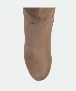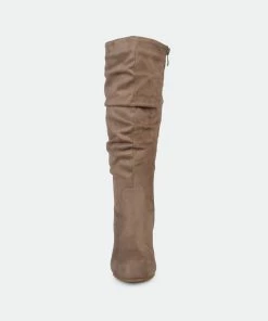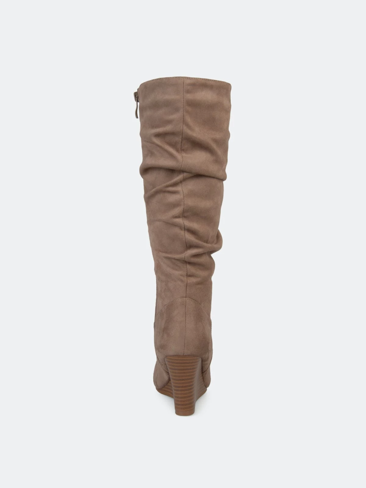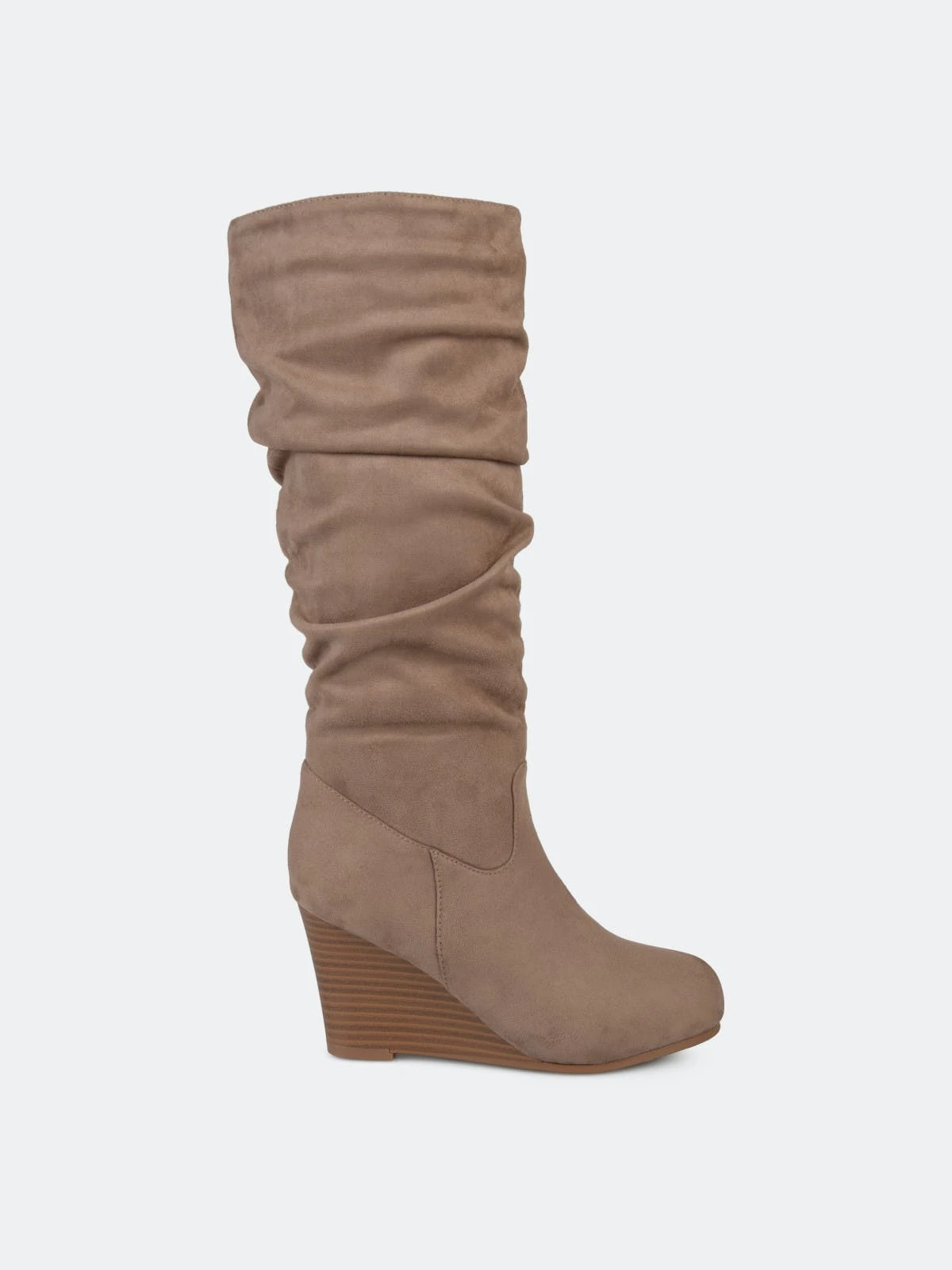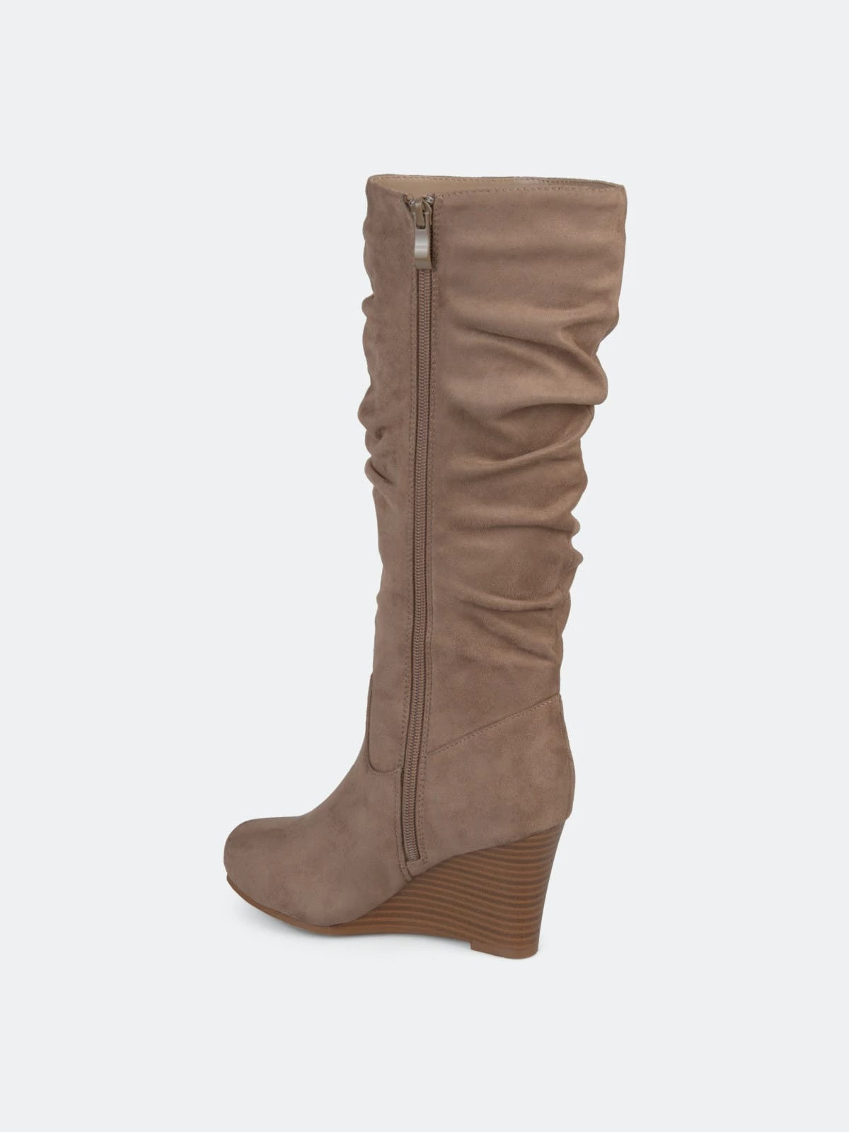 Show off stylish design in slouchy wedge boots by Journee Collection. These mid-calf boots are made with soft faux suede uppers with slouchy detail and an inside zipper. Stacked wedge heels provide attractive lift and round toes finish the style.Heel Height: 3-inch. Heel Type: Wedge. Platform Height: 1-inch. Shaft Height: 15 inches. Calf Circumference: 15 inches. Top Circumference: 15 inches. Shoe Width: Medium. Closure Type: Inside Zip. Toe Style: Round. Lining: Fabric. Upper Material: Faux Suede. Outersole Material: Man-made. Footbed: Padded. All measurements are approximate and were taken using a size 6. Please note measurements may vary slightly by size.