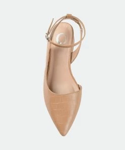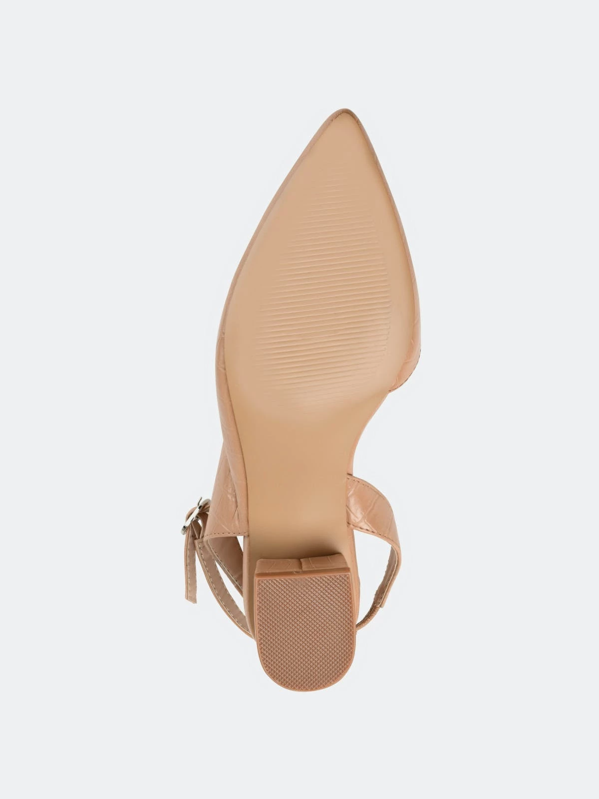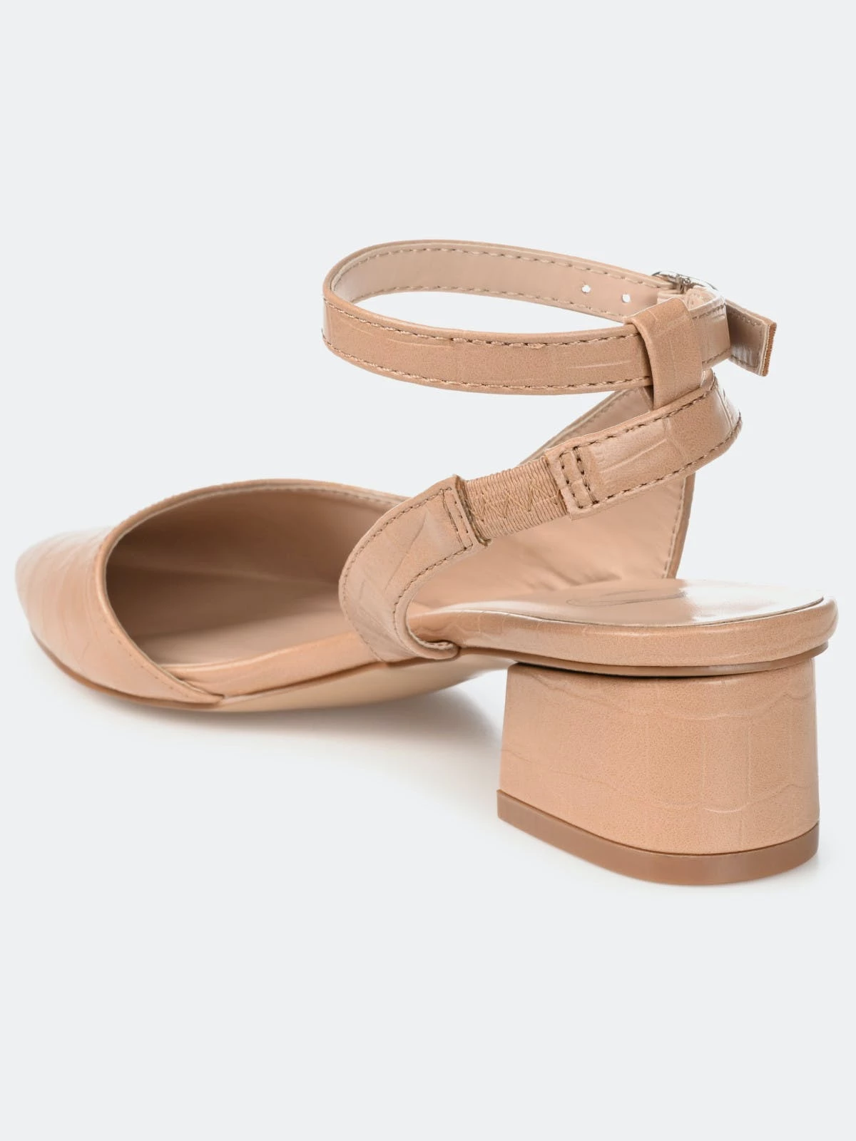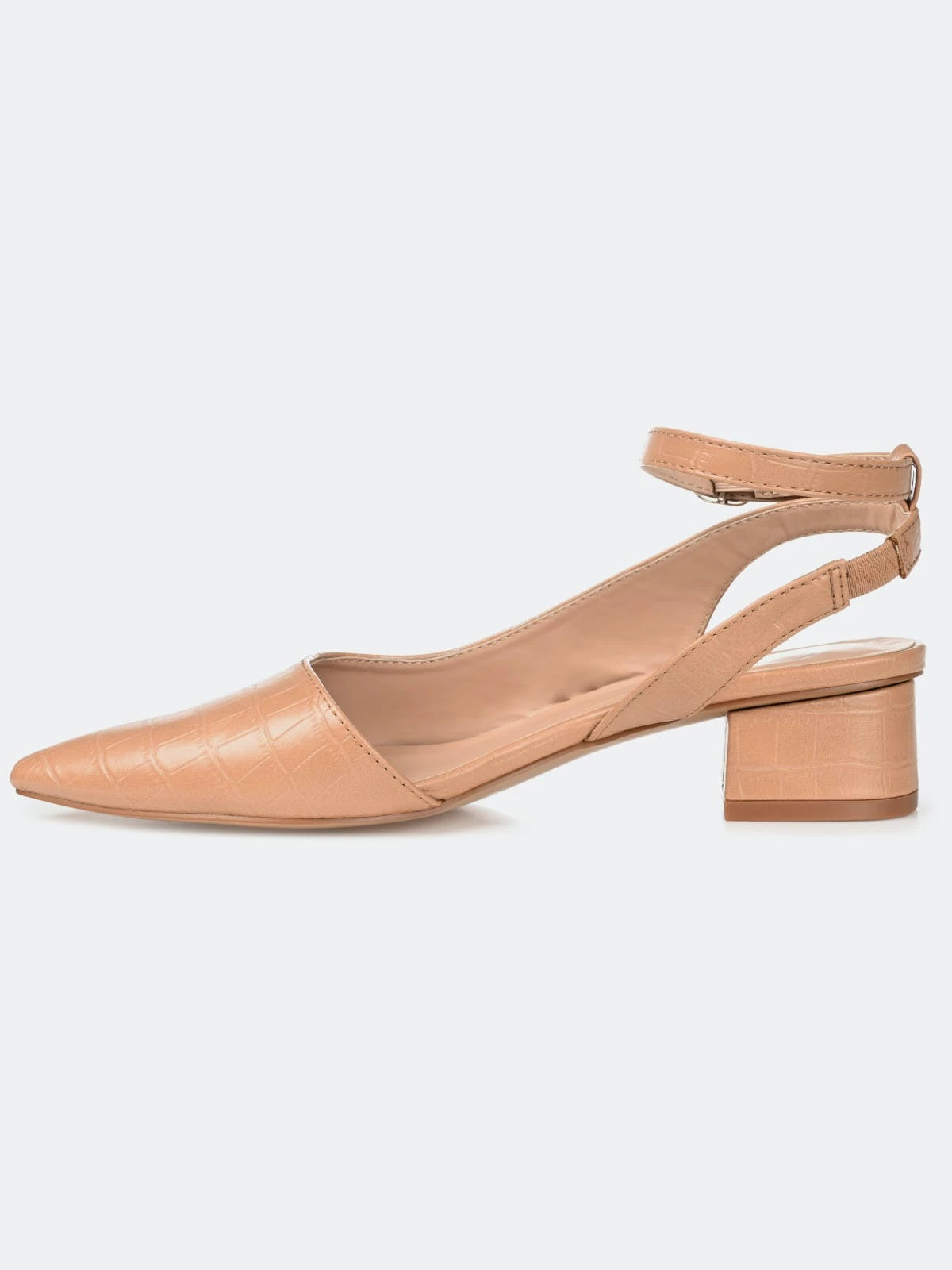 Add the perfect amount of sass to your favorite ensembles with the Keefa by Journee Collection. This pointed-toe heel features croc textured vegan leather and a strap at the ankle for a lux look. A low block heel and padded insole create a comfortable experience.Heel Height:1 1/2-inchHeel Type: Block Heel Platform Height:Flat-inchShoe Width: MediumClosure Type: BuckleStrap Type: AnkleToe Style: PointedLining: Faux LeatherUpper Material: Vegan LeatherOutersole Material: Man-madeFootbed: PaddedAll measurements are approximate and were taken using a size 6. Please note measurements may vary slightly by size.
