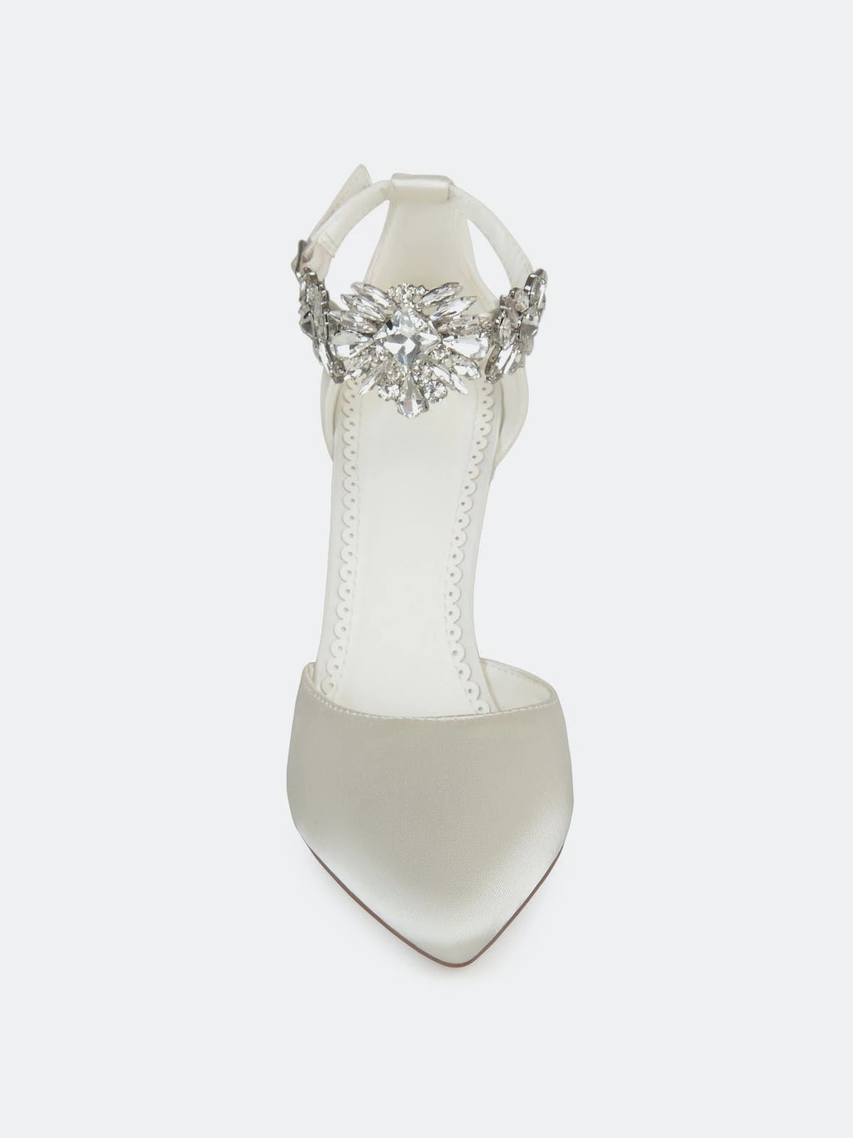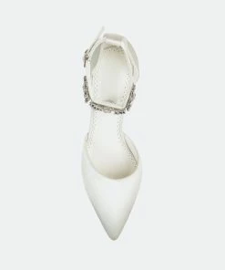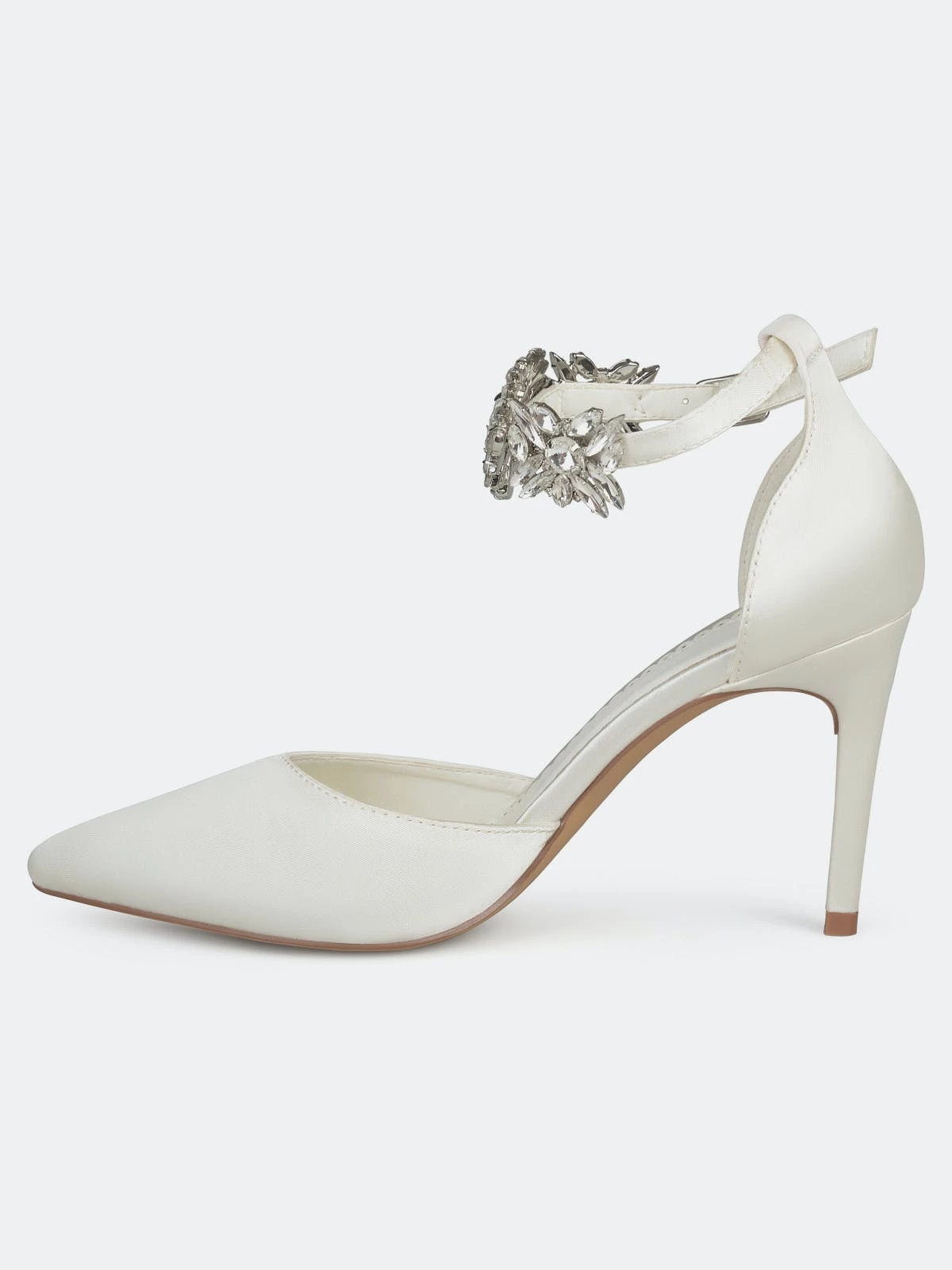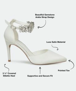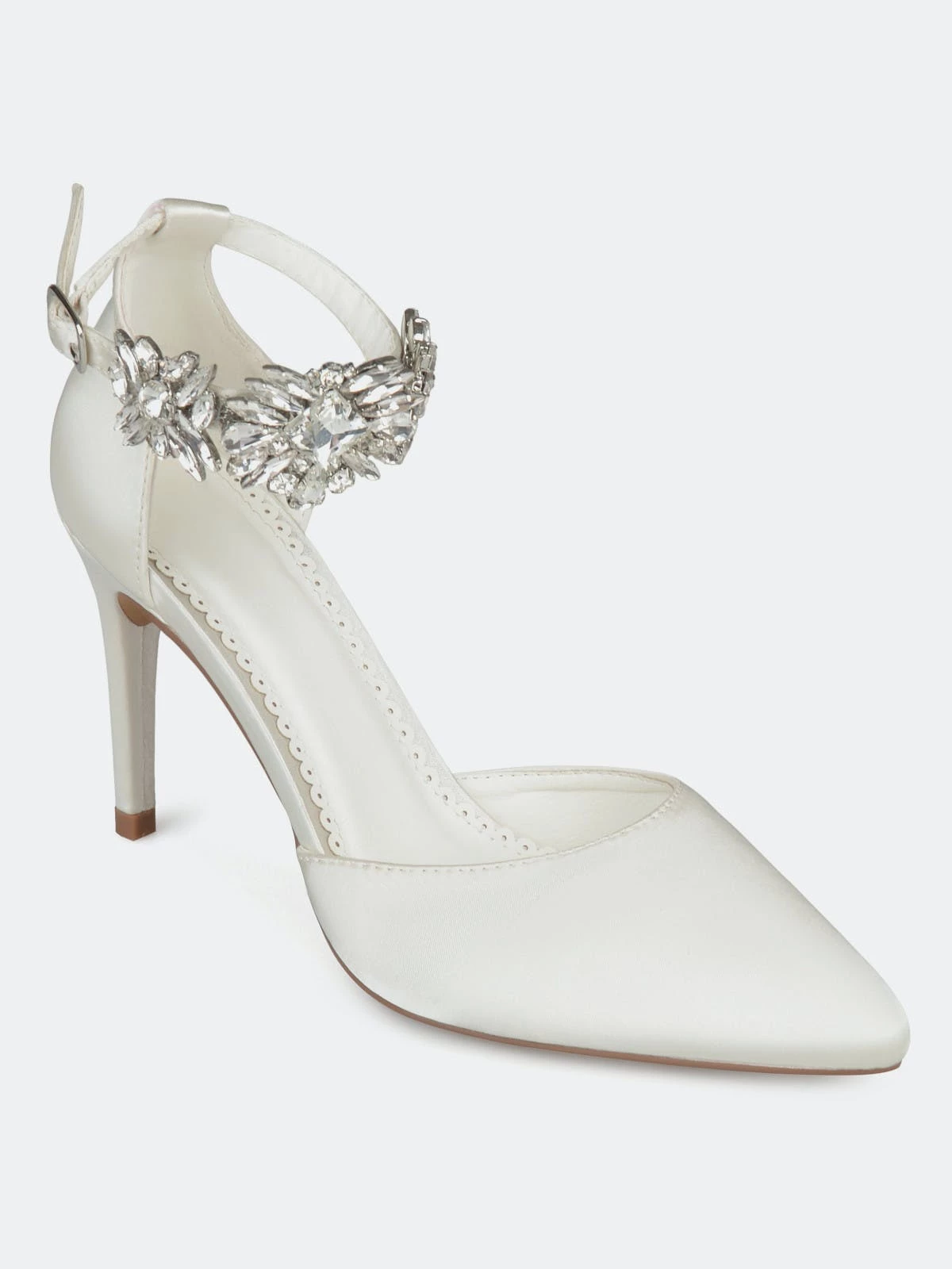 Show off your chic style with these pointed toe pumps by Journee Collection. These pumps feature soft sateen fabric with a stylish rhinestone ankle strap. Closed back heels and a d’Orsay design provide an elegant look for any occasion.Heel Height:3 1/2-inchHeel Type: Heel Platform Height:Flat-inchShoe Width: MediumClosure Type: BuckleStrap Type: AnkleToe Style: PointedLining: Faux LeatherUpper Material: FabricOutersole Material: Fabric over SyntheticFootbed: PaddedAll measurements are approximate and were taken using a size 6. Please note measurements may vary slightly by size.