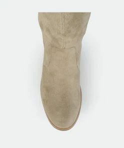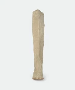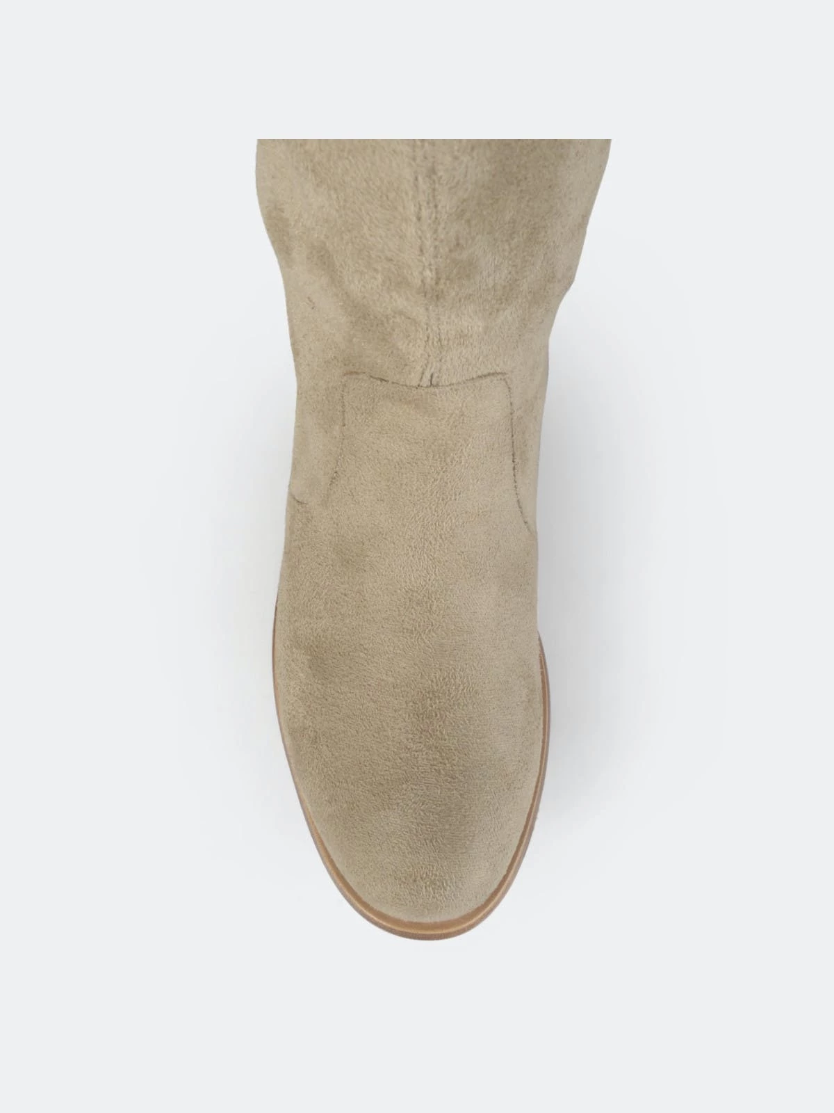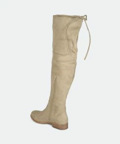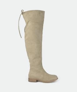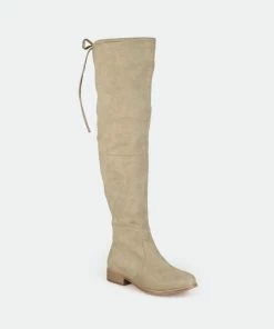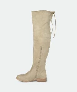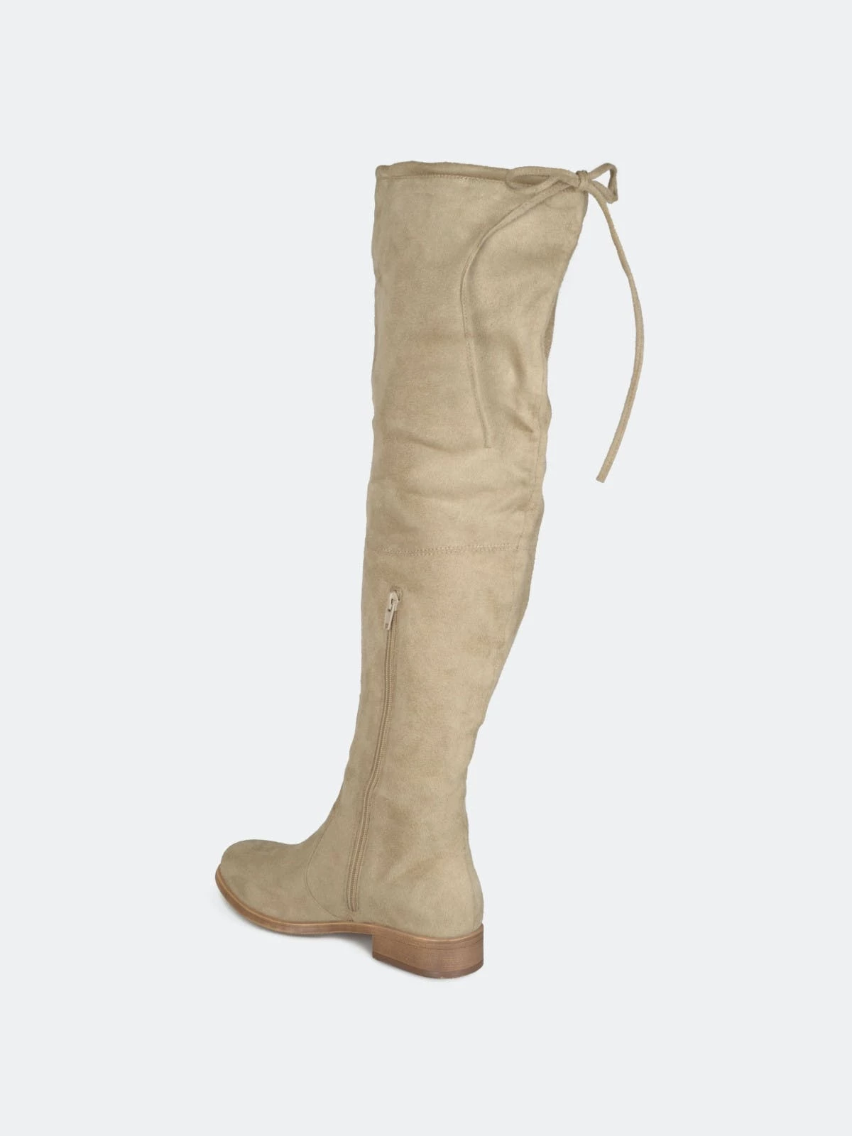 Take on the season in chic style with knee-high boots by Journee Collection. These tall boots feature premium faux suede uppers that rise above the knees and feature a back-tie accent at the top.Heel Height: 1-inch. Heel Type: Stacked. Platform Height: 1/2-inch. Shaft Height: 22 1/2 inches. Calf Circumference: 14 inches. Top Circumference: 16 3/4 inches. Shoe Width: Medium. Closure Type: Inside Zip. Toe Style: Round. Lining: Fabric. Upper Material: Faux Suede. Outersole Material: Man-made. Footbed: Padded. All measurements are approximate and were taken using a size 6. Please note measurements may vary slightly by size.