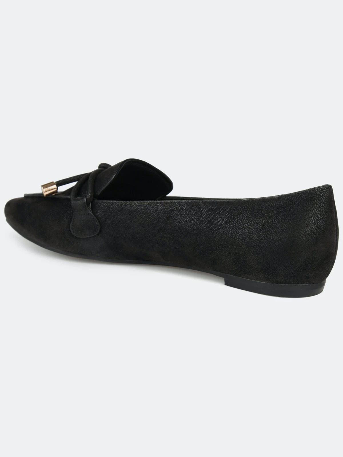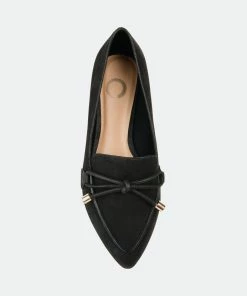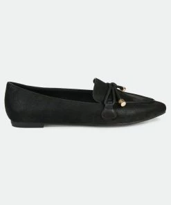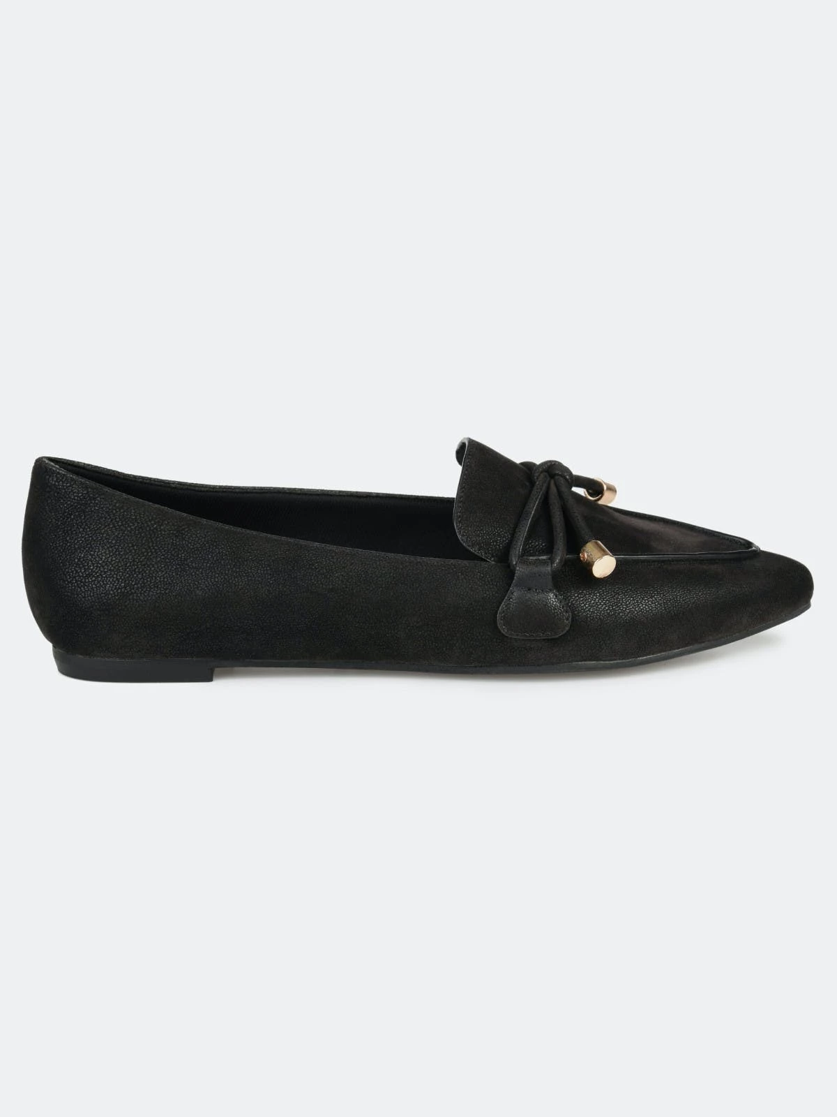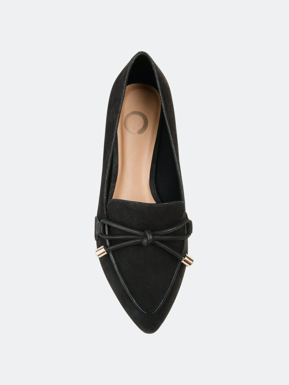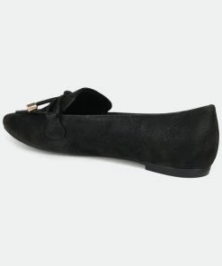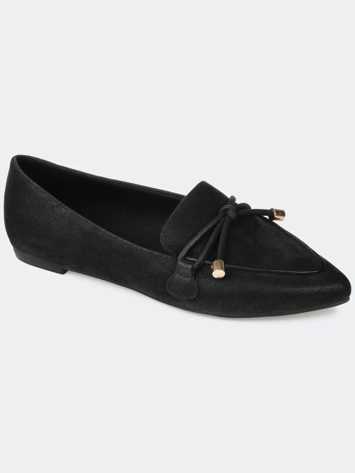 These wear-it-everywhere loafer flats by Journee Collection feature soft vegan leather and a pointed toe with stitched details. The Muriel is a smart contemporary look topped with a bow tassel accent for a sophisticated finish. We’ve added a cushioned insole for all-day comfort to the Muriel, and it just might be the most relaxed professional shoe ever.FlatHeel Type: Sole Platform Height:Flat-inchShoe Width: MediumClosure Type: Slip-onToe Style: PointedLining: FabricUpper Material: Vegan LeatherOutersole Material: RubberFootbed: CushionedAll measurements are approximate and were taken using a size 6. Please note measurements may vary slightly by size.