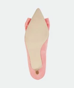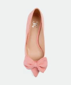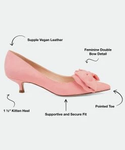 Live it up in the Orana heel by Journee Collection. This adorable kitten heel is made of faux suede material and has a beautiful pointed toe. the large accent bow finishes off the clean look.Heel Height:1 1/2-inchHeel Type: Kitten Heel Platform Height:1/2-inchShoe Width: MediumClosure Type: Slip-onToe Style: PointedLining: Faux LeatherUpper Material: Faux SuedeOutersole Material: Faux Suede over SyntheticFootbed: PaddedAll measurements are approximate and were taken using a size 6. Please note measurements may vary slightly by size.