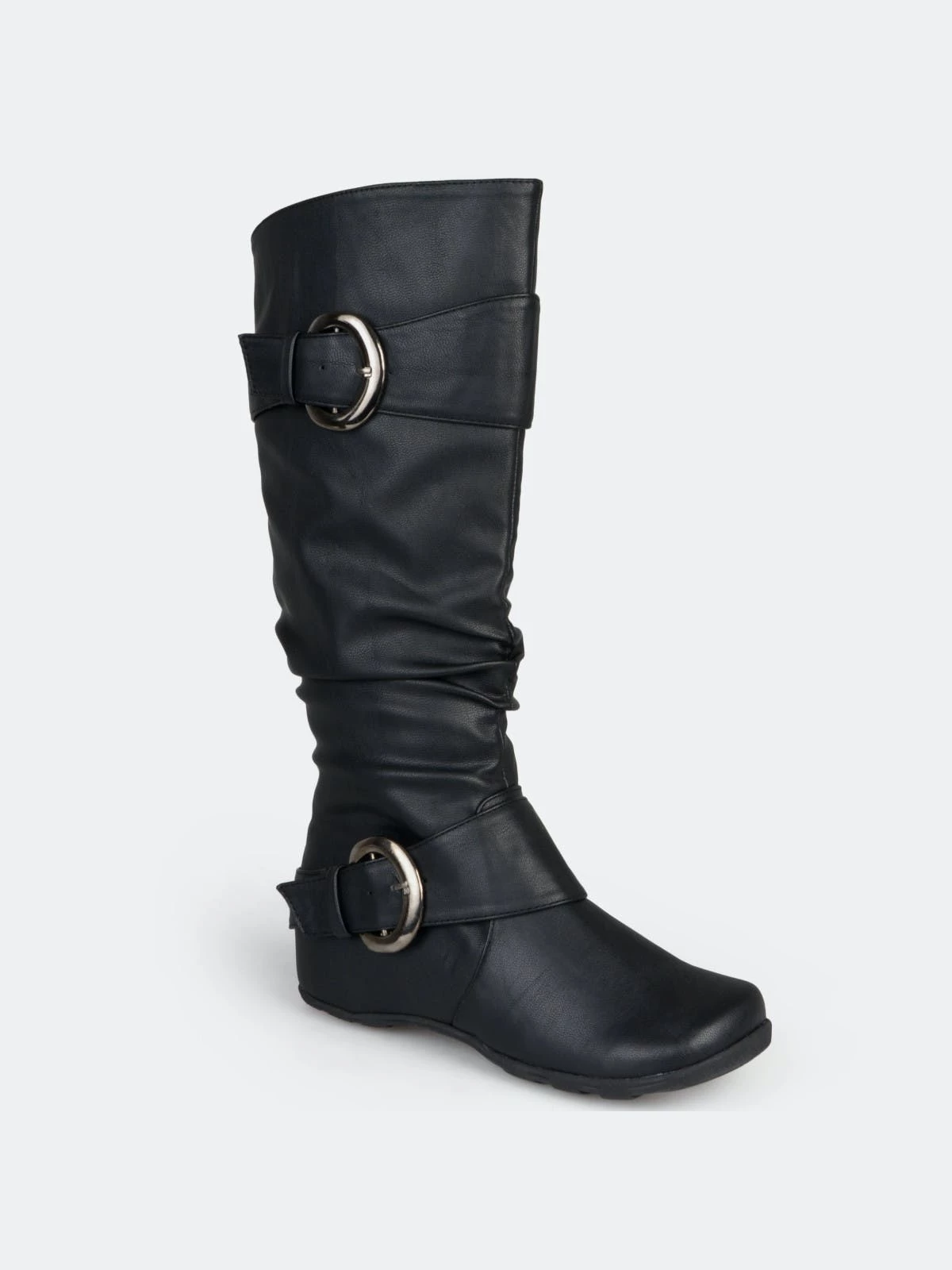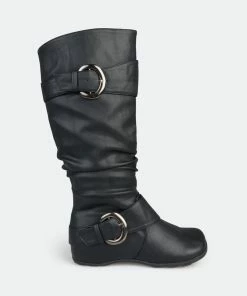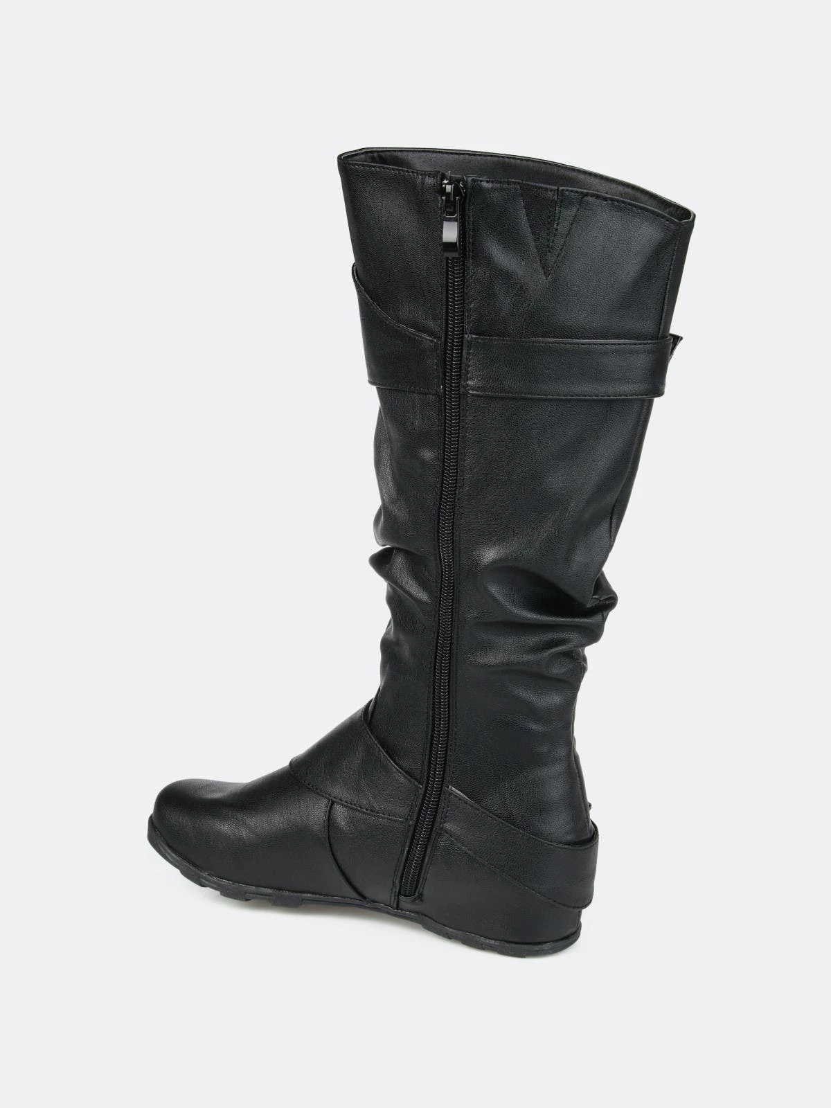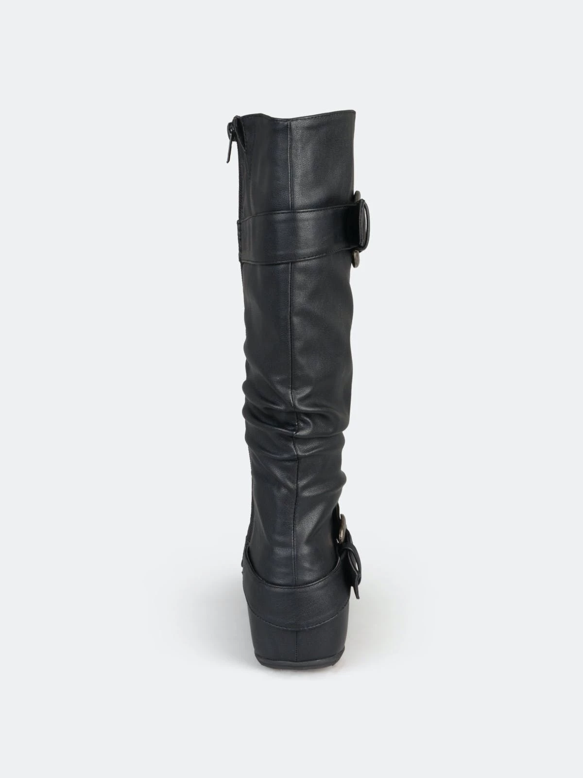 Show off one of the best styles of the season in tall boots by Journee Collection. These fashion boots feature premium faux leather uppers that rise mid-calf and highlight a subtle slouchy design with wide straps and buckle accents.Heel Height: 1 1/4-inch. Heel Type: Hidden Wedge. Platform Height: 1/2-inch. Shaft Height: 11 1/2 inches. Calf Circumference: 15 1/2 inches. Top Circumference: 16 1/4 inches. Shoe Width: Medium. Closure Type: Inside Zip. Toe Style: Round. Lining: Fabric. Upper Material: Faux Leather. Outersole Material: Rubber. Footbed: Padded. All measurements are approximate and were taken using a size 6. Please note measurements may vary slightly by size.