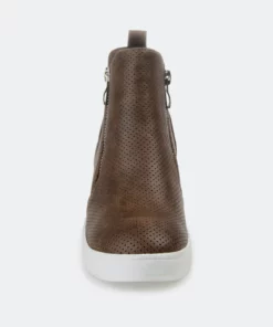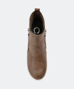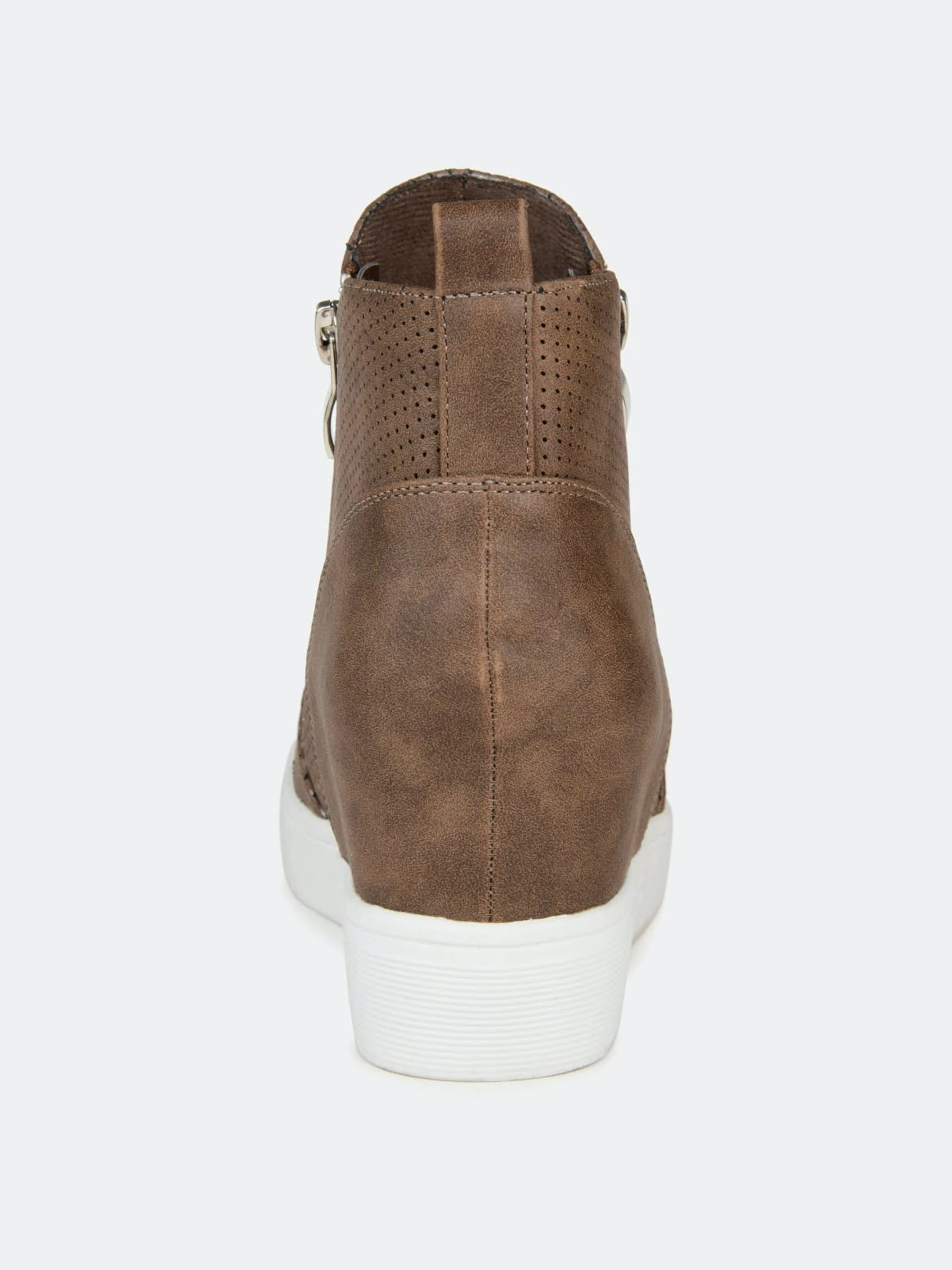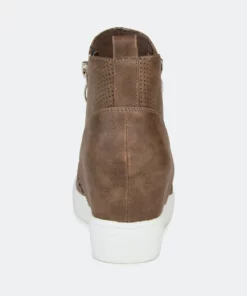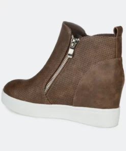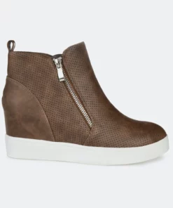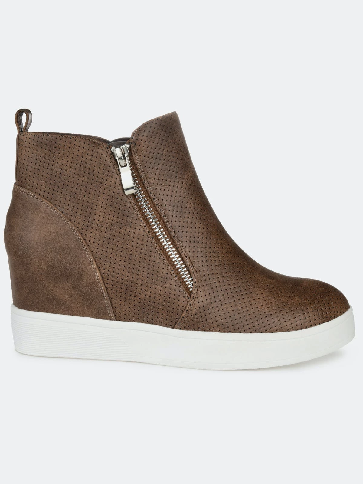 Need a lift? The Pennelope sneaker by Journee Collection features a lofty hidden wedge heel lined with a cushioned footbed for a comfortable elevation. Round perforations cover this vegan leather design, and silver tone zippers at the sides finish the look.