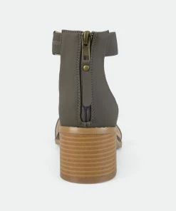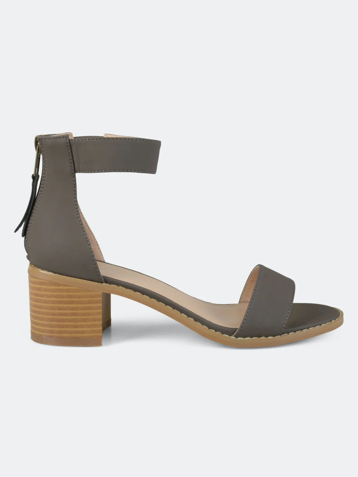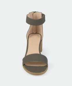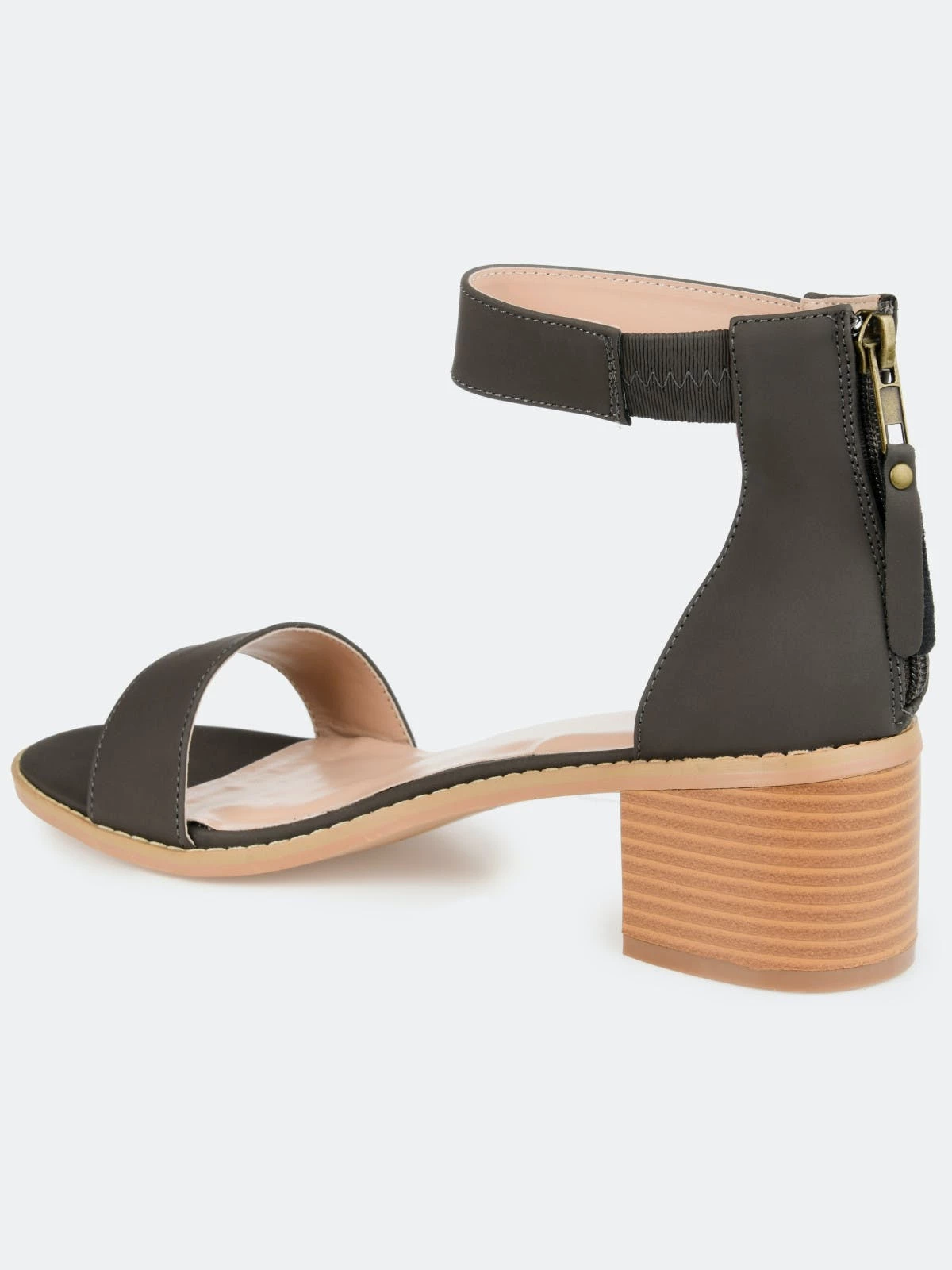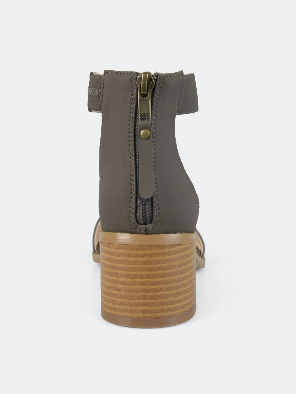 Show off stylish design with strappy heeled sandals by Journee Collection. These open-toe sandals feature faux nubuck uppers with ankle straps that connect to closed back heels and highlight tasseled zipper detail.Heel Height:2-inchHeel Type: Stacked Platform Height:1/2-inchShoe Width: MediumClosure Type: Back Heel ZipStrap Type: Ankle CuffToe Style: OpenLining: Faux LeatherUpper Material: Faux NubuckOutersole Material: Man-madeFootbed: PaddedAll measurements are approximate and were taken using a size 6. Please note measurements may vary slightly by size.