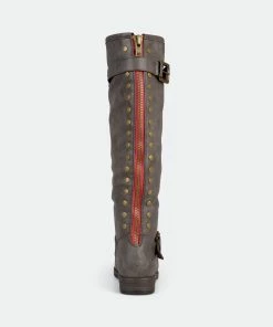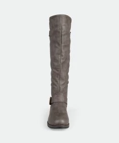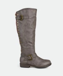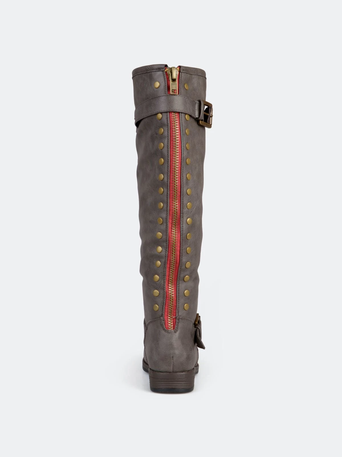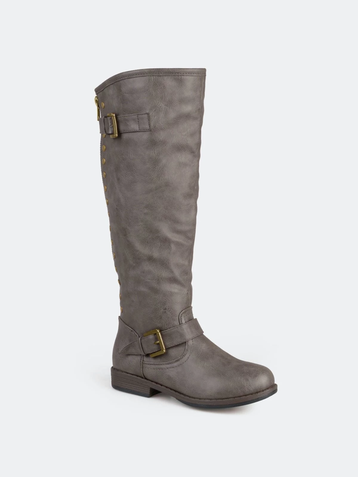 Set the trend this season in studded riding boots by Journee Collection. These chic boots feature premium faux leather uppers that rise to a knee height and feature a back zipper with stud detail. This boot is also available in a wide-calf boot style.Heel Height: 1-inch. Heel Type: Stacked. Platform Height: 1/2-inch. Shaft Height: 15 1/2 inches. Calf Circumference: 15 1/2 inches. Top Circumference: 16 1/4 inches. Shoe Width: Medium. Closure Type: Back Heel Zip. Toe Style: Round. Lining: Faux Fur. Upper Material: Faux Leather. Outersole Material: Man-made. Footbed: Padded. All measurements are approximate and were taken using a size 6. Please note measurements may vary slightly by size.