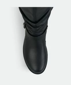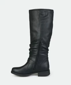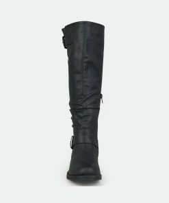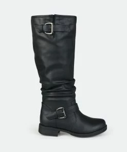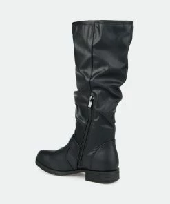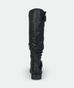 Add classic footwear to your style this season in women’s riding boots by Journee Collection. These stylish boots feature premium faux leather that rises below the knees. Straps with buckle embellishment and a classic round toes complete the design.Heel Height: 1-inch. Heel Type: Stacked. Platform Height: 1/2-inch. Shaft Height: 16 inches. Calf Circumference: 14 1/2 inches. Top Circumference: 14 3/4 inches. Shoe Width: Medium. Closure Type: Inside Zip. Toe Style: Round. Lining: Faux Fur. Upper Material: Faux Leather. Outersole Material: Man-made. Footbed: Padded. All measurements are approximate and were taken using a size 6. Please note measurements may vary slightly by size.