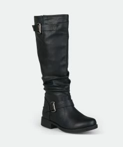 Add classic footwear to your style this season in women’s riding boots by Journee Collection. These stylish boots feature premium faux leather that rises below the knees. Straps with buckle embellishment and a classic round toes complete the design.Heel Height: 1-inch. Heel Type: Stacked. Platform Height: 1/2-inch. Shaft Height: 16 inches. Calf Circumference: 14 1/2 inches. Top Circumference: 14 3/4 inches. Shoe Width: Medium. Closure Type: Inside Zip. Toe Style: Round. Lining: Faux Fur. Upper Material: Faux Leather. Outersole Material: Man-made. Footbed: Padded. All measurements are approximate and were taken using a size 6. Please note measurements may vary slightly by size.
