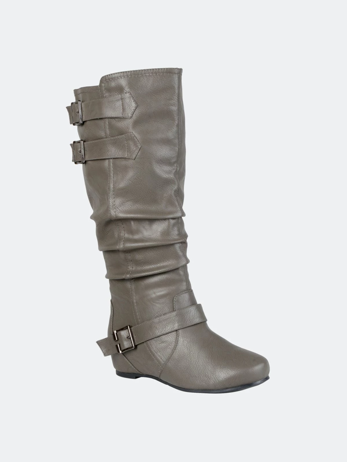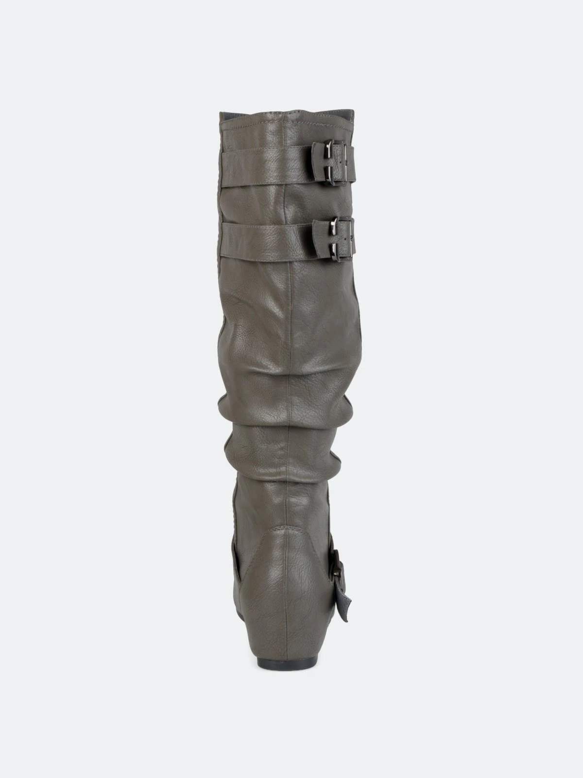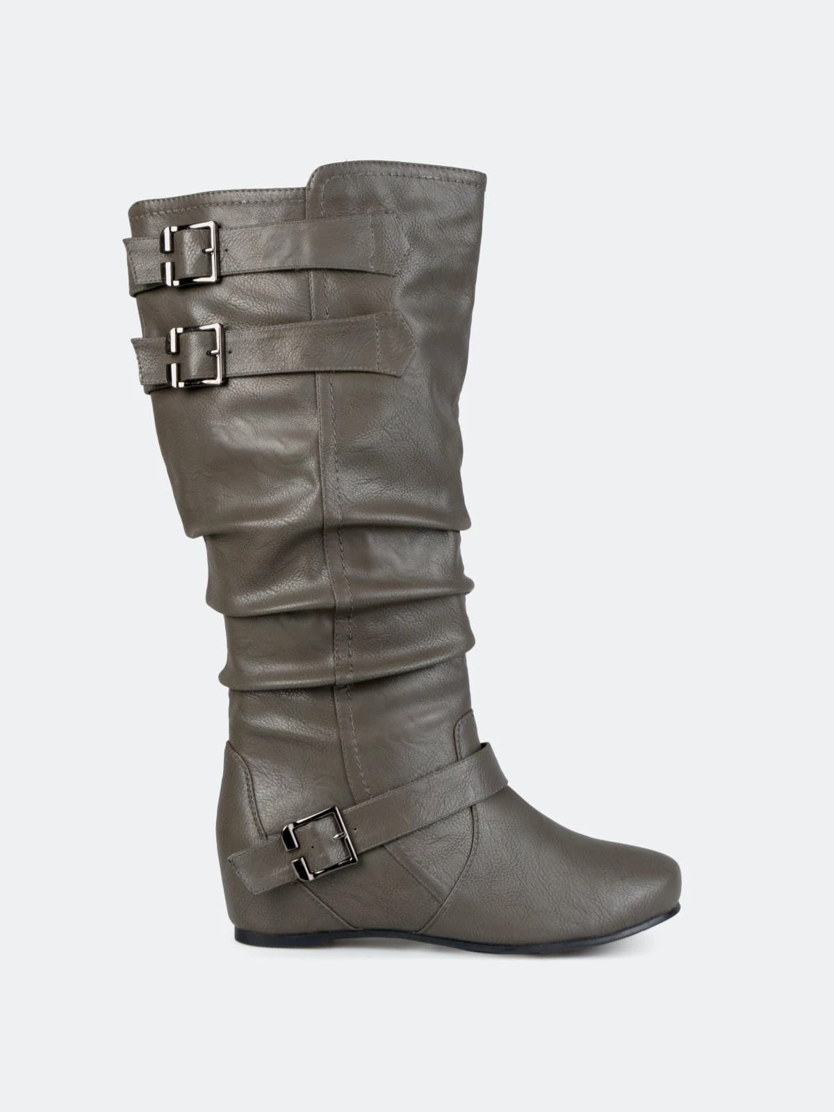Express your style in chic flat boots by Journee Collection. These cute boots feature faux leather uppers that rise mid-calf and highlight slouchy detail on the shafts for a relaxed look. Straps with buckles accent the ankles and shafts.Heel Height: 2 1/4-inch. Heel Type: Hidden Wedge. Platform Height: 1/2-inch. Shaft Height: 14 inches. Calf Circumference: 14 3/4 inches. Top Circumference: 15 1/4 inches. Shoe Width: Medium. Closure Type: Pull-on. Toe Style: Round. Lining: Fabric. Upper Material: Faux Leather. Outersole Material: Man-made. Footbed: Padded. All measurements are approximate and were taken using a size 6. Please note measurements may vary slightly by size.
