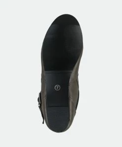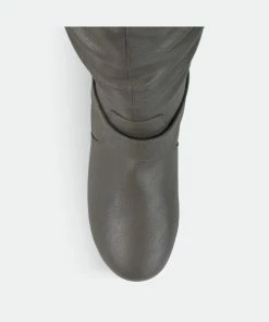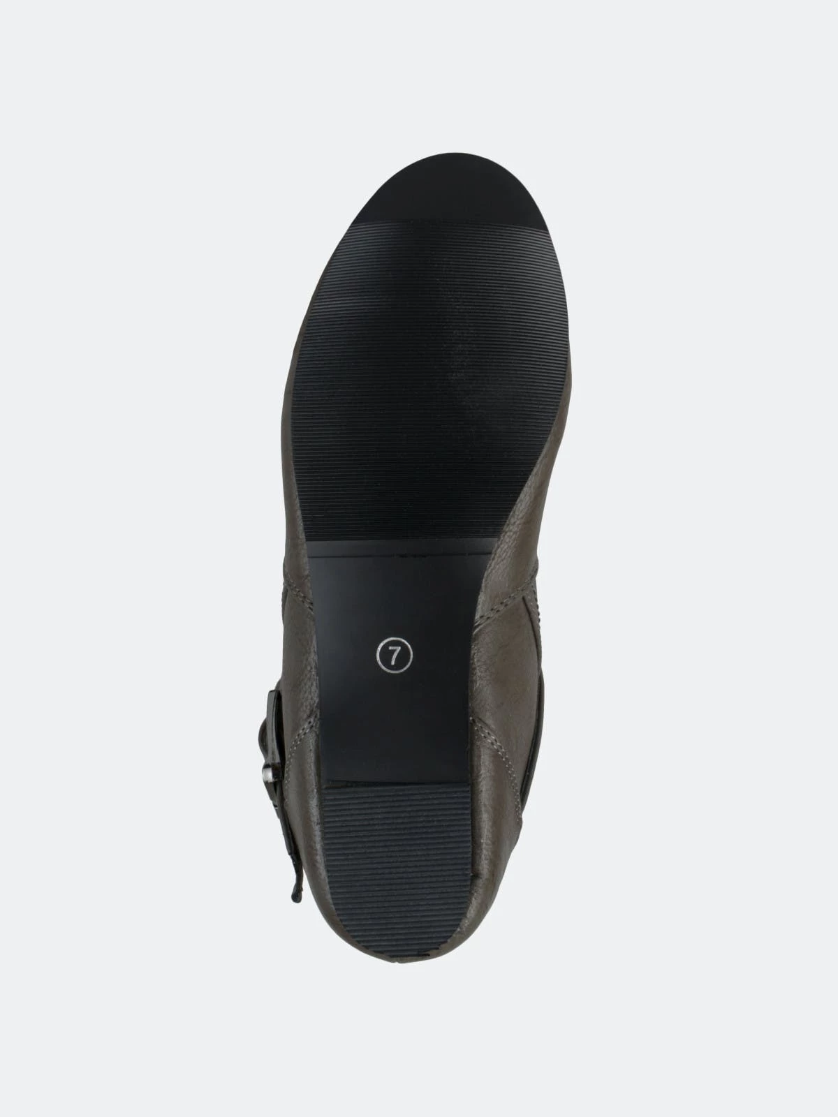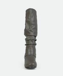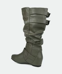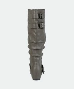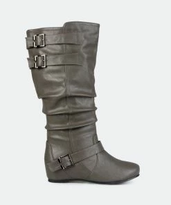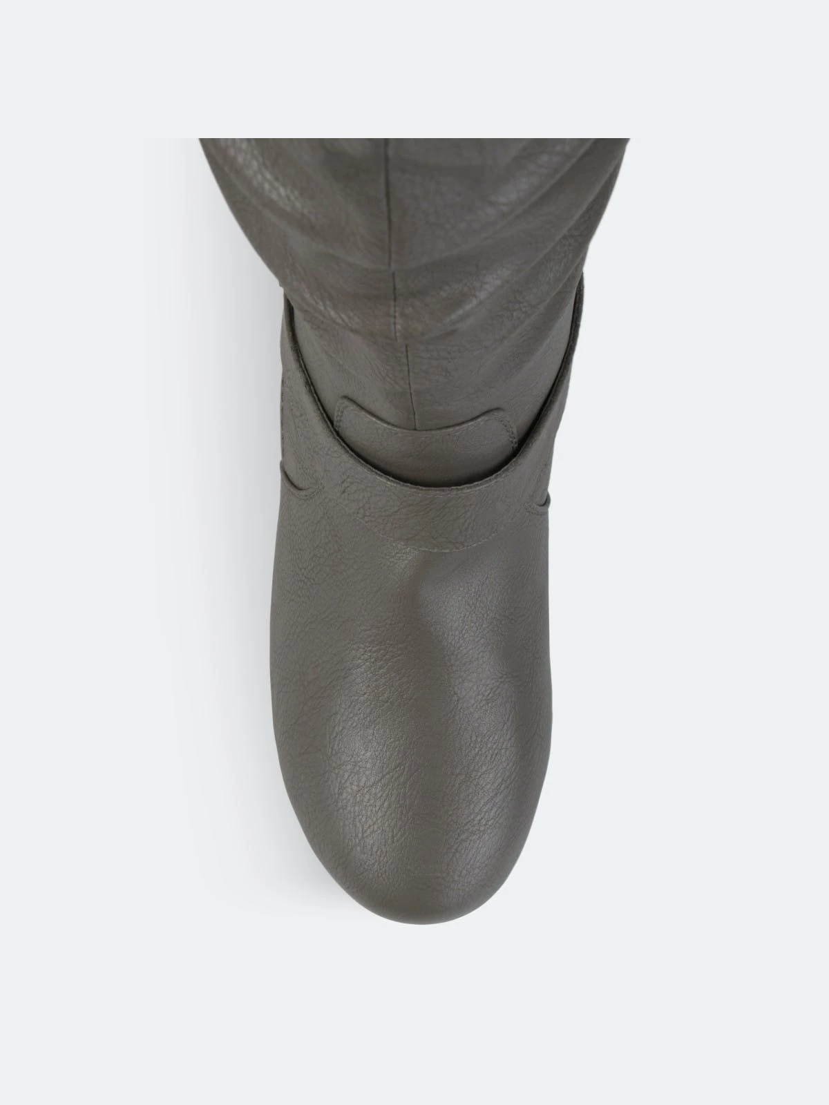 Express your style in chic flat boots by Journee Collection. These cute boots feature faux leather uppers that rise mid-calf and highlight slouchy detail on the shafts for a relaxed look. Straps with buckles accent the ankles and shafts.Heel Height: 2 1/4-inch. Heel Type: Hidden Wedge. Platform Height: 1/2-inch. Shaft Height: 14 inches. Calf Circumference: 14 3/4 inches. Top Circumference: 15 1/4 inches. Shoe Width: Medium. Closure Type: Pull-on. Toe Style: Round. Lining: Fabric. Upper Material: Faux Leather. Outersole Material: Man-made. Footbed: Padded. All measurements are approximate and were taken using a size 6. Please note measurements may vary slightly by size.