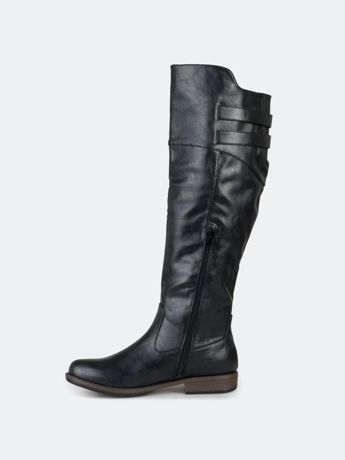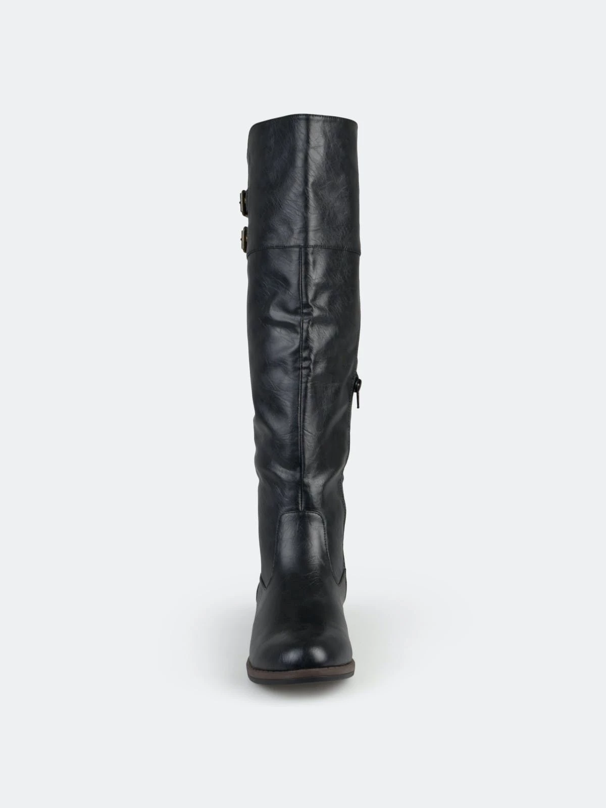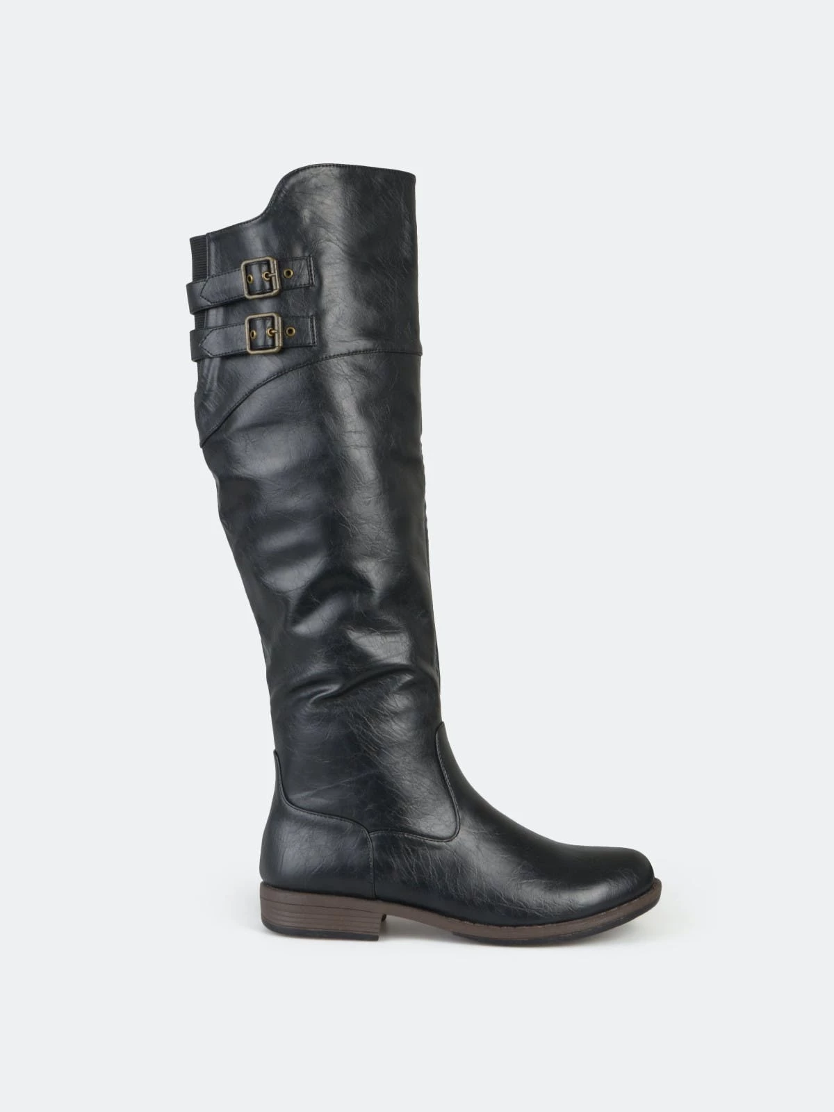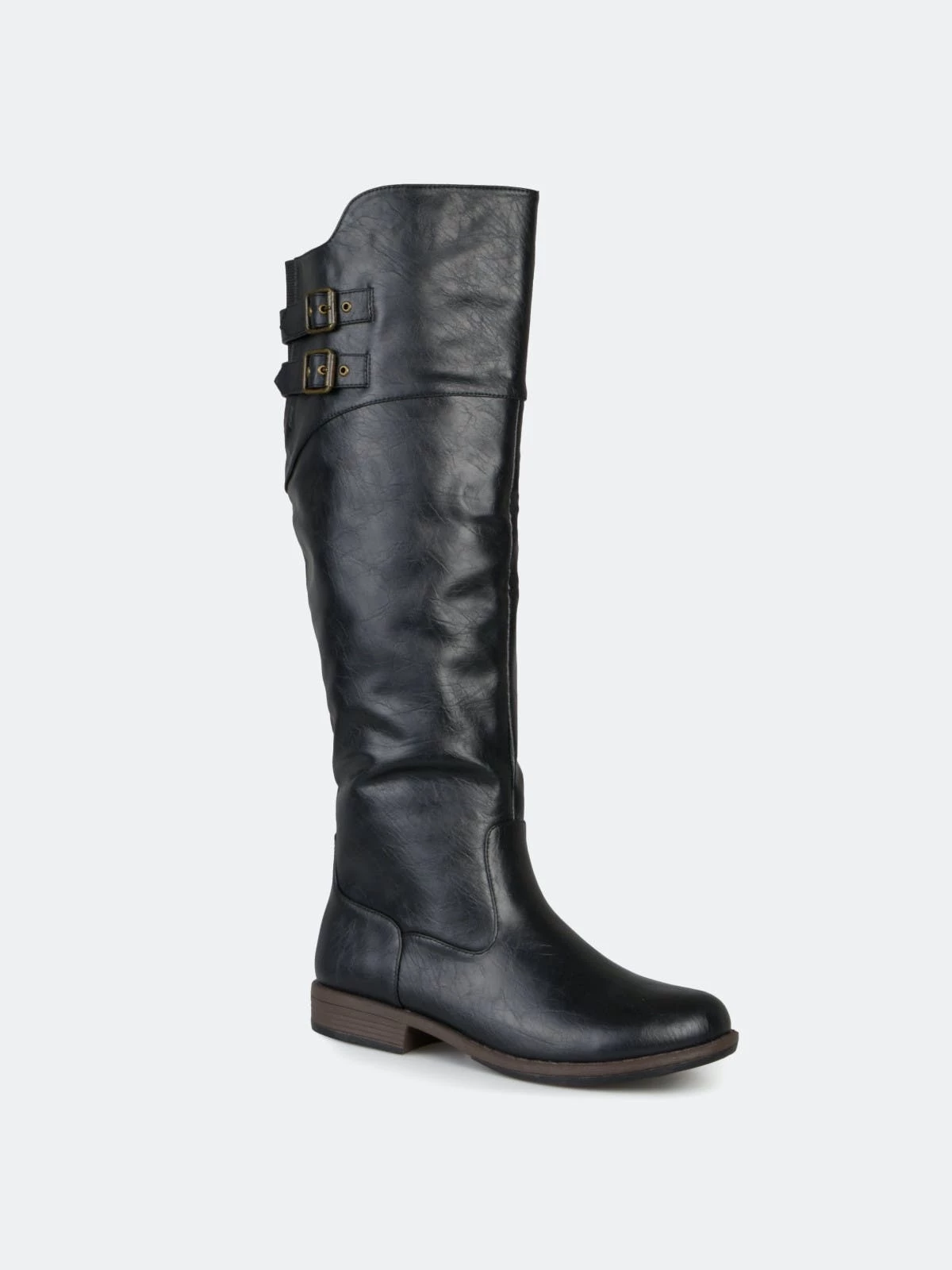 Take on the season in the chicest riding boots this year by Journee Collection. These knee-high boots highlight premium uppers that rise to the knees. Contrasting outsoles and double strap detail with buckle accents completes the look.Heel Height: 1-inch. Heel Type: Stacked. Platform Height: 1/2-inch. Shaft Height: 17 inches. Calf Circumference: 15 1/2 inches. Top Circumference: 15 3/4 inches. Shoe Width: Medium. Closure Type: Inside Zip. Toe Style: Round. Lining: Fabric. Upper Material: Faux Leather. Outersole Material: Man-made. Footbed: Padded. All measurements are approximate and were taken using a size 6. Please note measurements may vary slightly by size.