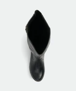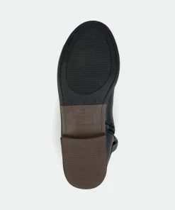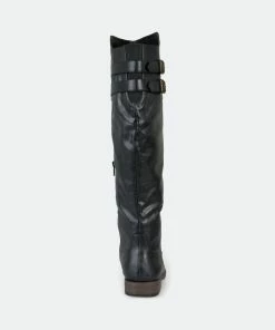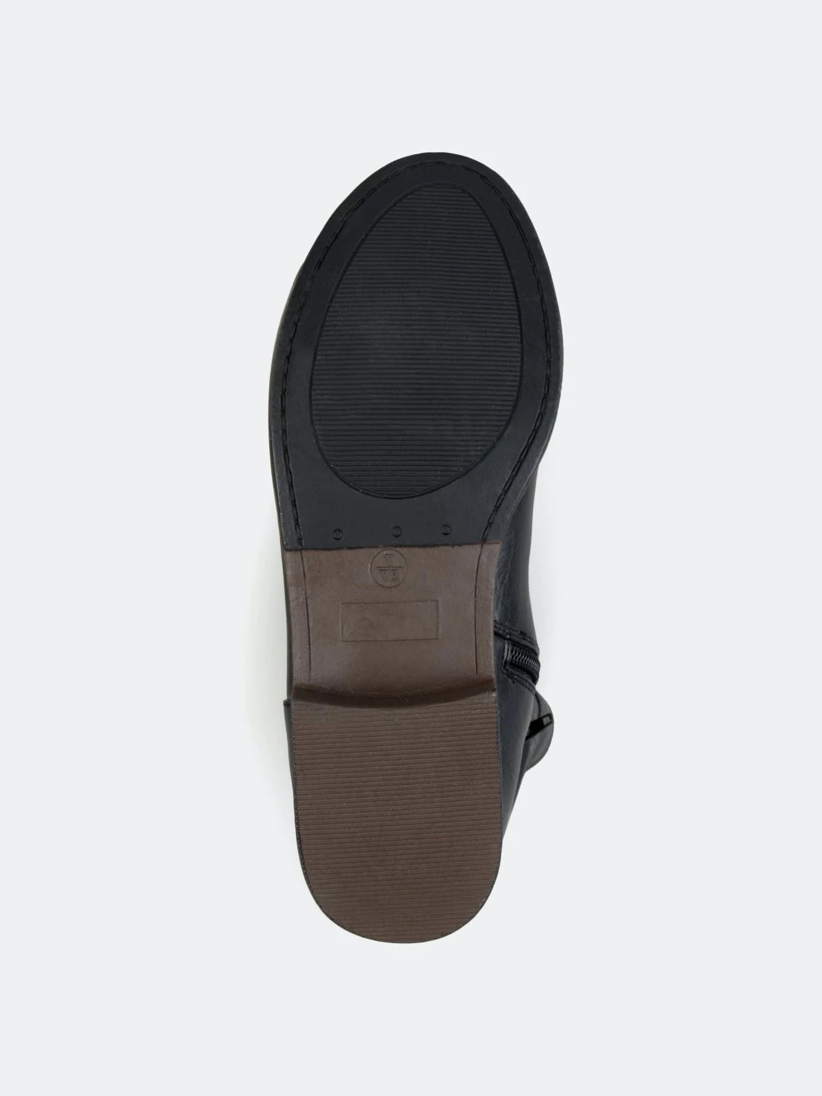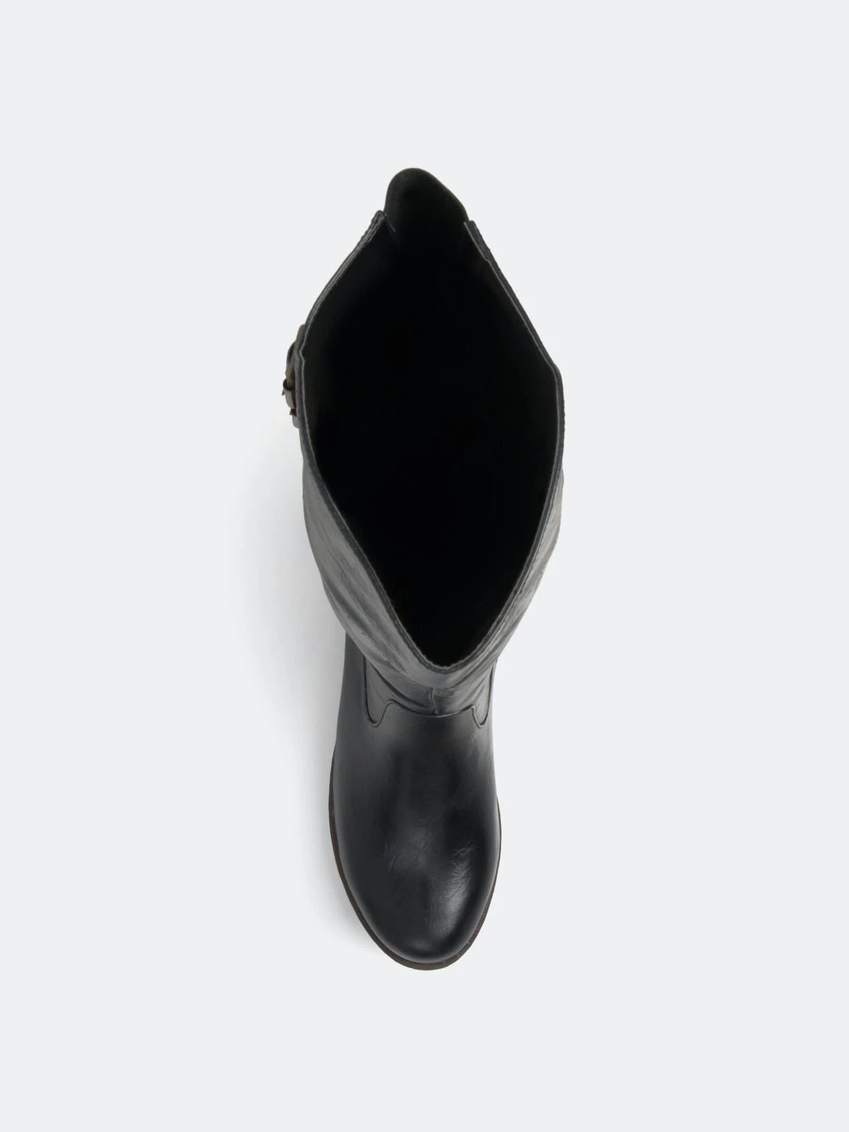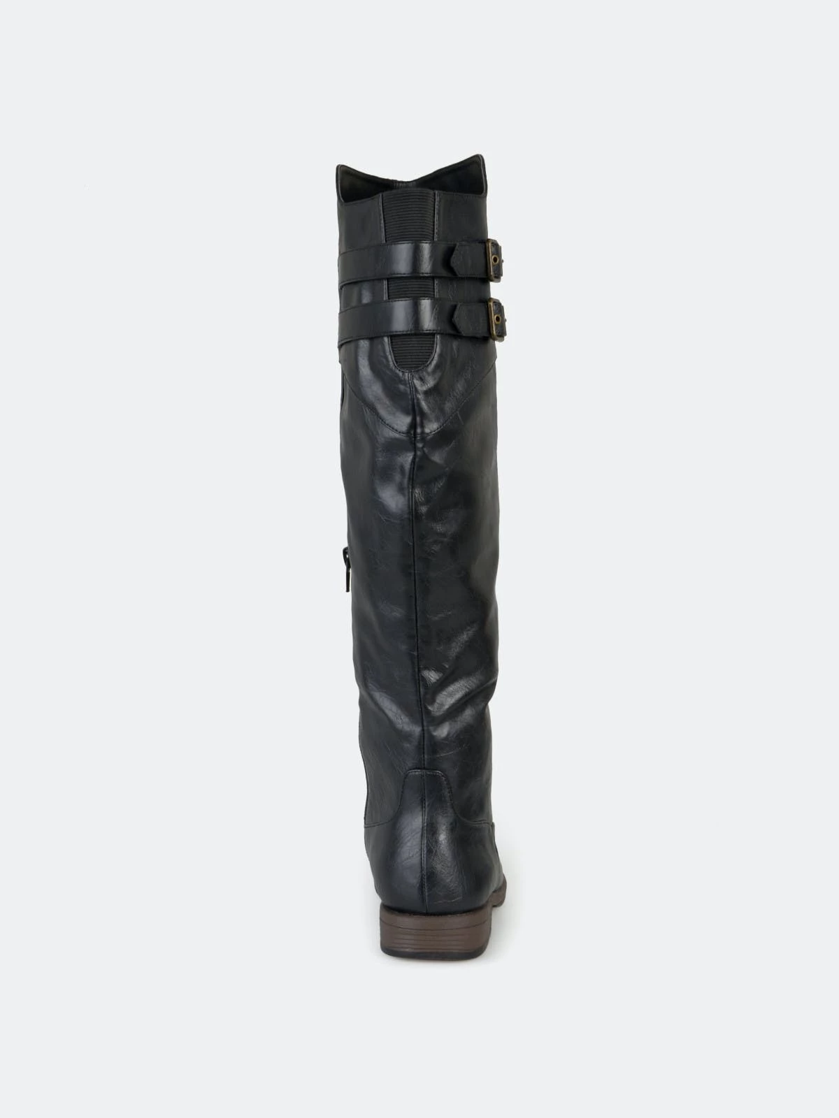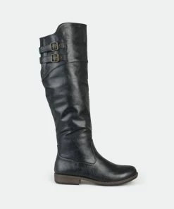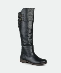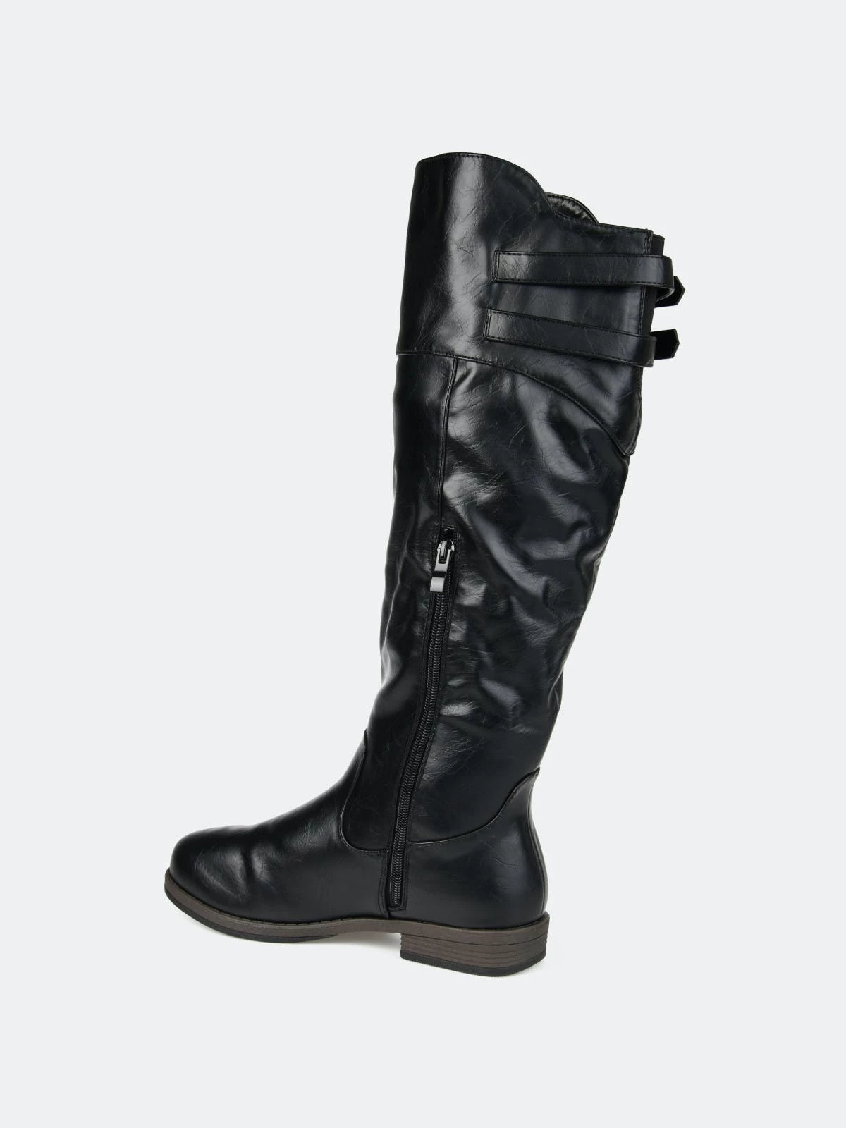 Take on the season in the chicest riding boots this year by Journee Collection. These knee-high boots highlight premium uppers that rise to the knees. Contrasting outsoles and double strap detail with buckle accents completes the look.Heel Height: 1-inch. Heel Type: Stacked. Platform Height: 1/2-inch. Shaft Height: 17 inches. Calf Circumference: 15 1/2 inches. Top Circumference: 15 3/4 inches. Shoe Width: Medium. Closure Type: Inside Zip. Toe Style: Round. Lining: Fabric. Upper Material: Faux Leather. Outersole Material: Man-made. Footbed: Padded. All measurements are approximate and were taken using a size 6. Please note measurements may vary slightly by size.