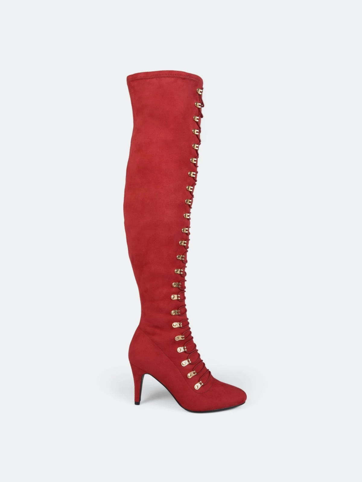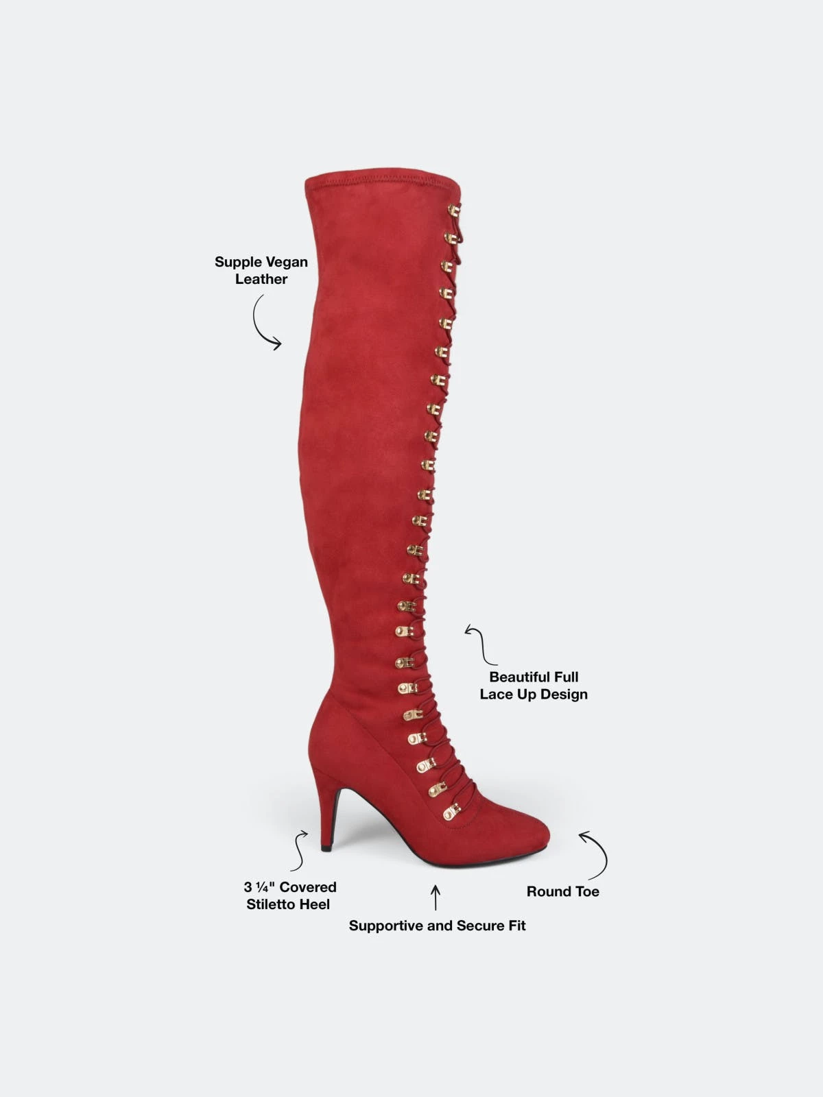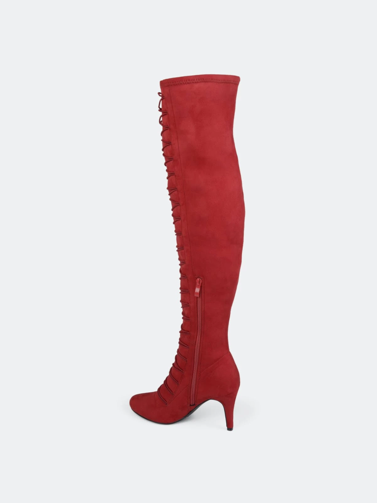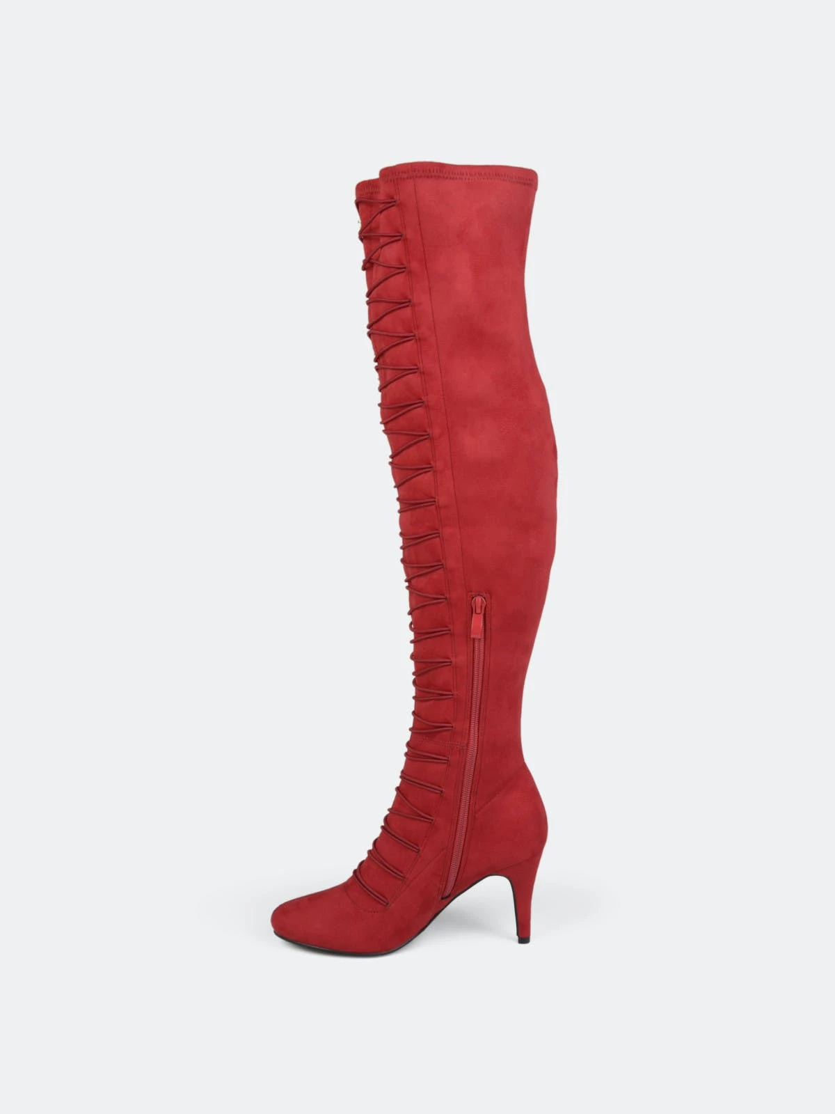 Add sizzling style to your look in over-the-knee high-heel boots by Journee Collection. Soft faux suede uppers rise above the knees and highlight a vintage inspired lace-up design accented with metal detailing.Heel Height: 3 1/4-inch. Heel Type: Heel. Platform Height: 1/2-inch. Shaft Height: 23 inches. Calf Circumference: 13 3/4 inches. Top Circumference: 15 1/2 inches. Shoe Width: Medium. Closure Type: Inside Zip. Toe Style: Round. Lining: Fabric. Upper Material: Faux Suede. Outersole Material: Faux Suede over Synthetic. Footbed: Padded. All measurements are approximate and were taken using a size 6. Please note measurements may vary slightly by size.