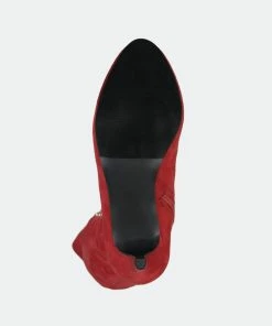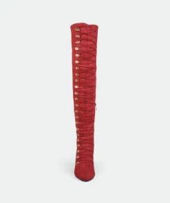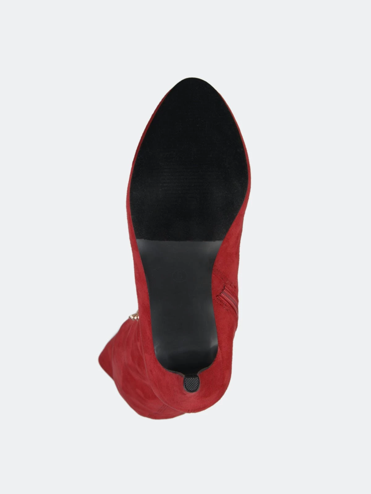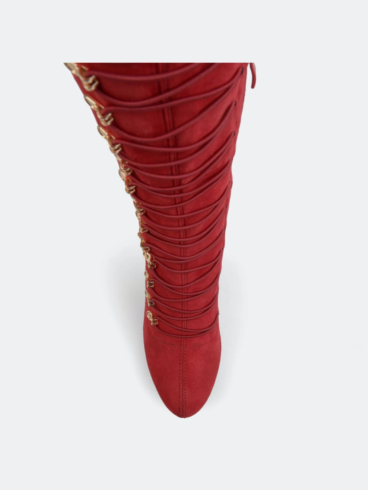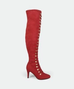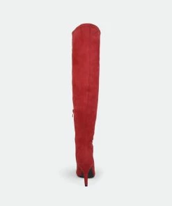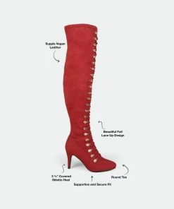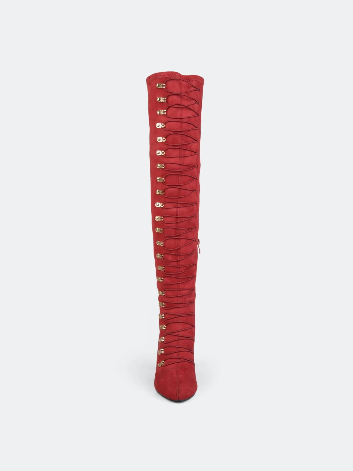 Add sizzling style to your look in over-the-knee high-heel boots by Journee Collection. Soft faux suede uppers rise above the knees and highlight a vintage inspired lace-up design accented with metal detailing.Heel Height: 3 1/4-inch. Heel Type: Heel. Platform Height: 1/2-inch. Shaft Height: 23 inches. Calf Circumference: 13 3/4 inches. Top Circumference: 15 1/2 inches. Shoe Width: Medium. Closure Type: Inside Zip. Toe Style: Round. Lining: Fabric. Upper Material: Faux Suede. Outersole Material: Faux Suede over Synthetic. Footbed: Padded. All measurements are approximate and were taken using a size 6. Please note measurements may vary slightly by size.