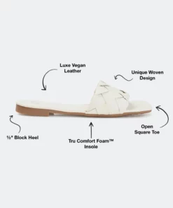 Instantly upgrade any outfit with the Cassay by Journee Collection. This slide-on sandal has the perfect balance between upscale and casual with woven details and square toe. A 5 mm Tru Comfort Foam™ footbed and smooth vegan leather finish this easy sandal.Heel Height:1/2-inchHeel Type: Block Heel Platform Height:Flat-inchShoe Width: MediumClosure Type: Slip-onToe Style: OpenLining: Faux LeatherUpper Material: Vegan LeatherOutersole Material: Man-madeFootbed: 5 MM Tru Comfort Foam™All measurements are approximate and were taken using a size 6. Please note measurements may vary slightly by size.