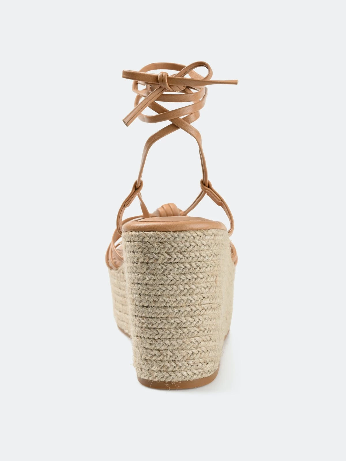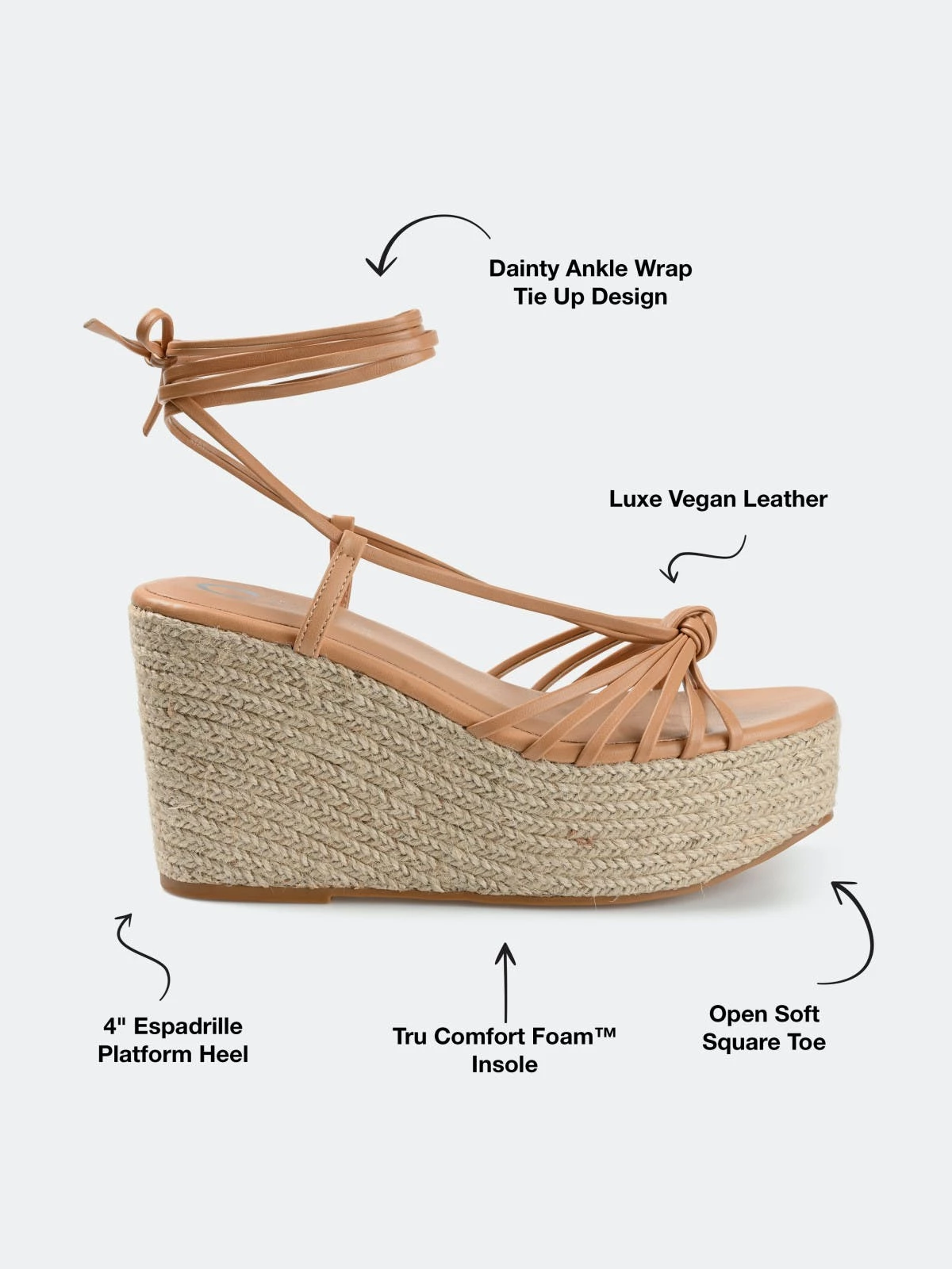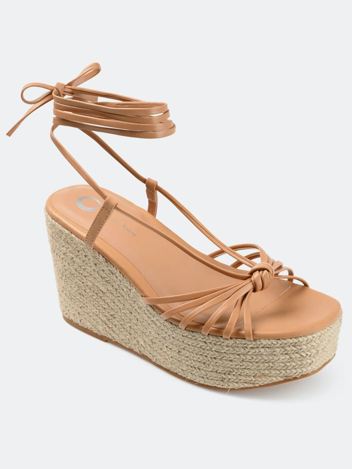 With the Catalinn by Journee Collection, you can bring on the summer vibes. The multi-straps on this tie-up shoe are guaranteed to brighten up your day. Soft vegan leather uppers, a 4 mm Tru Comfort Foam™ footbed, and an espadrille-wrapped platform heel add texture to the design.Heel Height:4-inchHeel Type: Platform Platform Height:2-inchShoe Width: MediumClosure Type: Tie UpStrap Type: Ankle WrapToe Style: OpenLining: Faux LeatherUpper Material: Vegan LeatherOutersole Material: Man-madeFootbed: 4 MM Tru Comfort Foam™All measurements are approximate and were taken using a size 6. Please note measurements may vary slightly by size.
