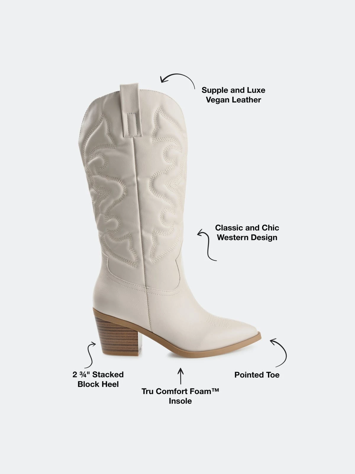 A classic cowgirl bootie reimagined for the modern fashionista, the chantry by journee collection. This pointed-toe boot with western stitch details and soft vegan leather is the most stylish way to embrace your country roots. A block heel and a 4 mm tru comfort foam™ footbed add comfortable height to this mid-calf design. At journee collection, our boot styles will have your outfit looking even better than before. They will give you that finishing touch that will have your outfit looking straight out of a magazine.
