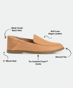 The classic loafer just got better. The Corinne by Journee Collection is an essential flat styled with twin notches and an almond-shaped toe. Soft vegan leather material with a crash back and a 4 mm Tru Comfort Foam™ footbed finishes this comfortable look.Heel Height:1/2-inchHeel Type: Block Heel Platform Height:Flat-inchShoe Width: MediumClosure Type: Slip-onToe Style: AlmondLining: Faux LeatherUpper Material: Vegan LeatherOutersole Material: Man-madeFootbed: 4 MM Tru Comfort Foam™All measurements are approximate and were taken using a size 6. Please note measurements may vary slightly by size.