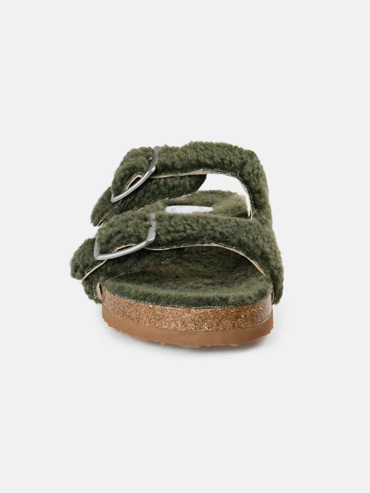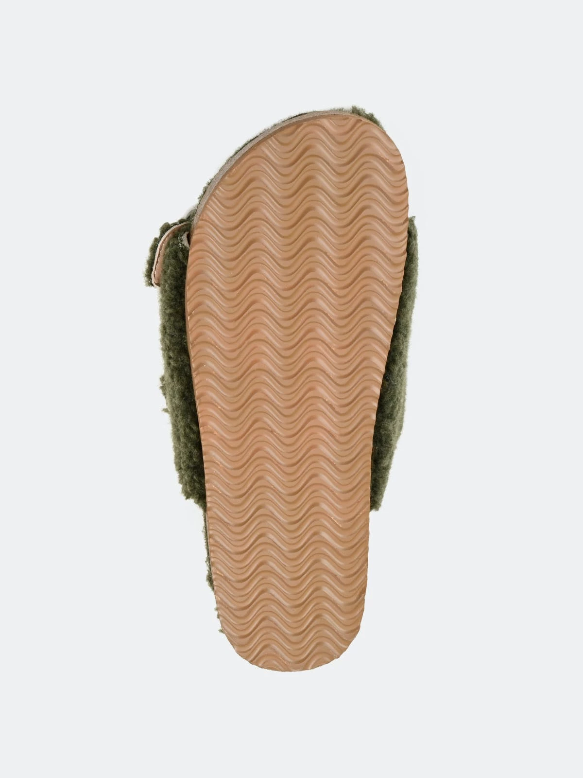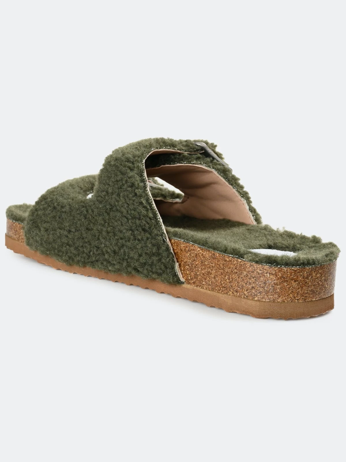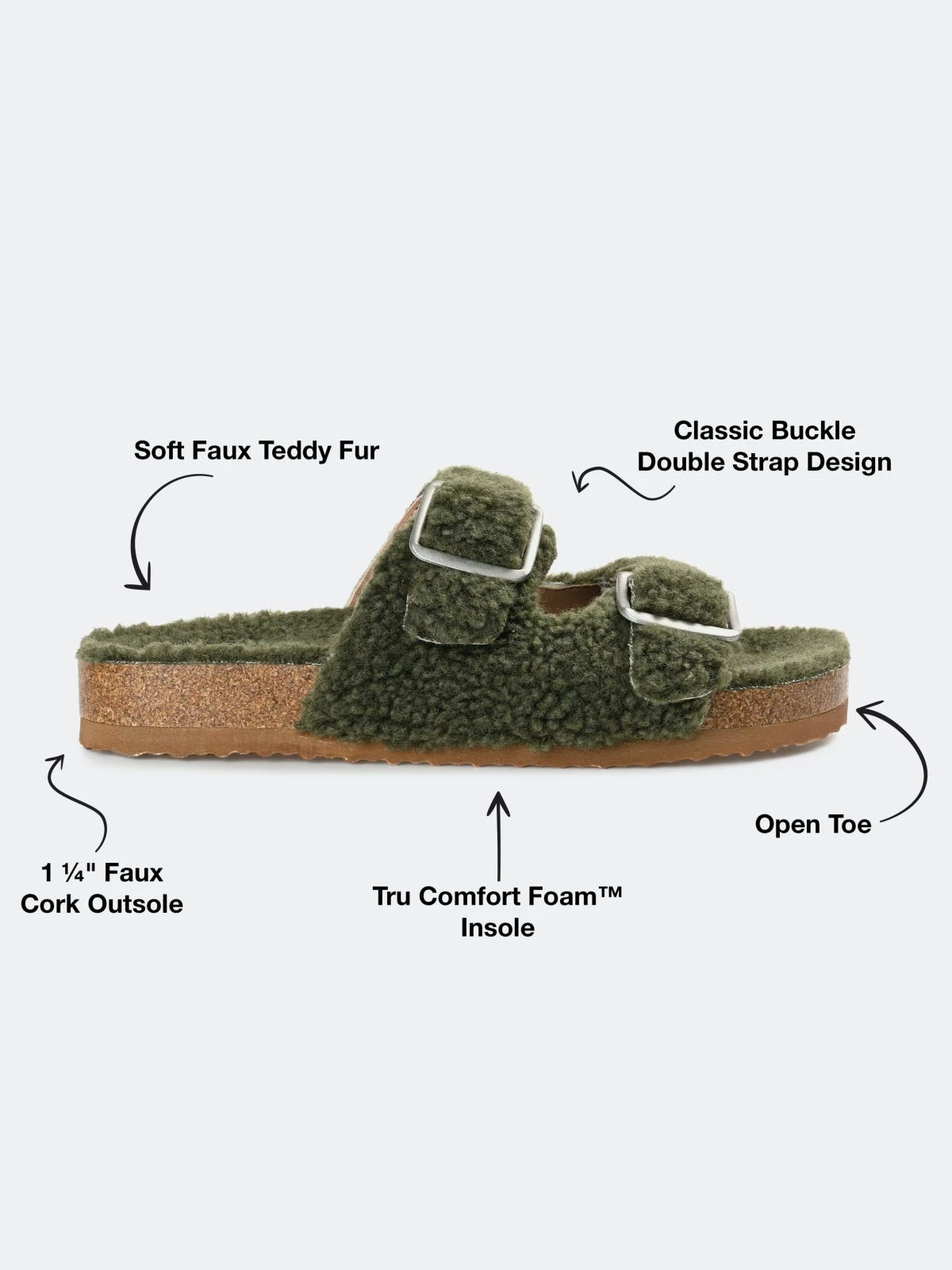 The quintessential slide with a twist, the Delpheen by Journee Collection. This effortless design is covered with the softest teddy bear fur and lined with a 4 mm Tru Comfort Foam™ footbed. A durable outsole and chunky buckles finish the look.Heel Height: 1 1/4-inch. Heel Type: Sole. Platform Height: 1-inch. Shoe Width: Medium. Closure Type: Slip-on. Strap Type: Multi -Strap. Toe Style: Open. Lining: Faux Leather. Upper Material: Faux Fur. Outersole Material: Man-made. Footbed: 4 MM Tru Comfort Foam™. All measurements are approximate and were taken using a size 6. Please note measurements may vary slightly by size.