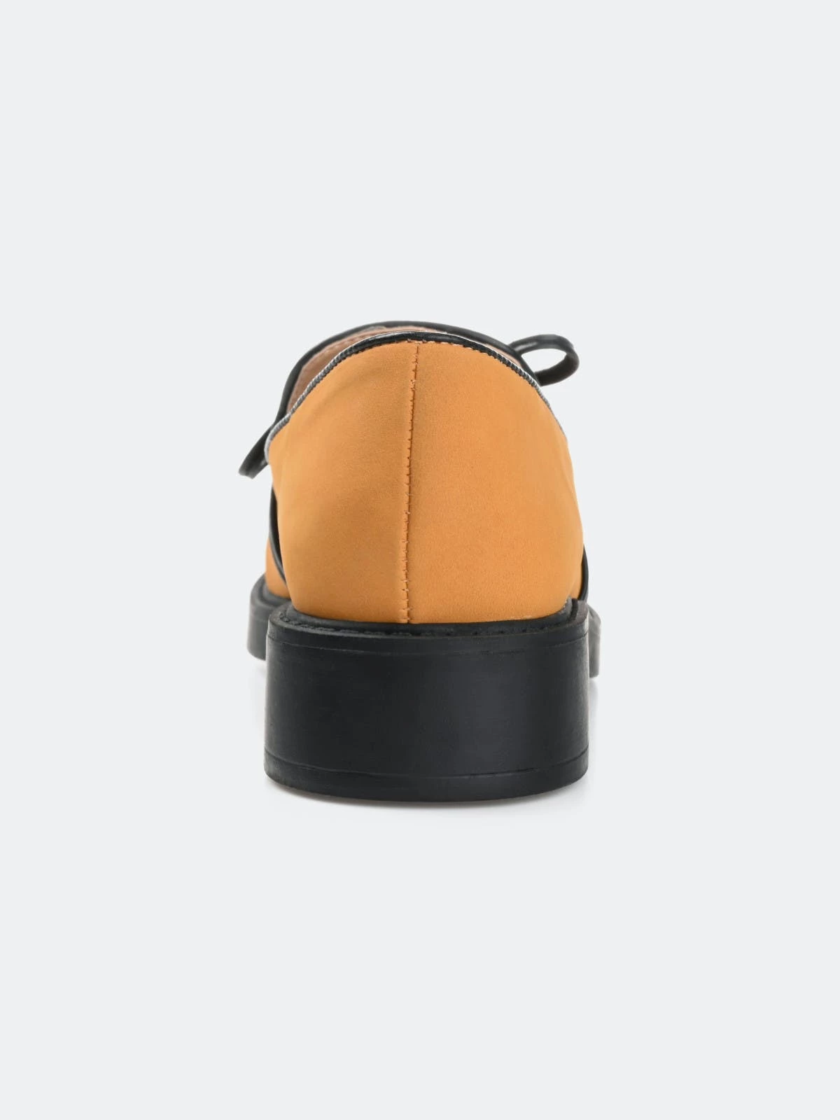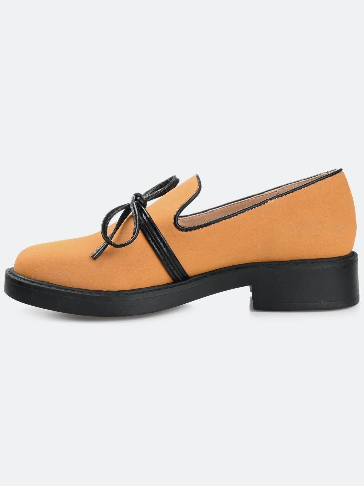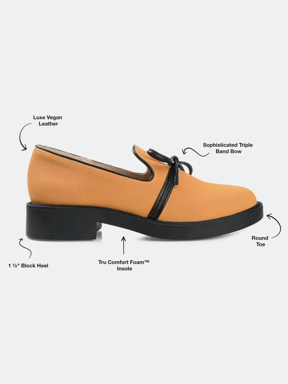 Kick your day off with a retro vibe in the Eilien by Journee Collection. This vegan leather loafer gives any outfit a charming finish with a round-toe and notches at the topline. A 4 mm Tru Comfort Foam™ footbed and a low block heel perfect this comfortable yet classy look.Heel Height:1 1/2-inchHeel Type: Block Heel Platform Height:1-inchShoe Width: MediumClosure Type: Slip-onToe Style: RoundLining: FabricUpper Material: Vegan LeatherOutersole Material: Man-madeFootbed: 4 MM Tru Comfort Foam™All measurements are approximate and were taken using a size 6. Please note measurements may vary slightly by size.