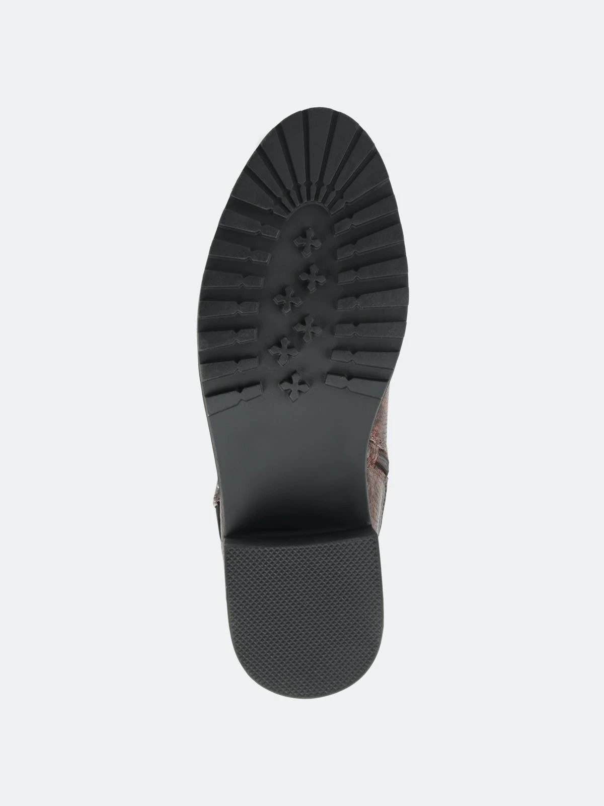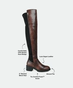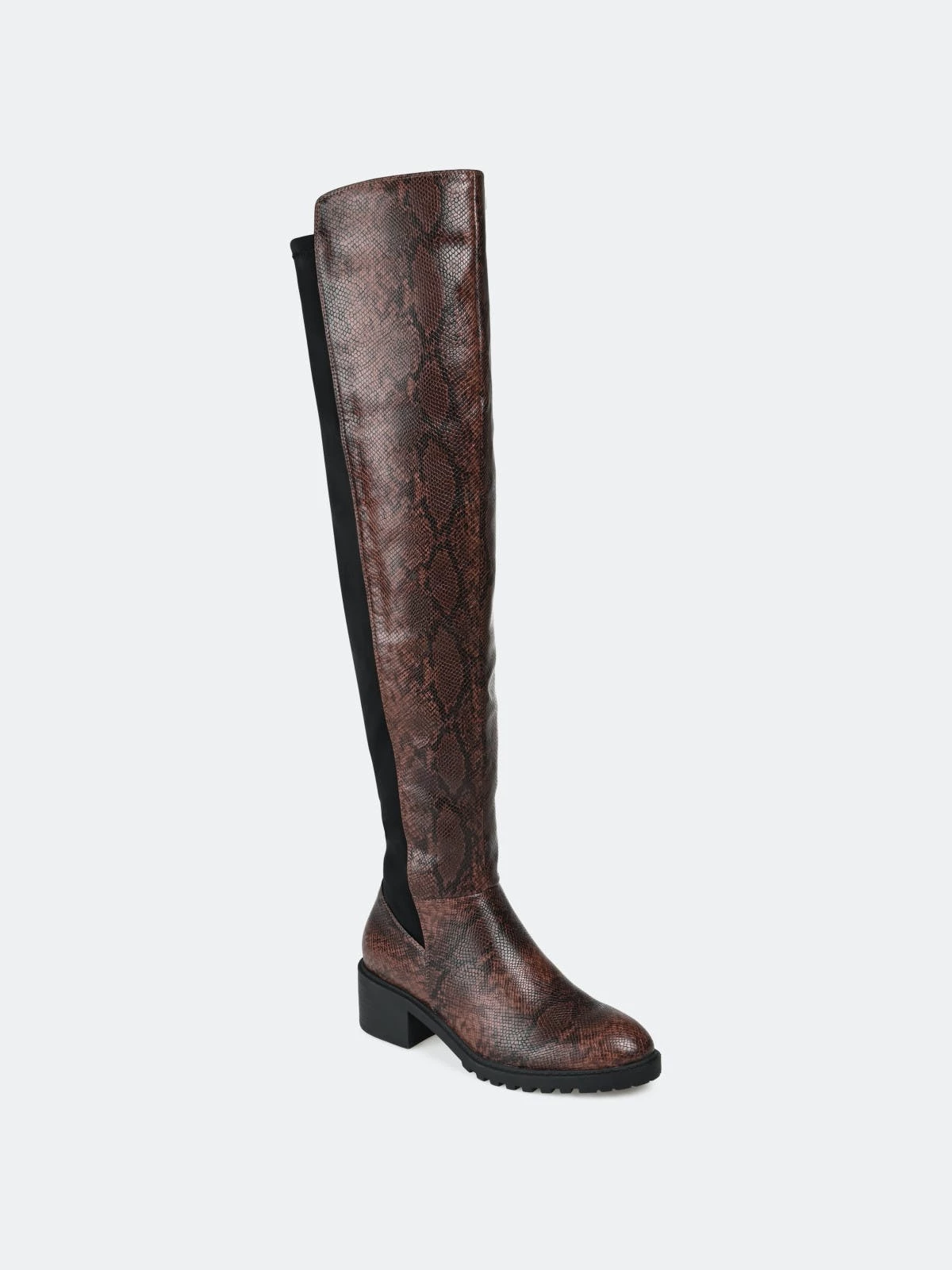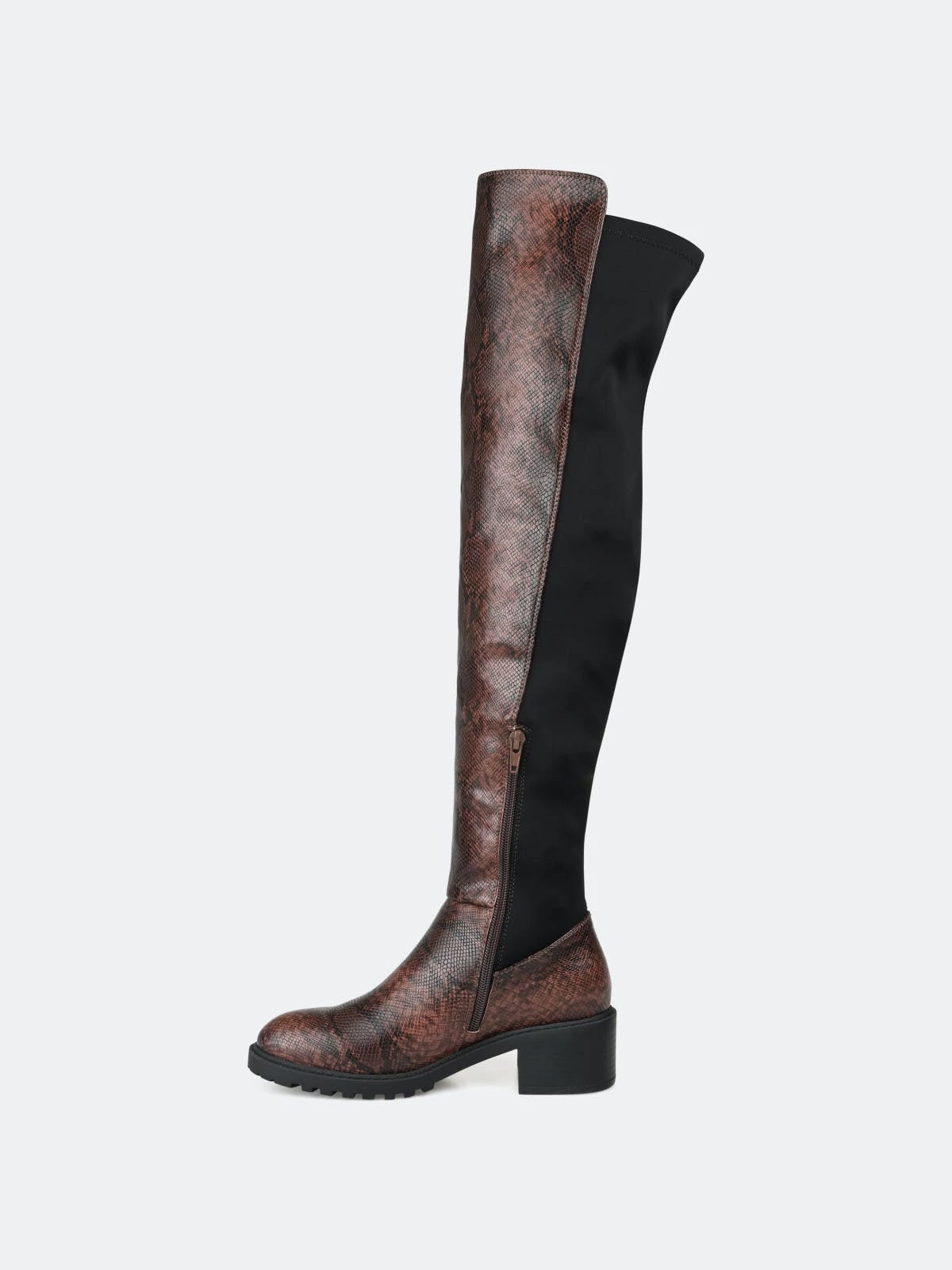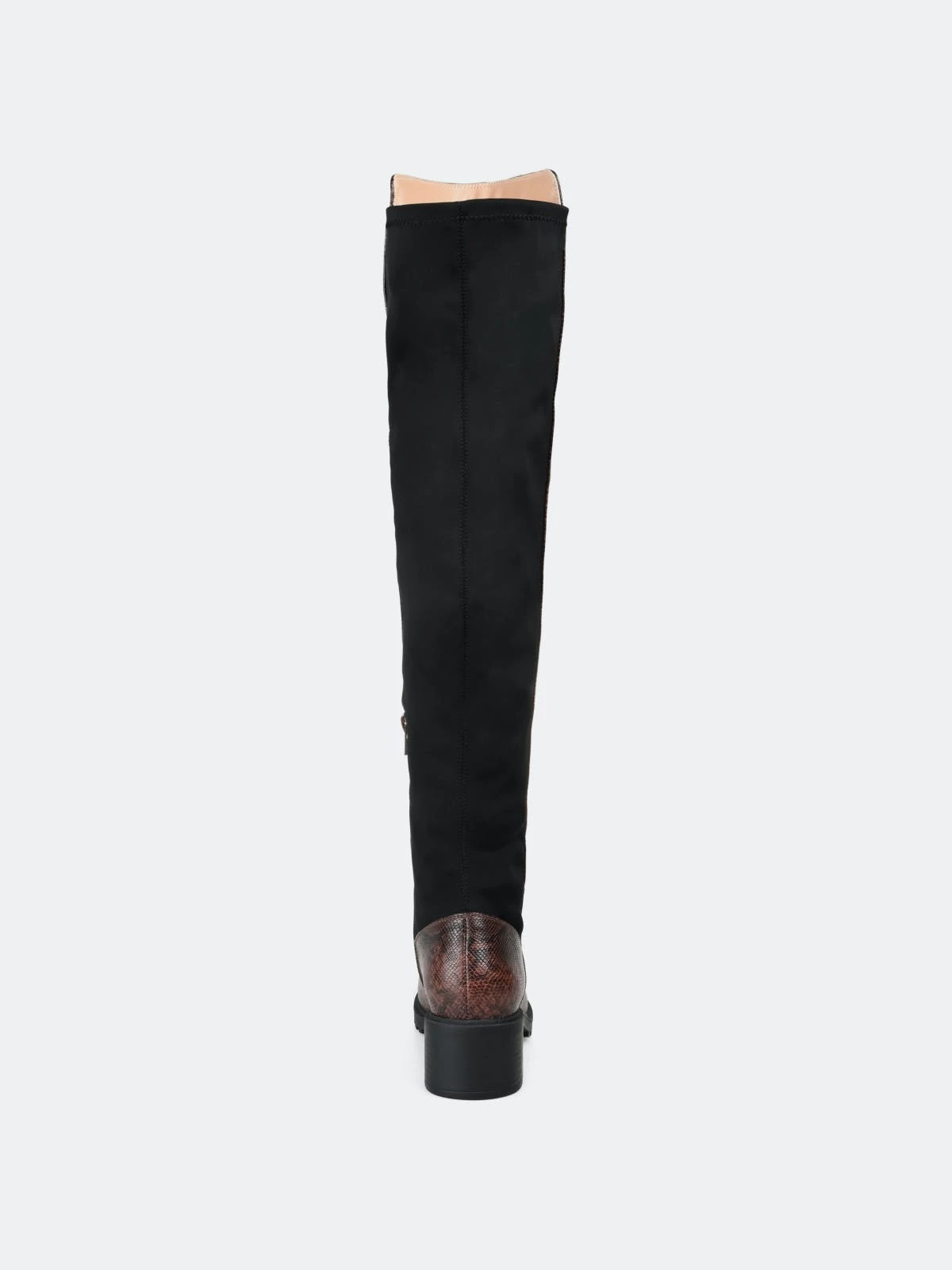 The perfect piece for your next night out, the Aryia by Journee Collection. This extra-wide calf design features textured vegan leather uppers detailed with a stretch gore accent and an inside zipper. A 4 mm Tru Comfort Foam™ footbed and a classic almond-toe finish this over-the-knee style.Heel Height: 2-inch. Heel Type: Stacked. Platform Height: 1/2-inch. Shaft Height: 20 inches. Calf Circumference: 15 1/2 inches. Top Circumference: 18 1/2 inches. Shoe Width: Medium. Closure Type: Inside Zip. Toe Style: Almond. Lining: Fabric. Upper Material: Vegan Leather. Outersole Material: Man-made. Footbed: 4 MM Tru Comfort Foam™. All measurements are approximate and were taken using a size 6. Please note measurements may vary slightly by size.