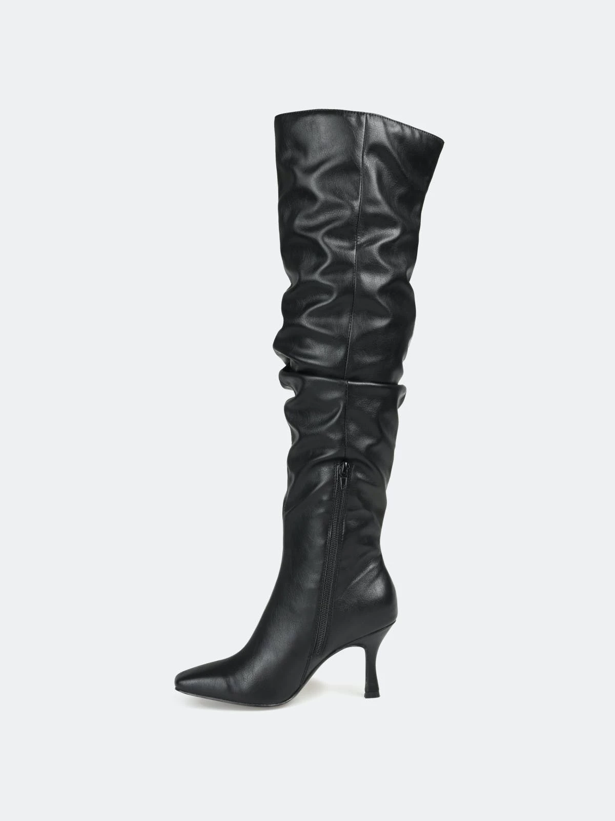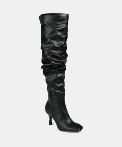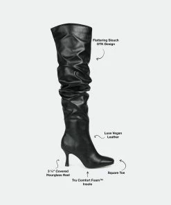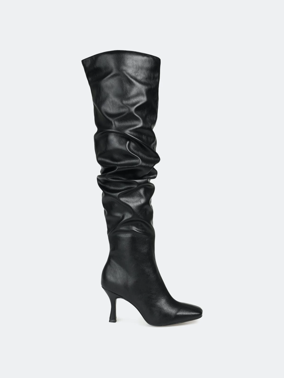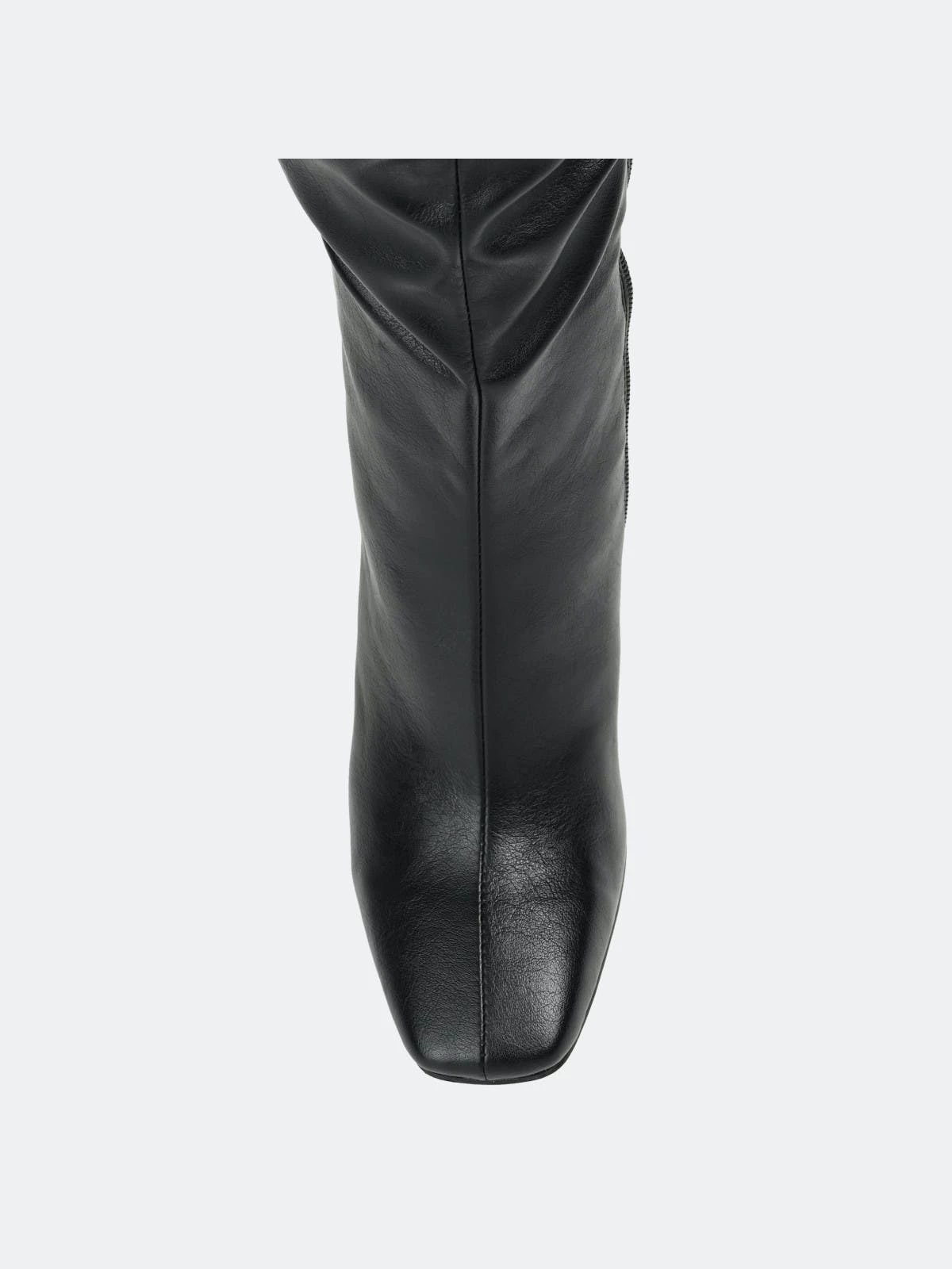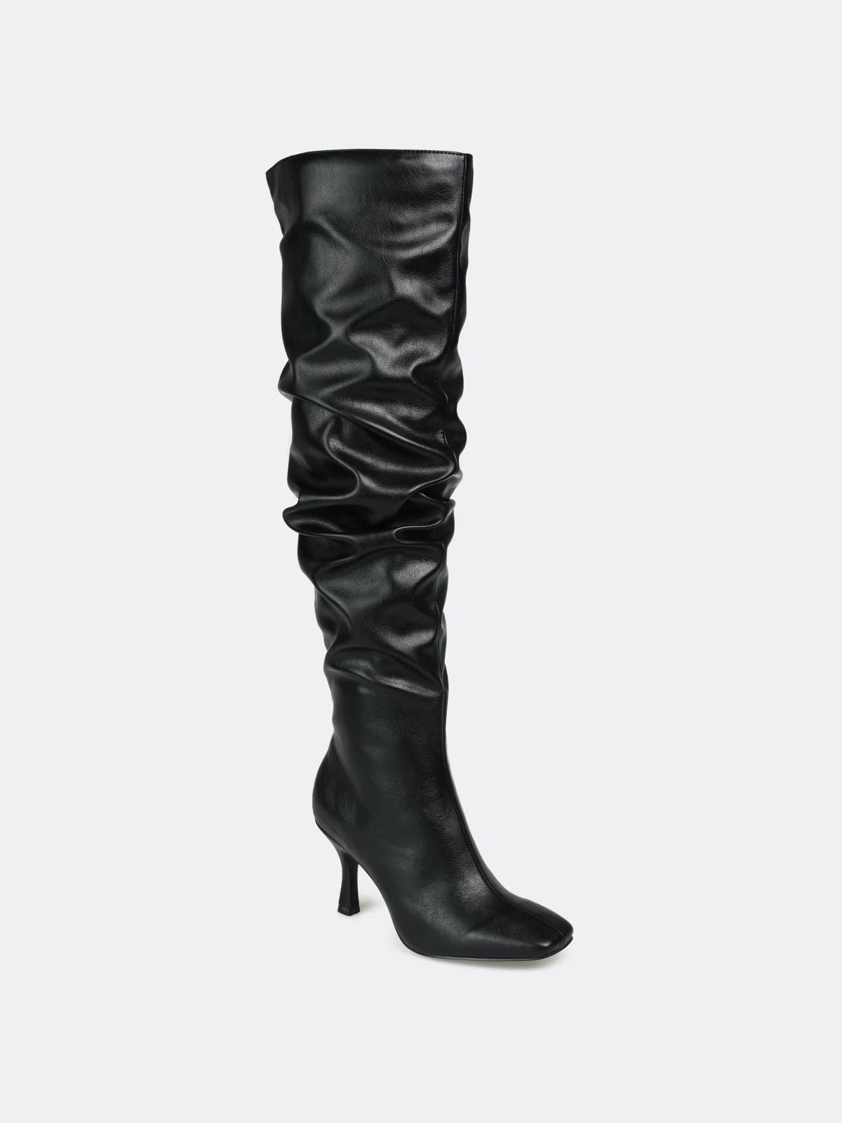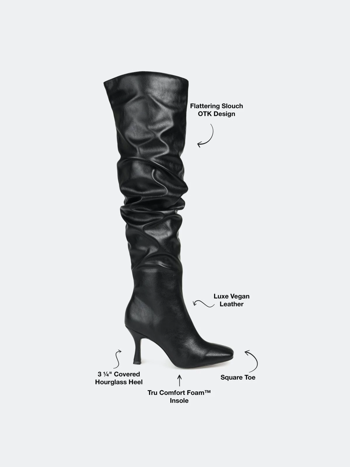 Boots that leave an impression, the Kindy by Journee Collection. This extra-wide calf boot features slouchy details that rise to the knees and soft vegan leather uppers. An hourglass-shaped heel adds a sophisticated finish, and a 4 mm Tru Comfort Foam™ footbed offers the perfect amount of cushion to your step.Heel Height: 3 1/4-inch. Heel Type: Heel. Platform Height: Flat-inch. Shaft Height: 18 1/2 inches. Calf Circumference: 16 inches. Top Circumference: 18 inches. Shoe Width: Medium. Closure Type: Inside Zip. Toe Style: Square. Lining: Fabric. Upper Material: Vegan Leather. Outersole Material: Man-made. Footbed: 4 MM Tru Comfort Foam™. All measurements are approximate and were taken using a size 6. Please note measurements may vary slightly by size.