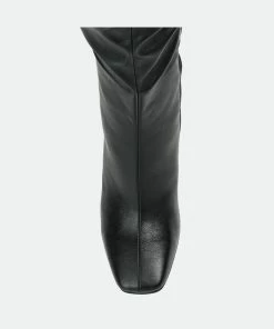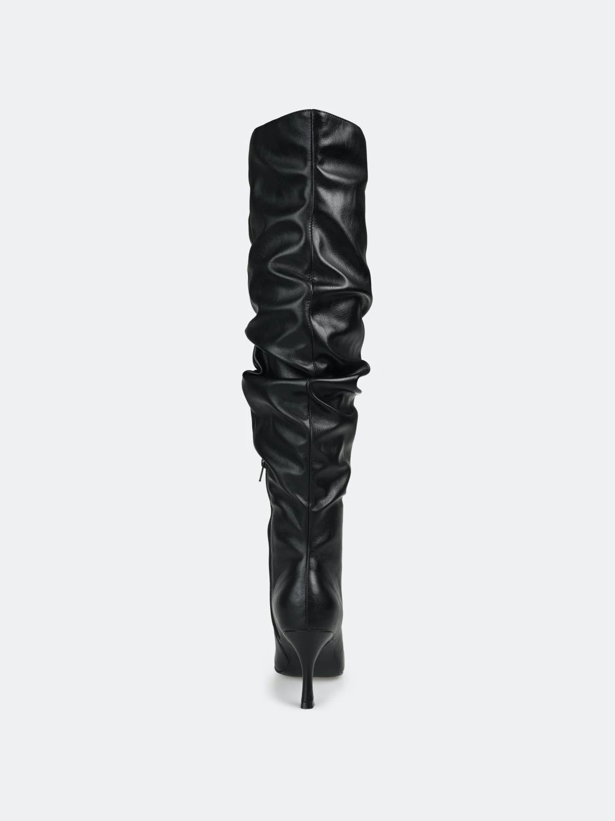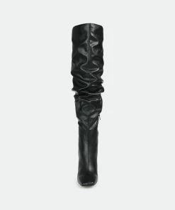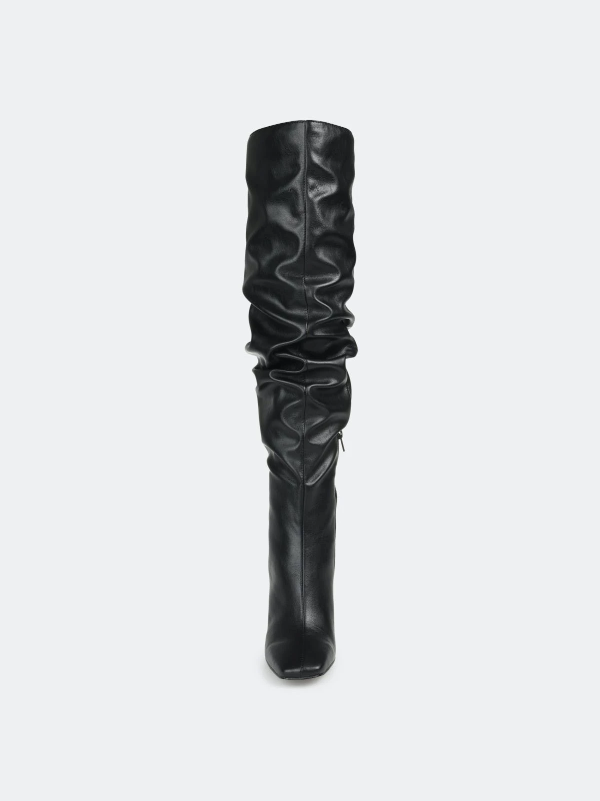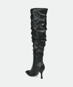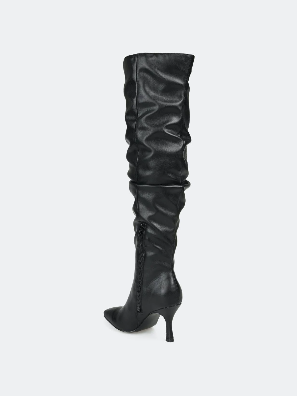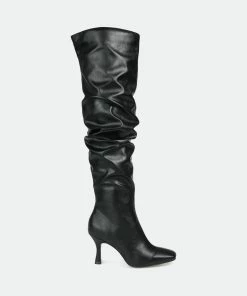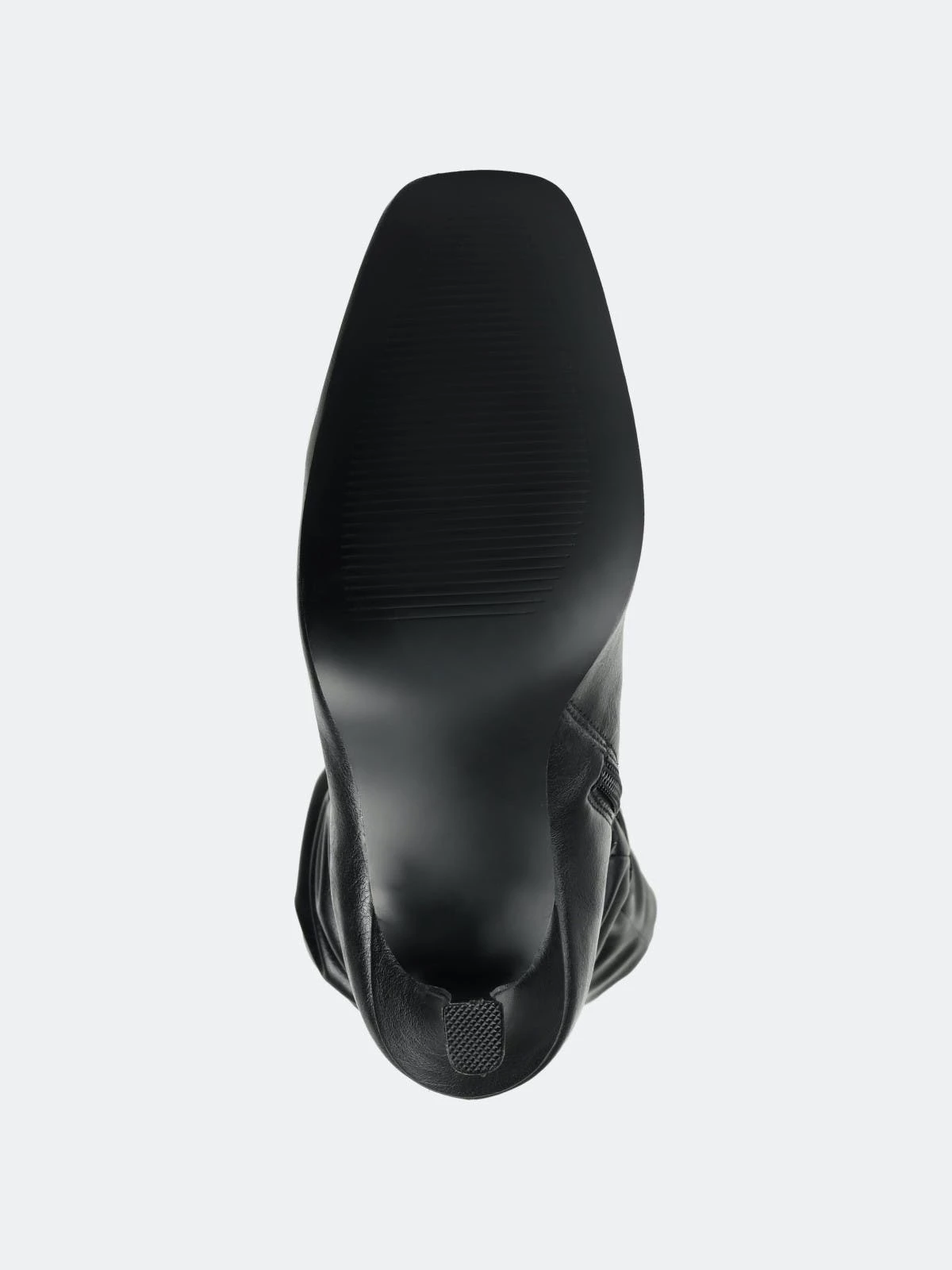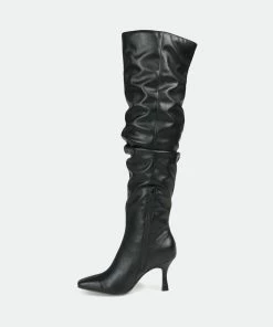 Boots that leave an impression, the Kindy by Journee Collection. This extra-wide calf boot features slouchy details that rise to the knees and soft vegan leather uppers. An hourglass-shaped heel adds a sophisticated finish, and a 4 mm Tru Comfort Foam™ footbed offers the perfect amount of cushion to your step.Heel Height: 3 1/4-inch. Heel Type: Heel. Platform Height: Flat-inch. Shaft Height: 18 1/2 inches. Calf Circumference: 16 inches. Top Circumference: 18 inches. Shoe Width: Medium. Closure Type: Inside Zip. Toe Style: Square. Lining: Fabric. Upper Material: Vegan Leather. Outersole Material: Man-made. Footbed: 4 MM Tru Comfort Foam™. All measurements are approximate and were taken using a size 6. Please note measurements may vary slightly by size.