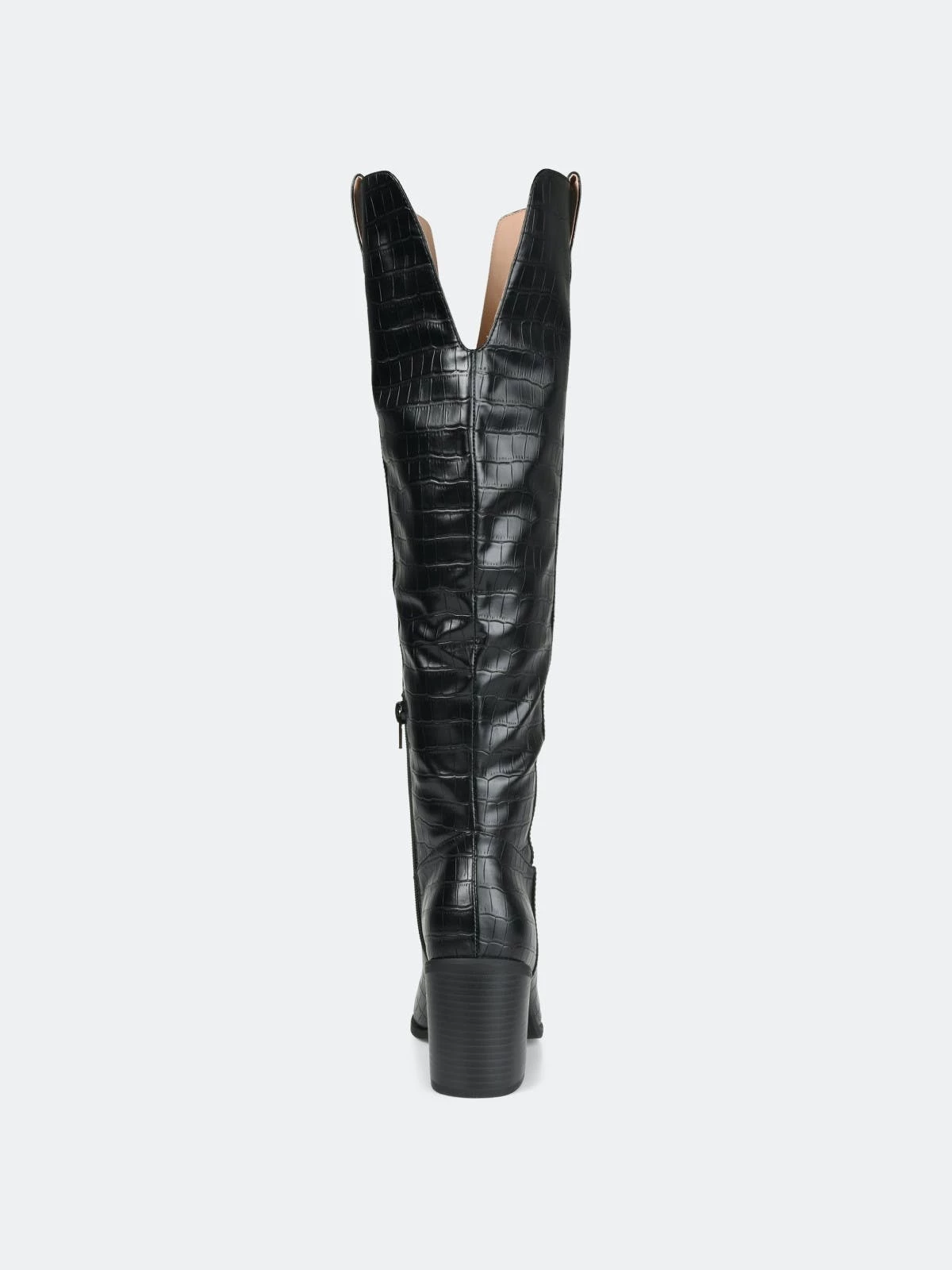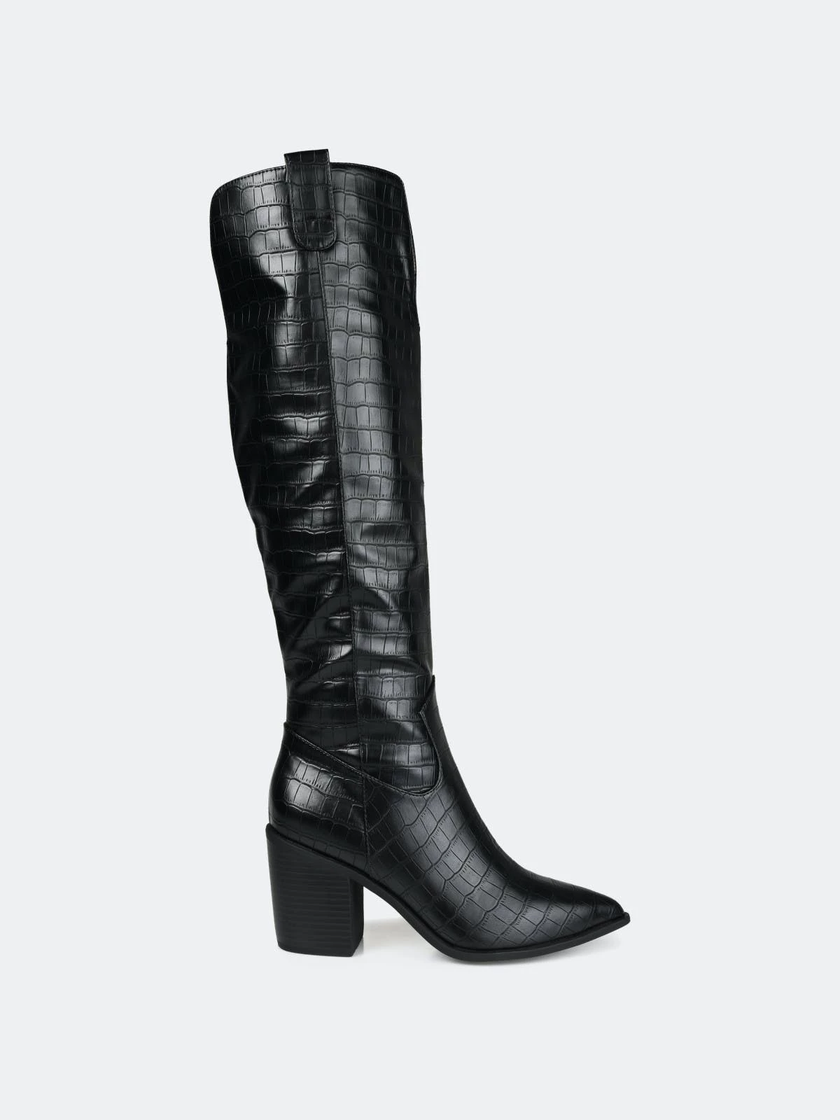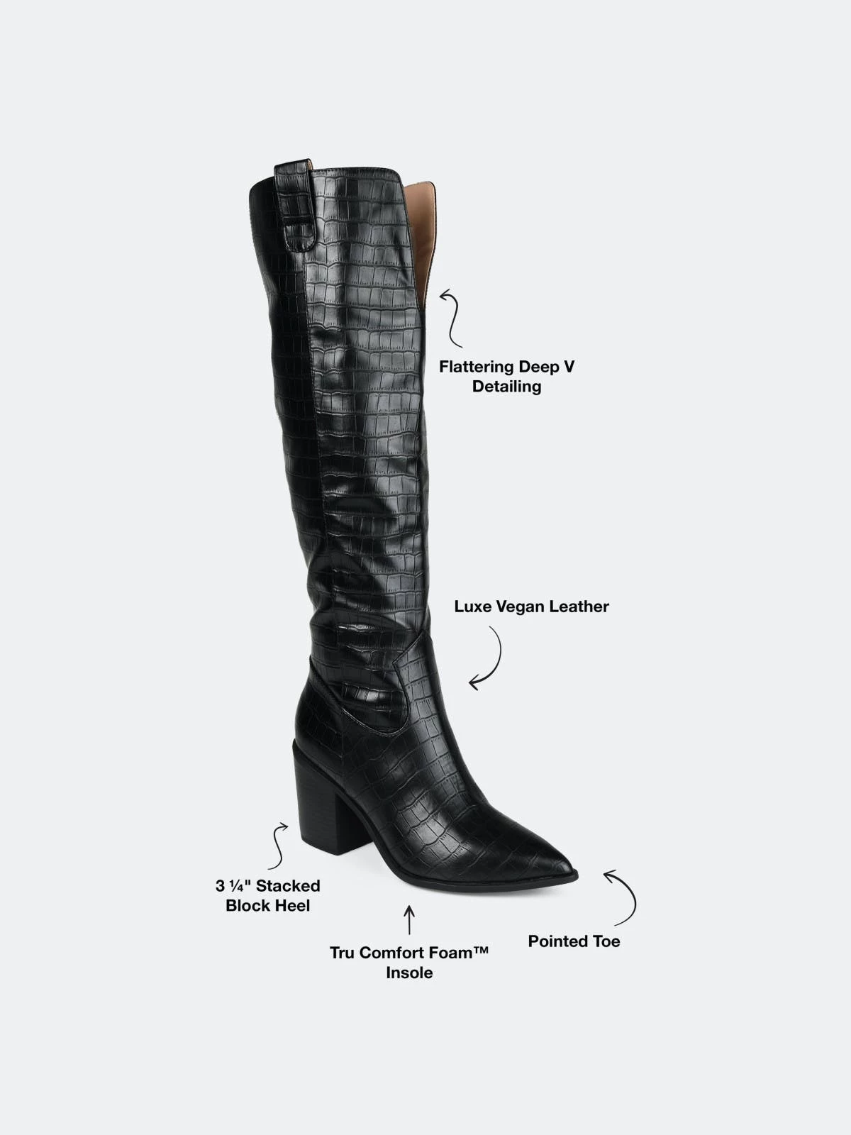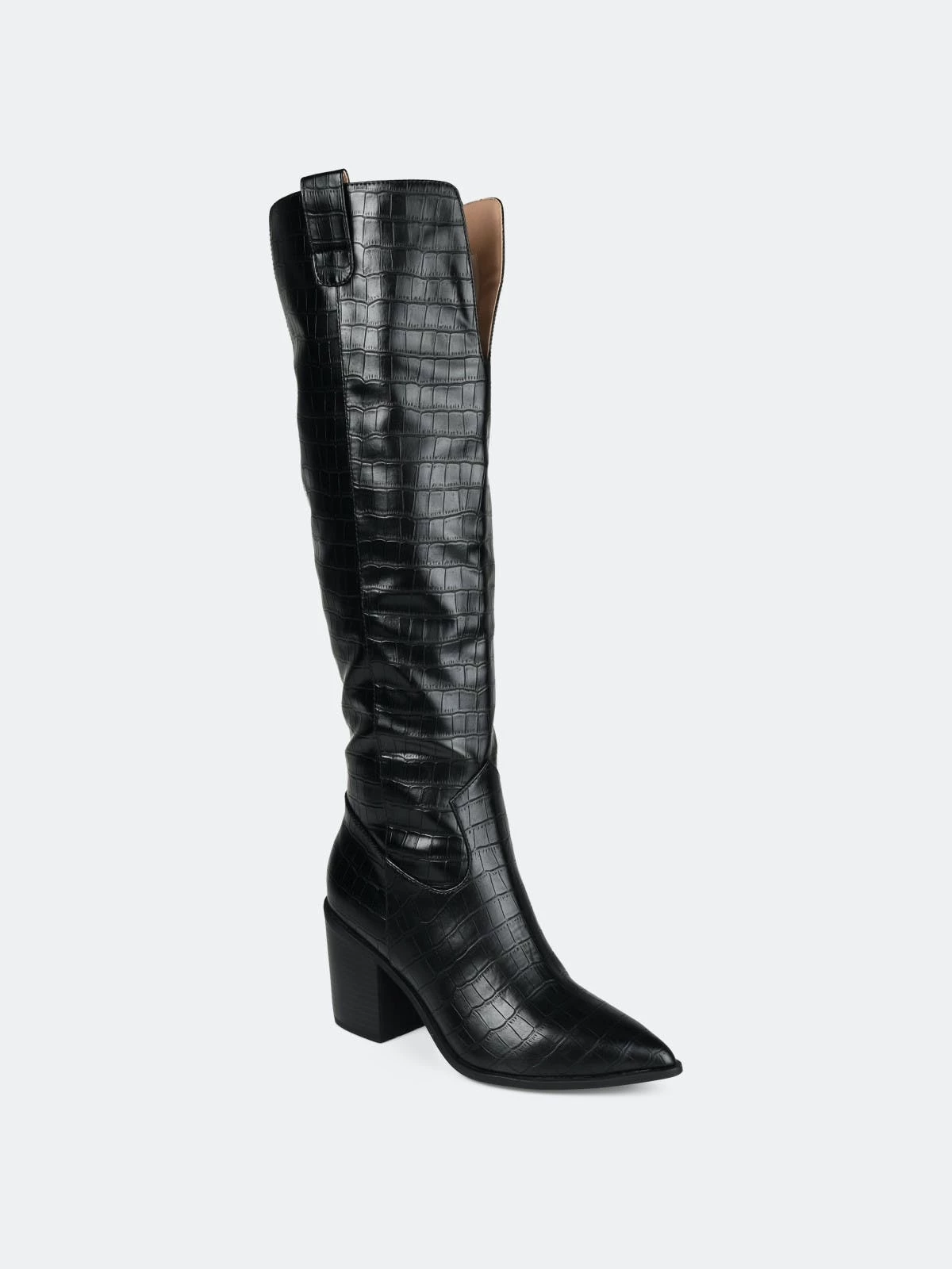 Bustling city vibes and country comfort combine with the Therese boot by Journee Collection. Croc textured vegan leather and a stacked block heel detail this knee-high boot for a fresh look. This rodeo-inspired design features a 4 mm Tru Comfort Foam™ insole and an extra-wide calf for comfortable wear.Heel Height: 3 1/4-inch. Heel Type: Stacked. Platform Height: Flat-inch. Shaft Height: 16 1/2 inches. Calf Circumference: 16 inches. Top Circumference: 16 1/2 inches. Shoe Width: Medium. Closure Type: Inside Zip. Toe Style: Pointed. Lining: Fabric. Upper Material: Vegan Leather. Outersole Material: Man-made. Footbed: 4 MM Tru Comfort Foam™. All measurements are approximate and were taken using a size 6. Please note measurements may vary slightly by size.