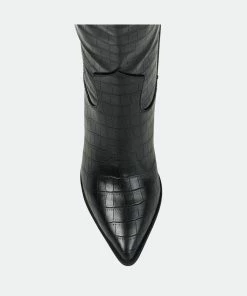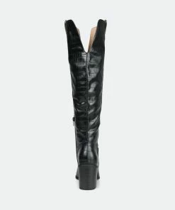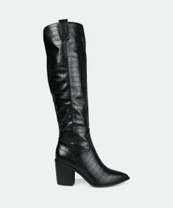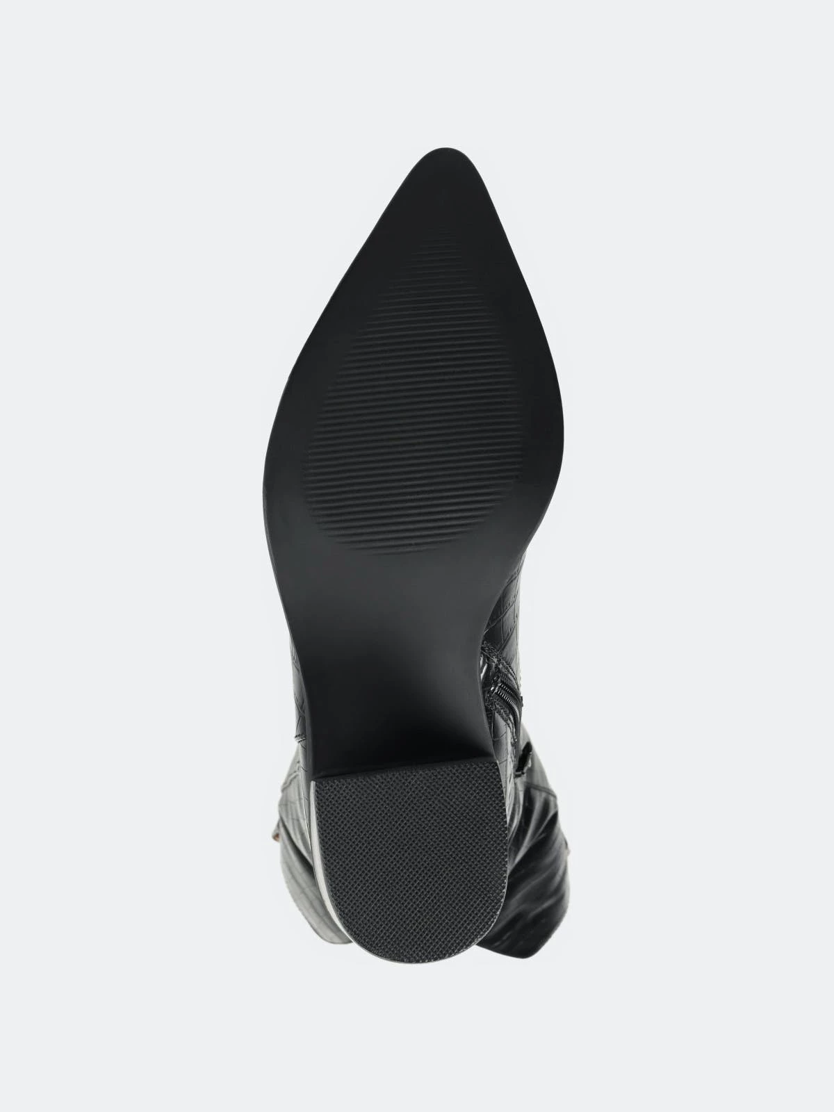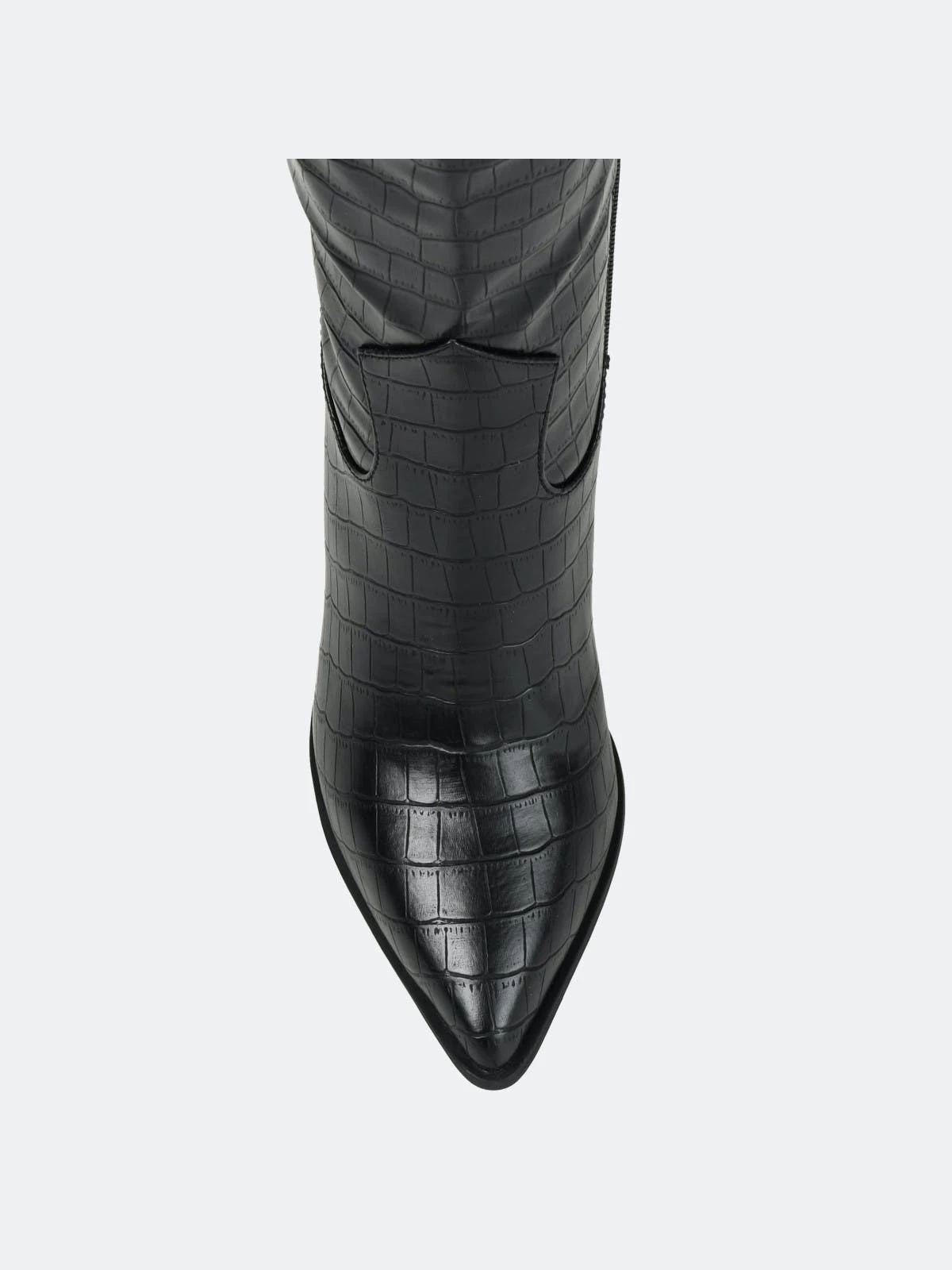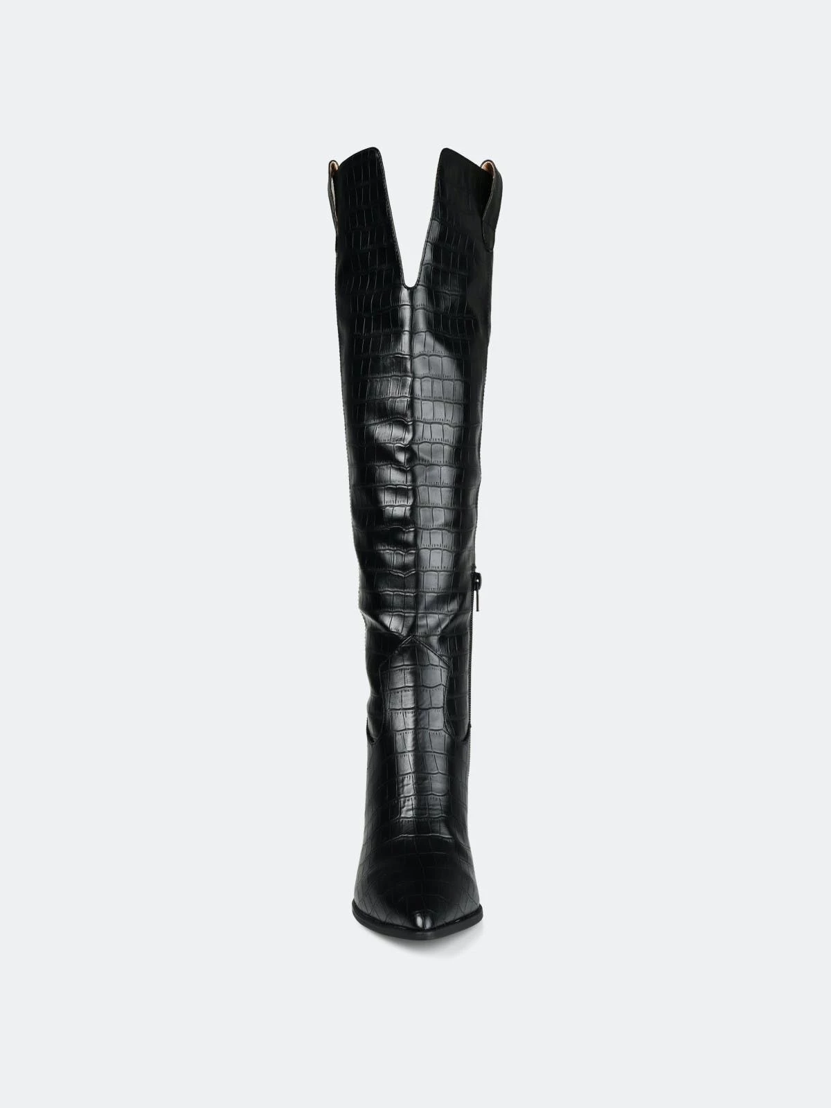 Bustling city vibes and country comfort combine with the Therese boot by Journee Collection. Croc textured vegan leather and a stacked block heel detail this knee-high boot for a fresh look. This rodeo-inspired design features a 4 mm Tru Comfort Foam™ insole and an extra-wide calf for comfortable wear.Heel Height: 3 1/4-inch. Heel Type: Stacked. Platform Height: Flat-inch. Shaft Height: 16 1/2 inches. Calf Circumference: 16 inches. Top Circumference: 16 1/2 inches. Shoe Width: Medium. Closure Type: Inside Zip. Toe Style: Pointed. Lining: Fabric. Upper Material: Vegan Leather. Outersole Material: Man-made. Footbed: 4 MM Tru Comfort Foam™. All measurements are approximate and were taken using a size 6. Please note measurements may vary slightly by size.