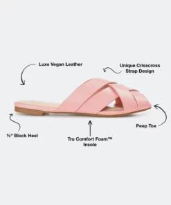 The Haize by Journee Collection is sleek and subtle. These slides achieve the right combination of modern and classic with their peep toe and open crisscrossed details. This light sandal is finished with vegan leather straps and a 4 mm Tru Comfort Foam™ footbed.Heel Height:1/2-inchHeel Type: Block Heel Platform Height:Flat-inchShoe Width: MediumClosure Type: Slip-onStrap Type: Multi -StrapToe Style: OpenLining: Faux LeatherUpper Material: Vegan LeatherOutersole Material: Man-madeFootbed: 4 MM Tru Comfort Foam™All measurements are approximate and were taken using a size 6. Please note measurements may vary slightly by size.