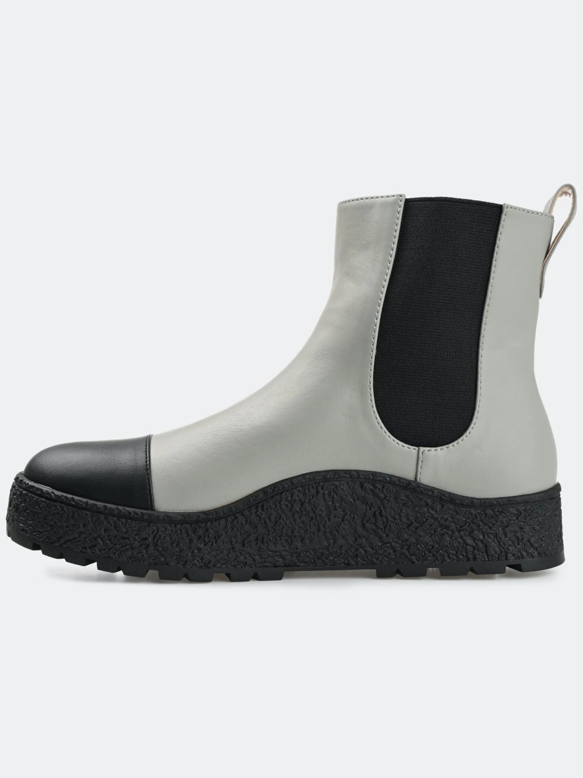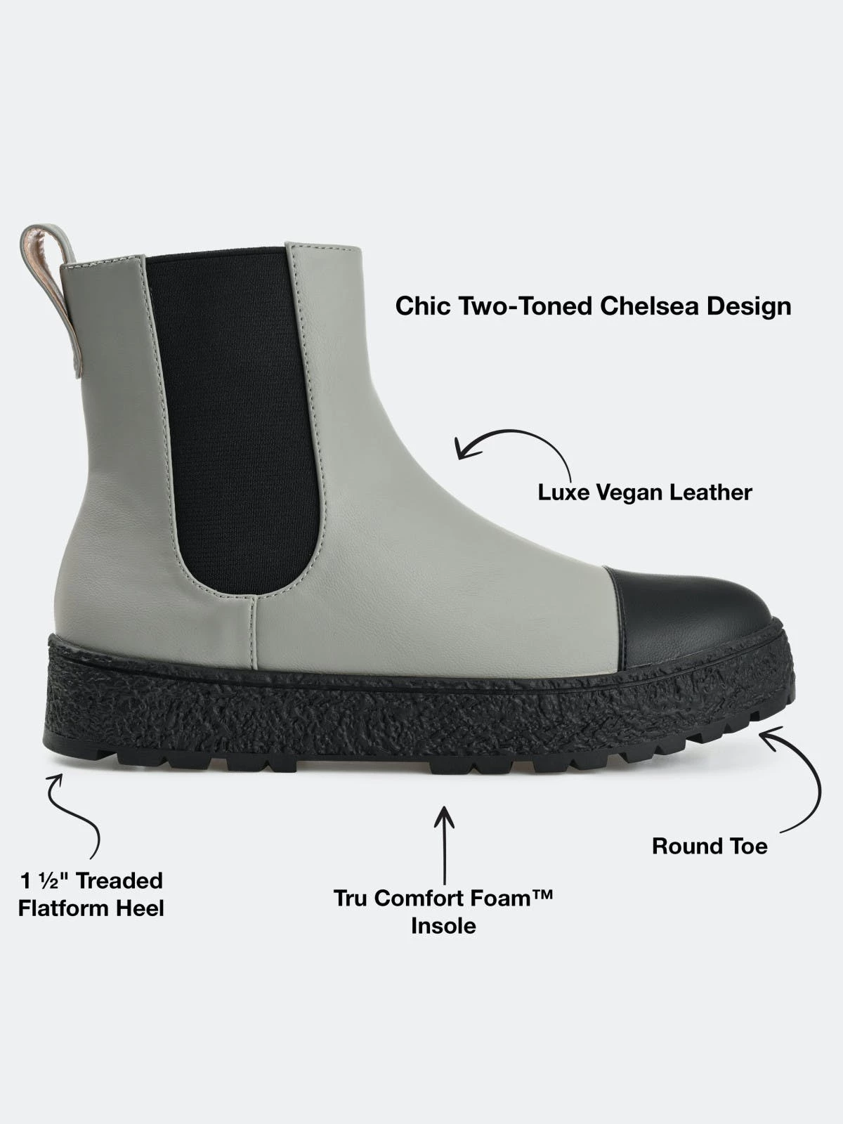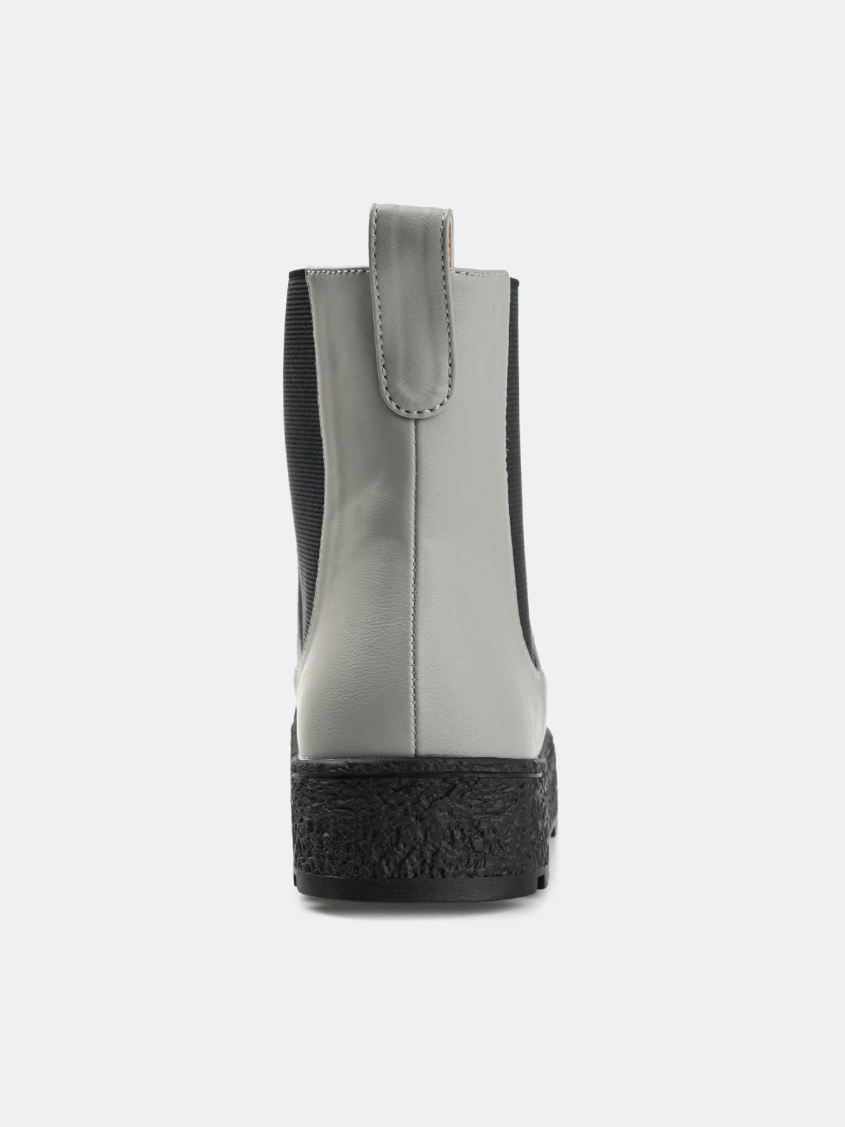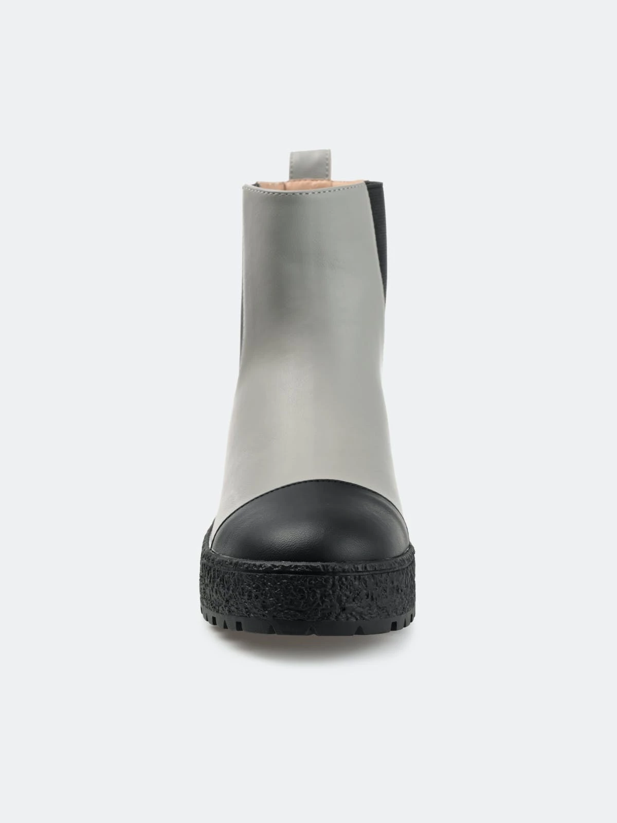 Boldy finish any look with the Jenie by Journee Collection. With a chunky treaded outsole and two-tone details, this high-top Chelsea bootie adds a contemporary finish to any outfit. A super-soft 4 mm Tru Comfort Foam™ footbed and stretch gore panels make them comfy and easy to pull on at a moment’s notice.Heel Height:1 1/2-inchHeel Type: Sole Platform Height:1 1/4-inchShaft Height:5 inchesTop Circumference:10 1/2 inchesShoe Width: MediumClosure Type: Pull-onToe Style: RoundLining: FabricUpper Material: Vegan LeatherOutersole Material: Man-madeFootbed: 4 MM Tru Comfort Foam™All measurements are approximate and were taken using a size 6. Please note measurements may vary slightly by size.