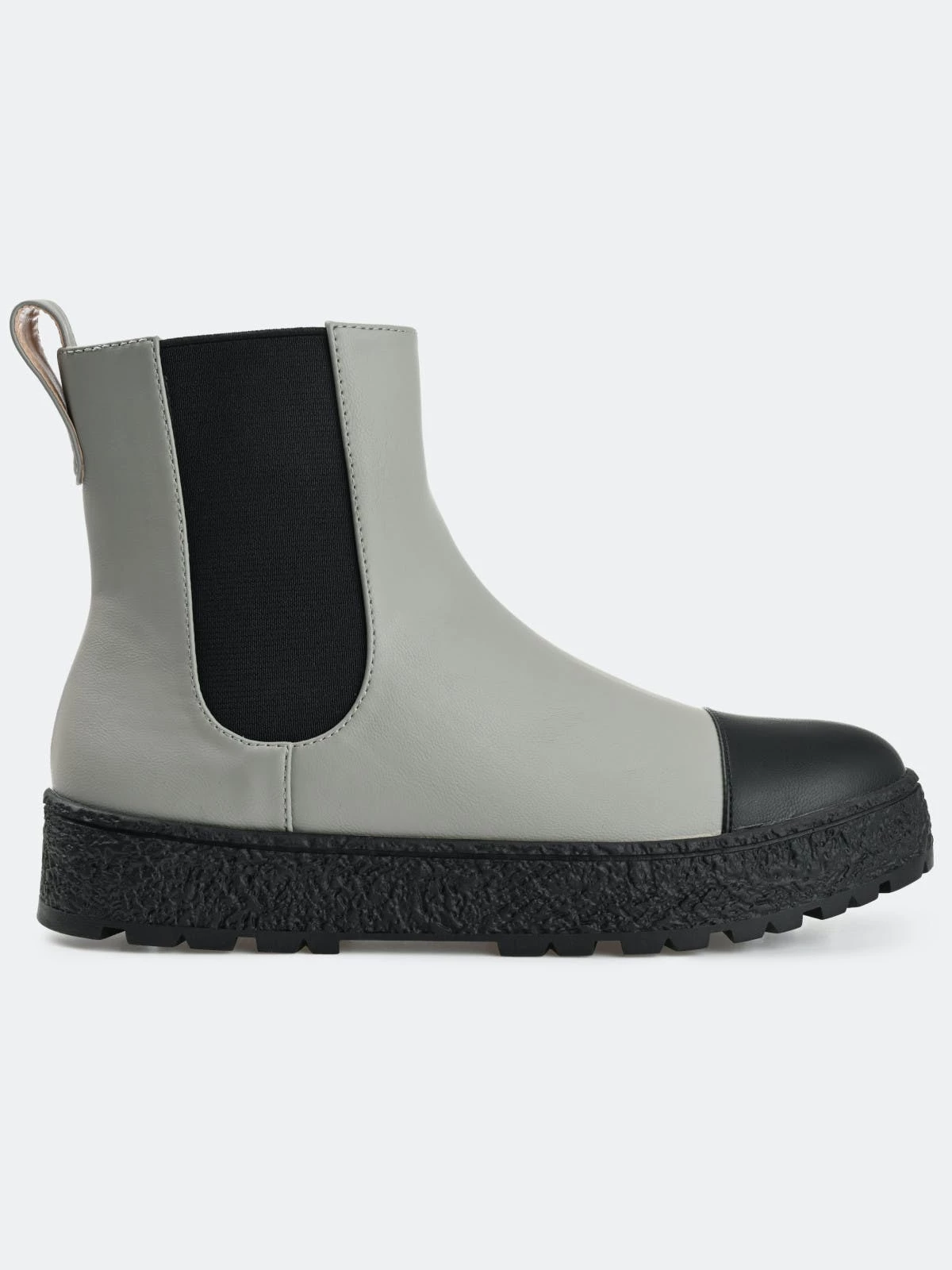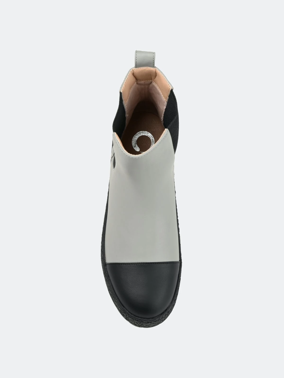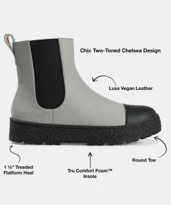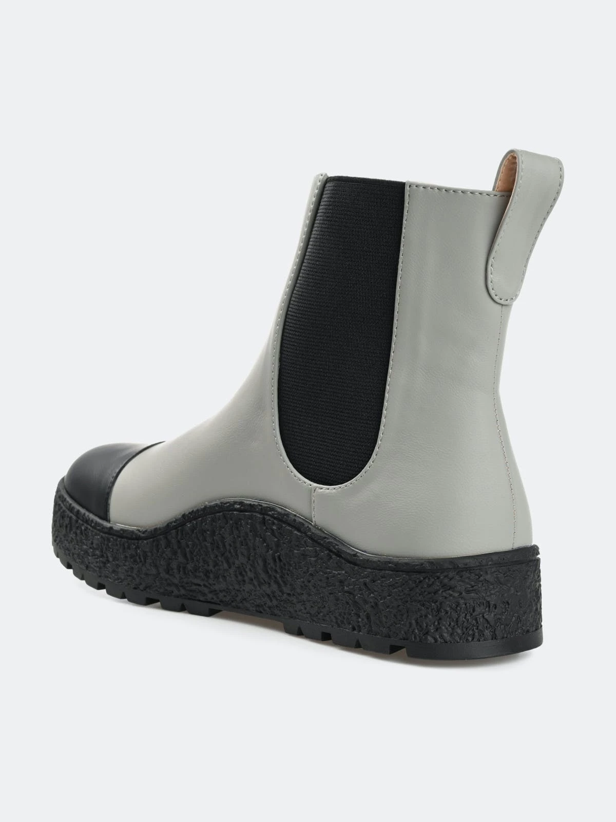 Boldy finish any look with the Jenie by Journee Collection. With a chunky treaded outsole and two-tone details, this high-top Chelsea bootie adds a contemporary finish to any outfit. A super-soft 4 mm Tru Comfort Foam™ footbed and stretch gore panels make them comfy and easy to pull on at a moment’s notice.Heel Height:1 1/2-inchHeel Type: Sole Platform Height:1 1/4-inchShaft Height:5 inchesTop Circumference:10 1/2 inchesShoe Width: MediumClosure Type: Pull-onToe Style: RoundLining: FabricUpper Material: Vegan LeatherOutersole Material: Man-madeFootbed: 4 MM Tru Comfort Foam™All measurements are approximate and were taken using a size 6. Please note measurements may vary slightly by size.