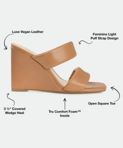 No matter what your plans are, the Kailee heels by Journee Collection will make them a little bit more fabulous. You’ll find yourself wearing them everywhere because they fit so comfortably with soft vegan leather uppers and a 4 mm Tru Comfort Foam™ insole. The double strap detail and covered wedge heel add a flattering finish.Heel Height:4-inchHeel Type: Wedge Platform Height:Flat-inchShoe Width: MediumClosure Type: Slip-onStrap Type: Multi -StrapToe Style: OpenLining: Faux LeatherUpper Material: Vegan LeatherOutersole Material: Man-madeFootbed: 4 MM Tru Comfort Foam™All measurements are approximate and were taken using a size 6. Please note measurements may vary slightly by size.