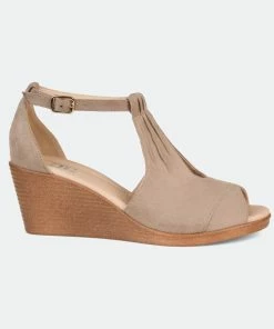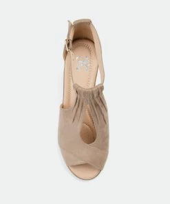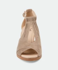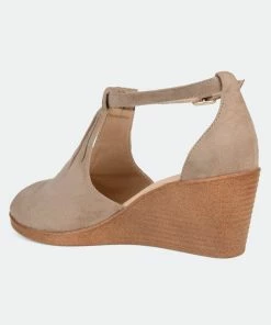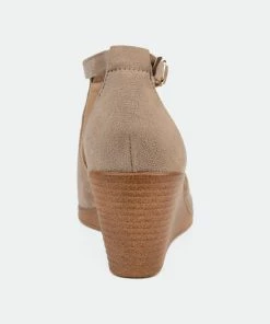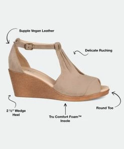 Look effortlessly chic in the lightweight, comfort-sole wedges from Journee Collection. The faux suede uppers display a keyhole cut-out on the vamps and ruched detail that connects to buckled ankle straps. Open-toes and faux wood stacked wedge heels with a light feel finish the lookHeel Height:2 1/2-inchHeel Type: Wedge Platform Height:1/2-inchShoe Width: MediumClosure Type: BuckleStrap Type: AnkleToe Style: OpenLining: Faux LeatherUpper Material: Faux SuedeOutersole Material: Man-madeFootbed: 4 MM Tru Comfort Foam™All measurements are approximate and were taken using a size 6. Please note measurements may vary slightly by size.