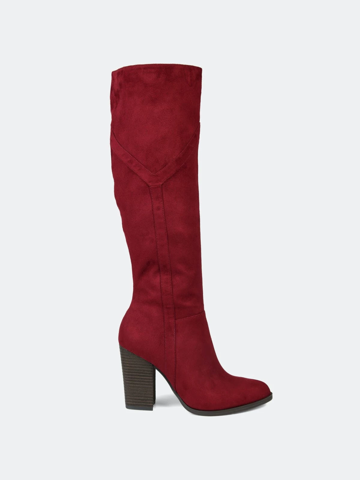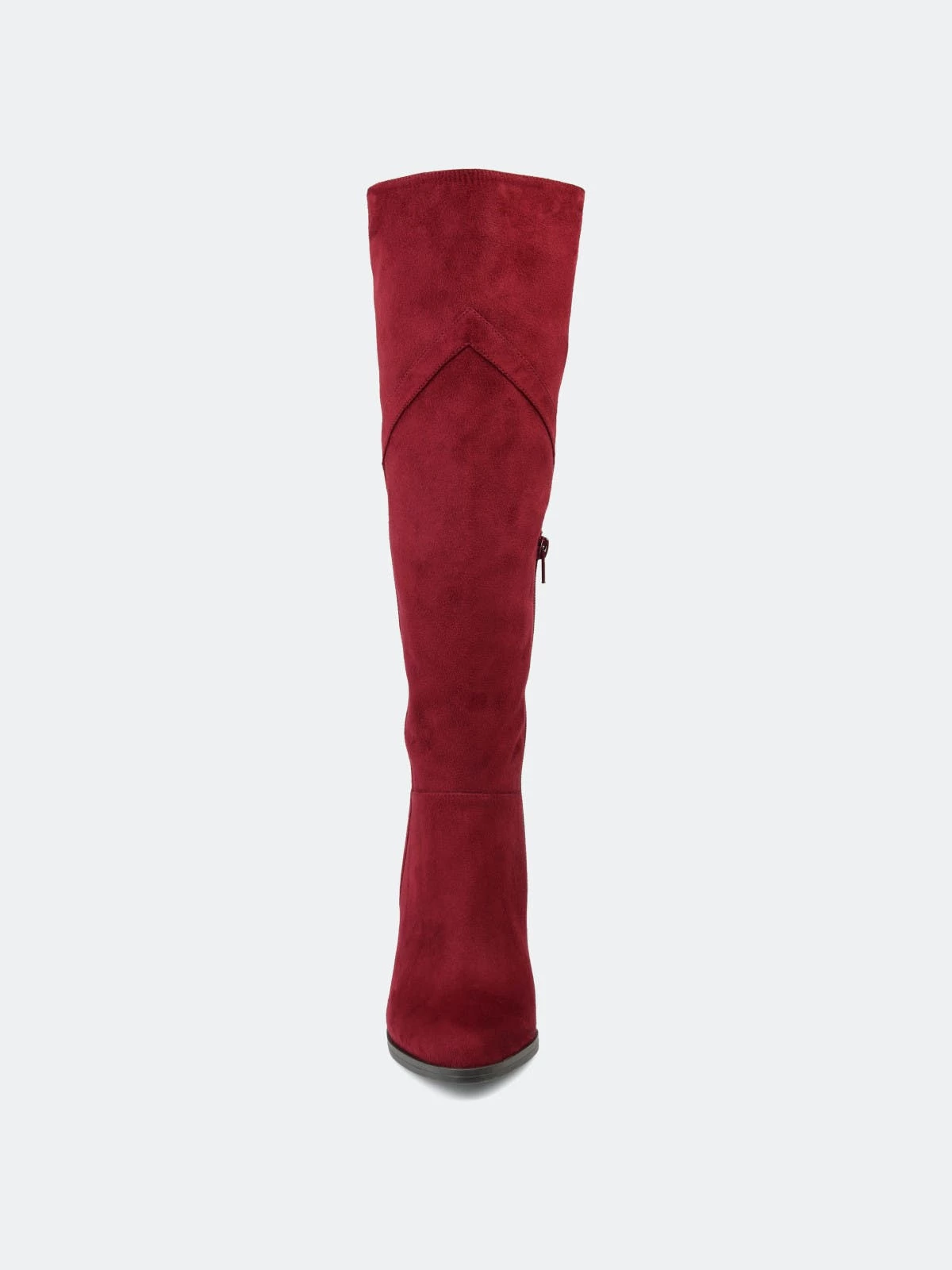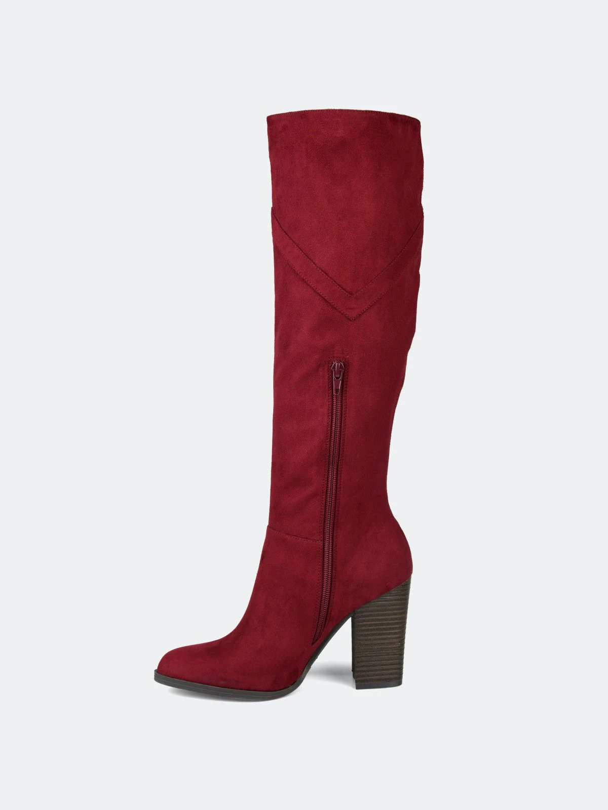 The Kyllie boot is extravagant and perfect for your fall and winter events. This boot features a soft faux suede material, an almond toe, and a tall chunky heel. The inside zipper helps with ease of access, and the knee-high design is slimming and fitted. The unique decorate detail on the outside of the boot creates a beautiful refreshing design.Heel Height: 3 3/4-inch. Heel Type: Stacked. Platform Height: 1/2-inch. Shaft Height: 15 1/2 inches. Calf Circumference: 14 1/2 inches. Top Circumference: 15 inches. Shoe Width: Medium. Closure Type: Inside Zip. Toe Style: Almond. Lining: Faux Fur. Upper Material: Faux Suede. Outersole Material: Man-made. Footbed: 4 MM Tru Comfort Foam™. All measurements are approximate and were taken using a size 6. Please note measurements may vary slightly by size.