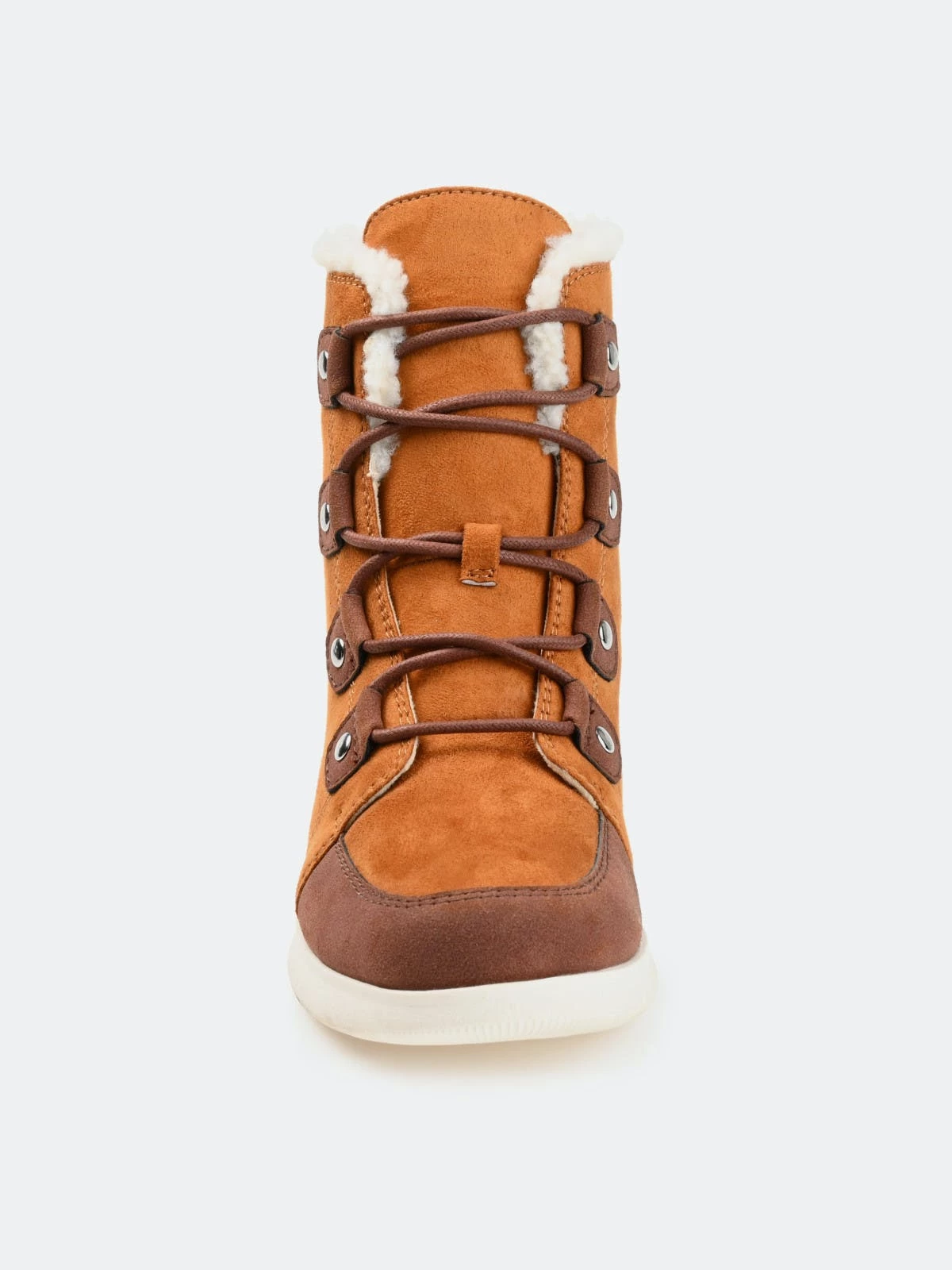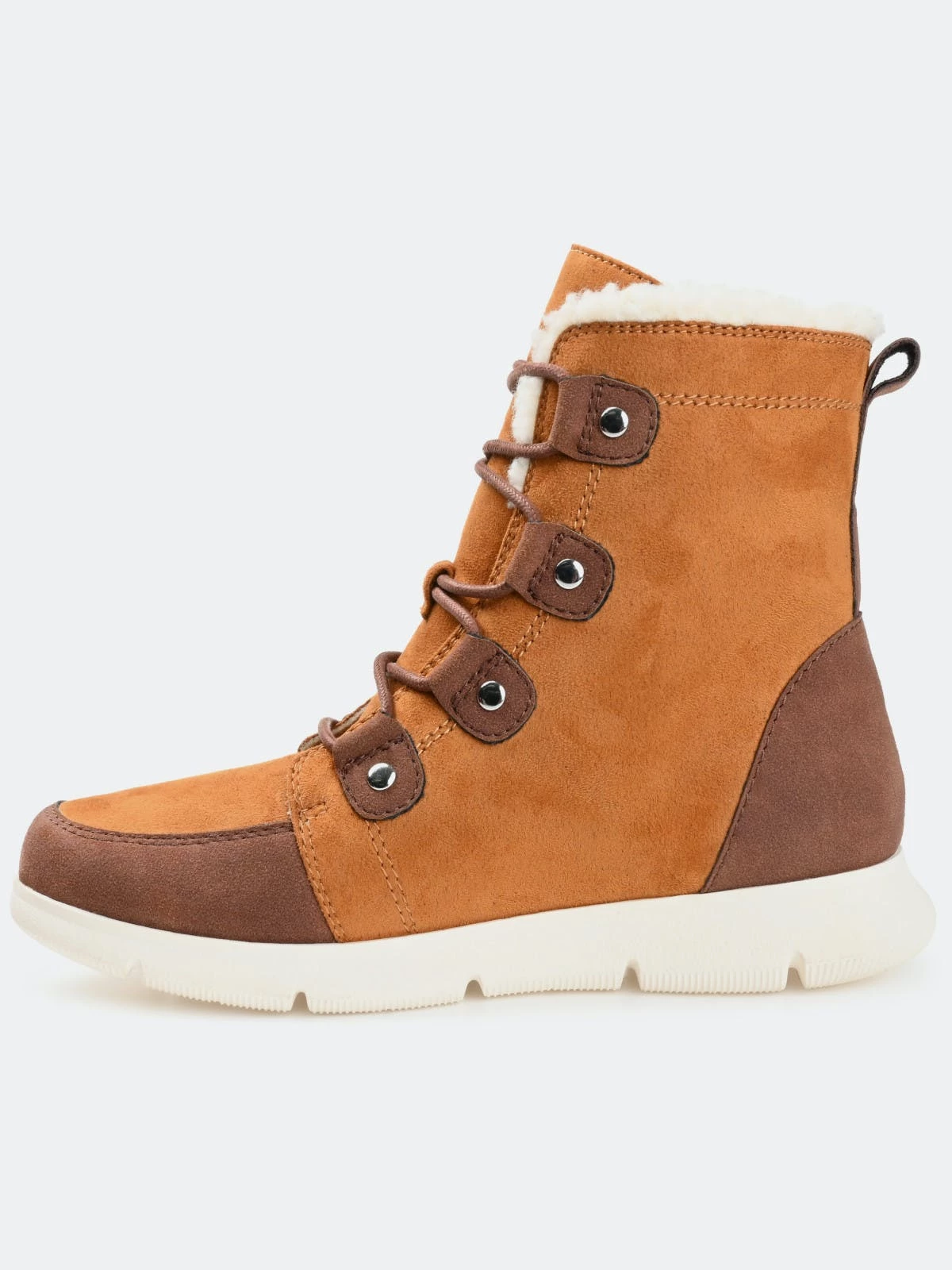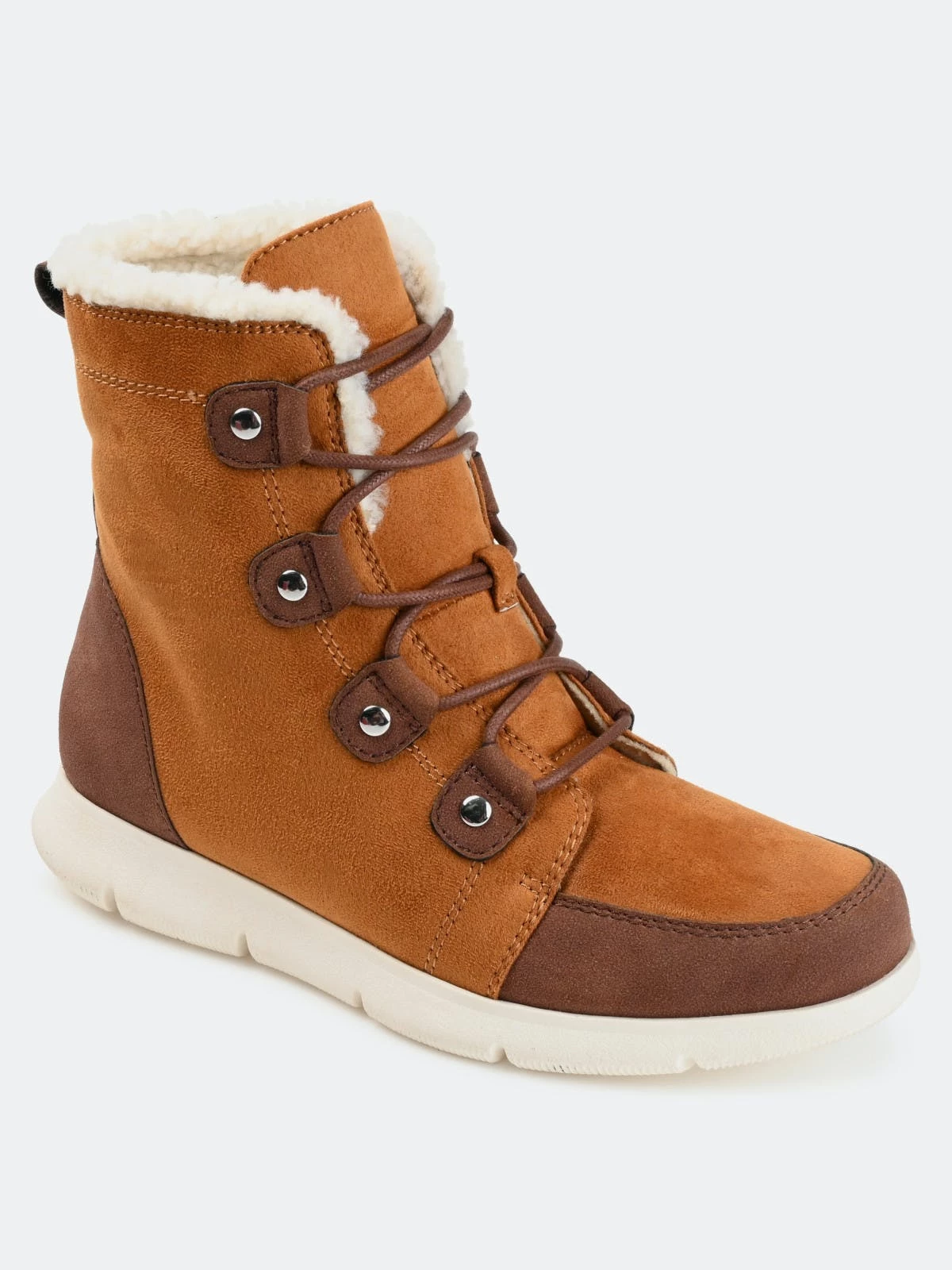 You’ll be set for the colder seasons with the Laynee boot by Journee Collection. This cozy winter style features supple vegan leather uppers lined with warm teddy bear fur. Two-toned details with a classic lace-up closure top the look, and a treaded sole paired with the softest 4 mm Tru Comfort Foam™ footbed completes the design.Heel Height: 1-inch. Heel Type: Sole. Platform Height: 1/2-inch. Shaft Height: 5 1/2 inches. Top Circumference: 11 inches. Shoe Width: Medium. Closure Type: Lace-up. Toe Style: Round. Lining: Faux Fur. Upper Material: Vegan Leather. Outersole Material: Man-made. Footbed: 4 MM Tru Comfort Foam™. All measurements are approximate and were taken using a size 6. Please note measurements may vary slightly by size.