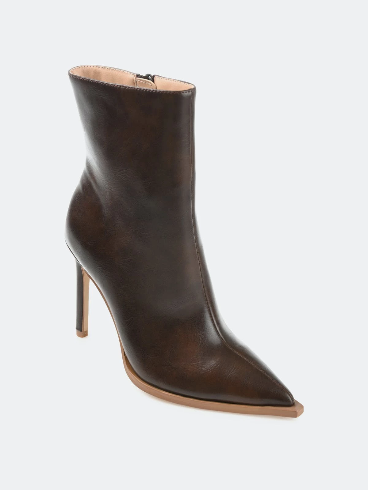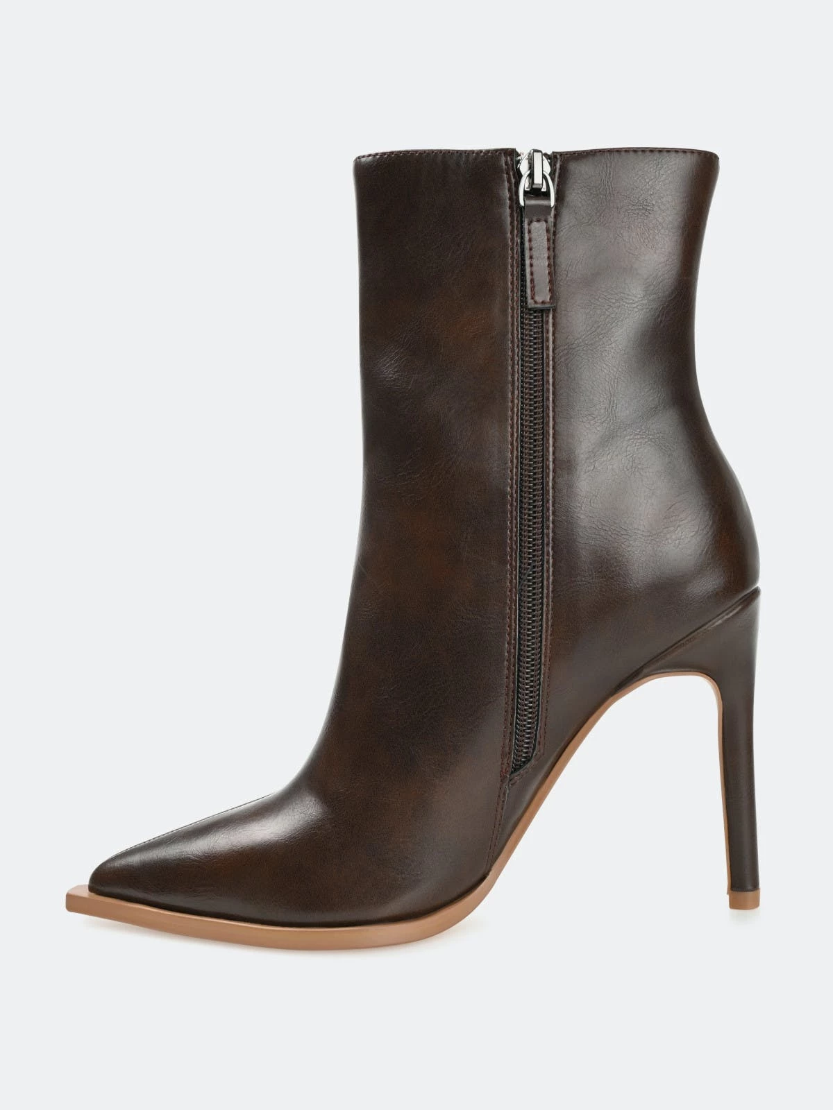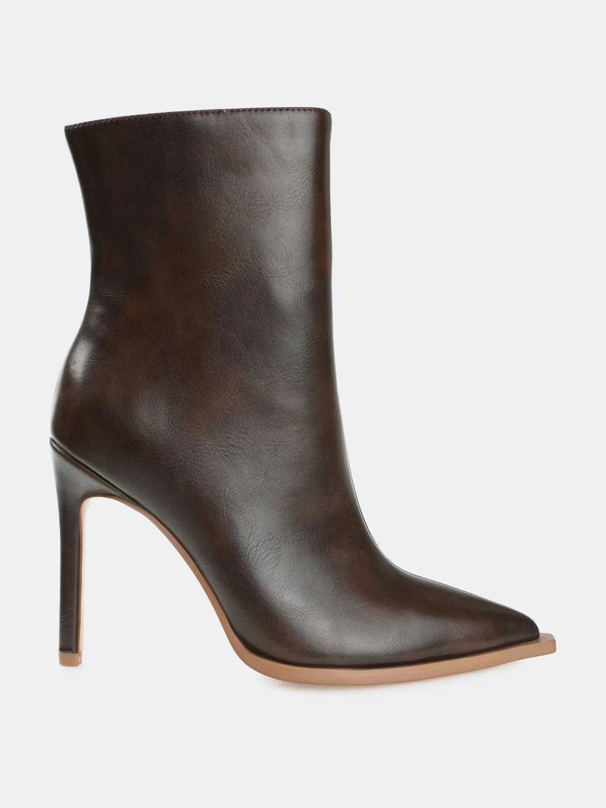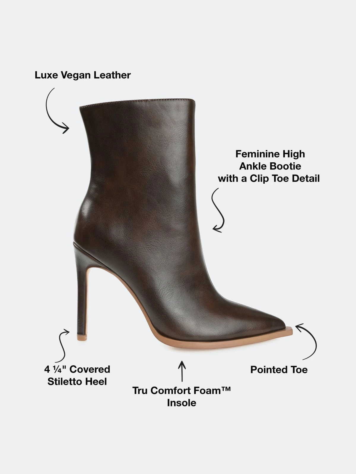 The stunning beauty you need for the season the Limma bootie by Journee Collection. This flattering vegan leather stiletto offers a sultry look with its pointed-toe and a high-ankle silhouette. A zipper entry and 4 mm Tru Comfort Foam™ insole make this look easy to slip on and stand-in.Heel Height:4 1/4-inchHeel Type: Stiletto Platform Height:Flat-inchShaft Height:5 1/2 inchesTop Circumference:10 1/2 inchesShoe Width: MediumClosure Type: Inside ZipToe Style: PointedLining: Man-madeUpper Material: Vegan LeatherOutersole Material: Man-madeFootbed: 4 MM Tru Comfort Foam™All measurements are approximate and were taken using a size 6. Please note measurements may vary slightly by size.
