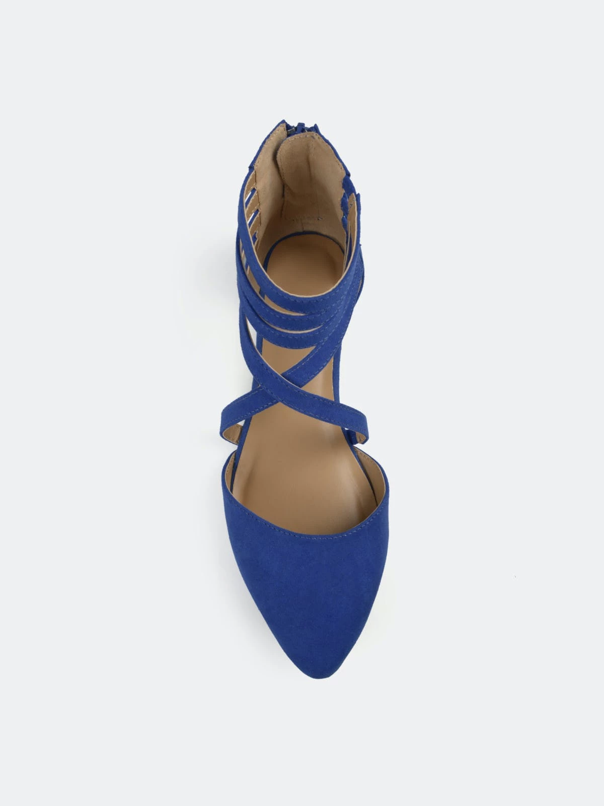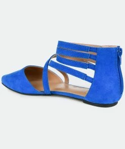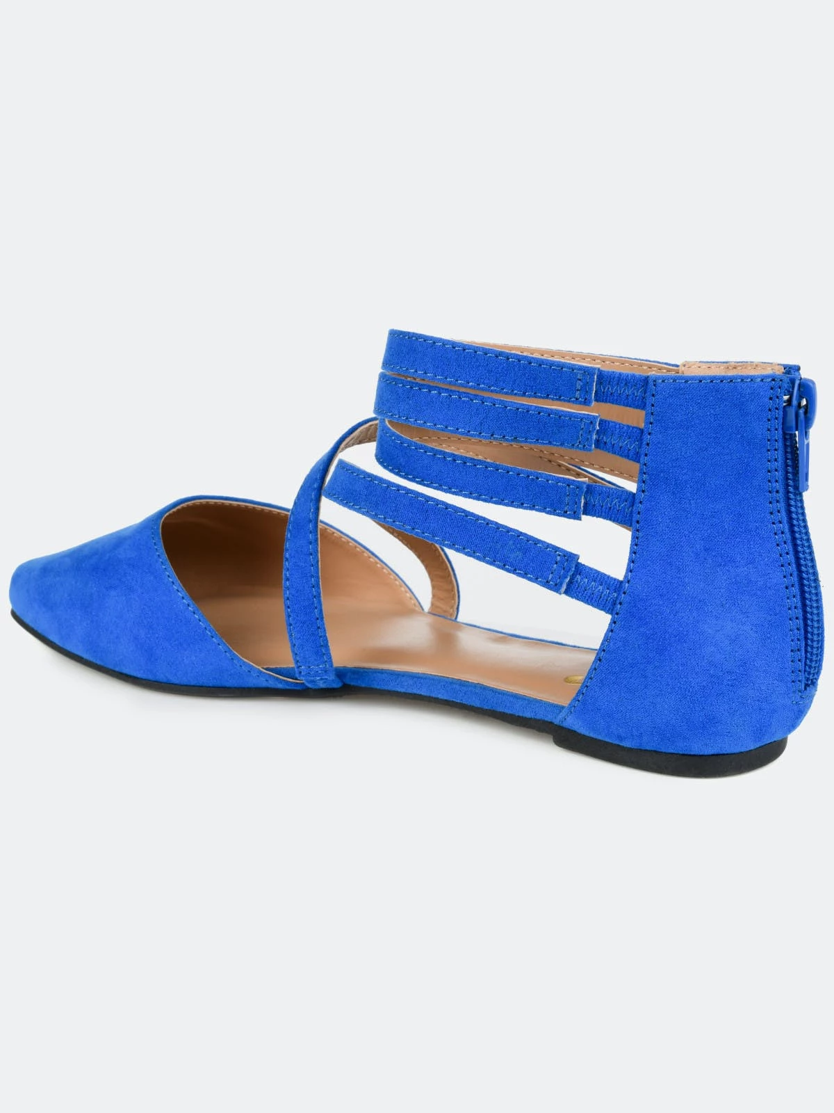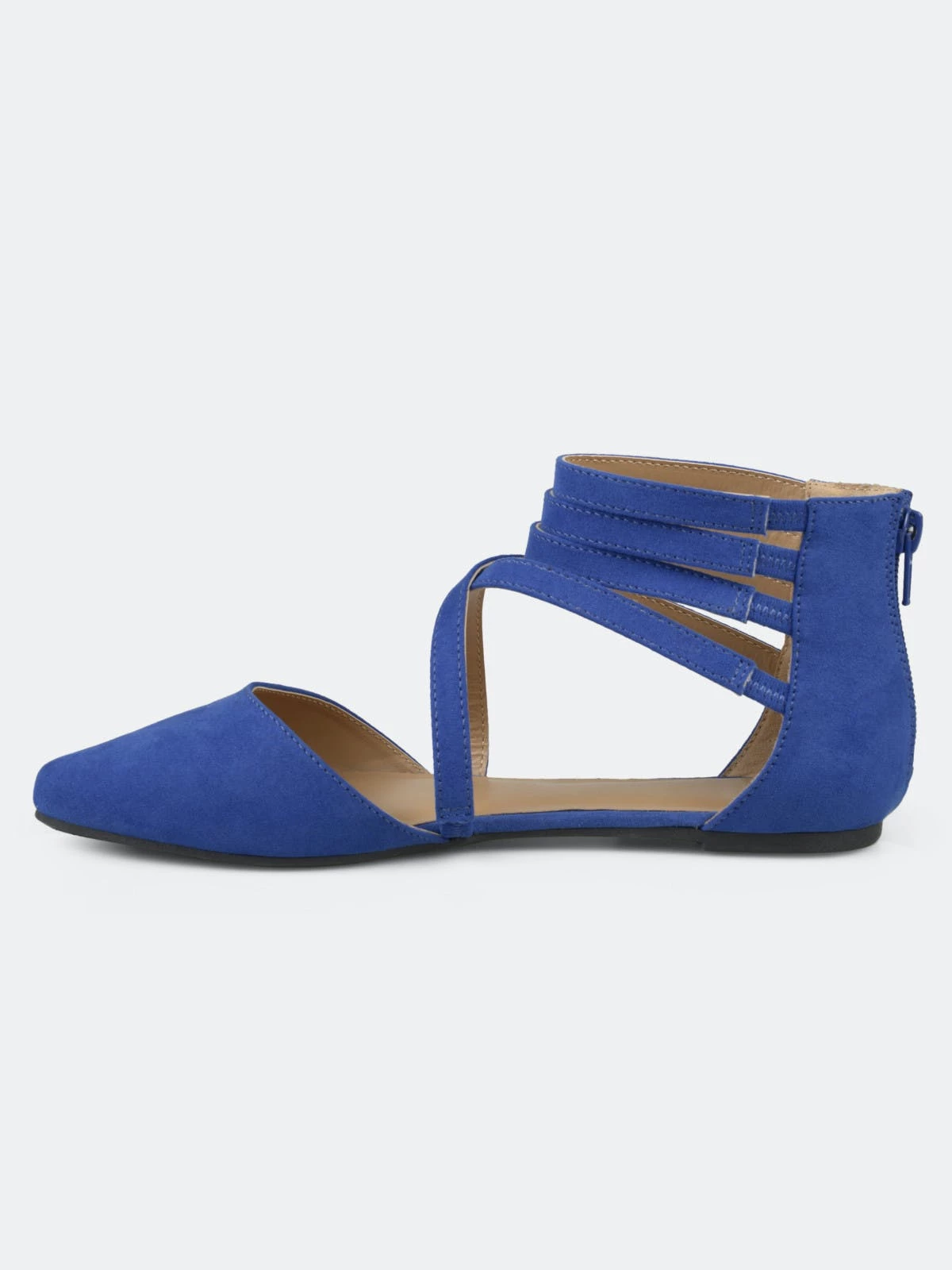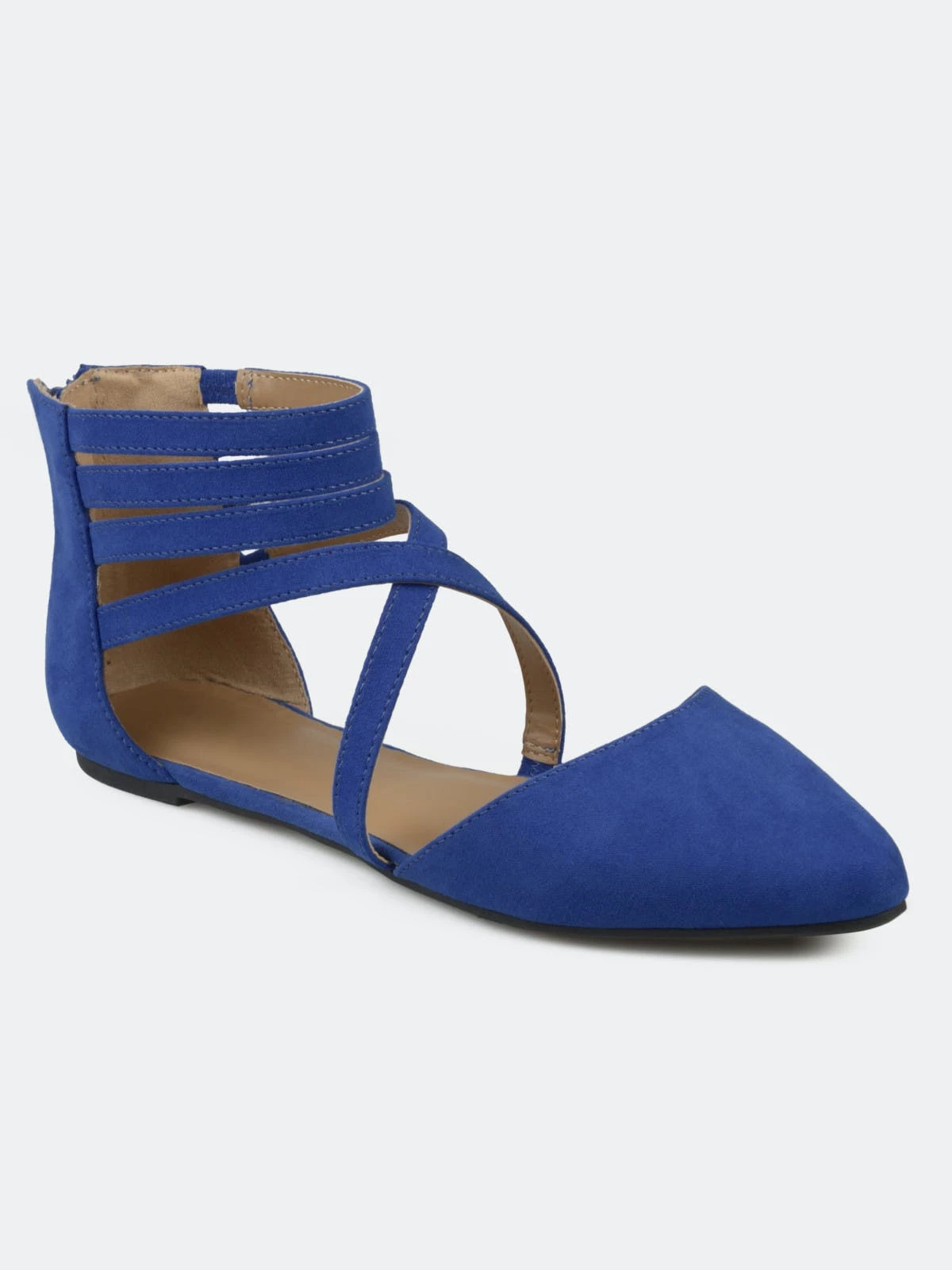 Step into stylish design with ankle wrap strap flats by Journee Collection. These chic flat shoes feature faux suede uppers with a strappy style that wraps up the ankles. A pointed-toe design and closed back heels with zipper accents finish the look.FlatHeel Type: Sole Platform Height:1/2-inchShoe Width: MediumClosure Type: Back Heel ZipToe Style: PointedLining: Faux LeatherUpper Material: Faux SuedeOutersole Material: Man-madeFootbed: 4 MM Tru Comfort Foam™All measurements are approximate and were taken using a size 6. Please note measurements may vary slightly by size.