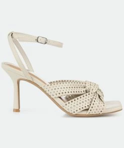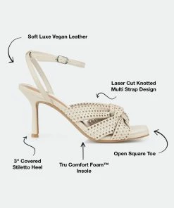 Stand tall in the Naommi stilettos by Journee Collection. These sky-high heels boast soft vegan leather and a 4 mm Tru Comfort Foam™ insole. A knotted detail at the toe and laser-cut pinholes throughout give this summery look a modern twist.Heel Height:3-inchHeel Type: Stiletto Platform Height:Flat-inchShoe Width: MediumClosure Type: BuckleStrap Type: AnkleToe Style: OpenLining: Faux LeatherUpper Material: Vegan LeatherOutersole Material: Man-madeFootbed: 4 MM Tru Comfort Foam™All measurements are approximate and were taken using a size 6. Please note measurements may vary slightly by size.